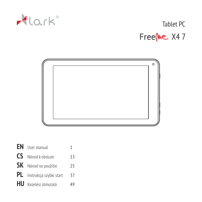 Tablet PC X4 7 EN CS SK PL HU User manual 1 Návod k obsluze 13 Návod na použitie 25 Instrukcja szybki start 37 Kezelési útmutató 49 Before you begin Thank you for choosing Lark FreeMe X4 7 tablet . We wish you many satisfaction from its use. Tablet PC is a multi-functional device, which can be used for work and education and for entertainment as well. Thanks to the tablet you have the Internet always in your reach, without need of bulky personal computers of previous generation. Android 4.4 KitKat and Google Play enable access to plenty of useful applications, for both business and entertainment purposes. Clear and intuitive interface gives you the pleasure of dailyuse of the tablet. Please read the user guide and keep it for further reference.The user guide contains important information regarding safe and effective use of the tablet. The producer mayintroduce changes in the device and the user guide. Please refer to the www.lark.com.pl website in case of questions or doubts concerning use of the device. 1 Before you begin Safetyand handling Prevent your tablet and accessories from getting wet. Getting electrical equipment wet not only causes serious damage, but it is also a threat to the user (risk of electric shock). Protect your device against shocks, falls and vibrations. Protect the device from high and low temperatures. Do not drop, bend, puncture, insert foreign objects, or place heavyobjects on your tablet. Do not use unauthorized accessories, as the maydamage the tablet and void manufacturer's warranty. Important safetyinstructions Be sure to follow instructions bellow. Make sure that theyare known to all users of your tablet, including children.. Never use your tablet while driving. Hospitals and other medical facilities may be prohibited from using electronic devices, including tablets. Always follow these restrictions. Turn off the tablet in the plane for the whole flight or during take-off and landing, according to the instructions given bythe aircraft personnel. Switch off the device near important electronic devices, which could be disrupted bypossible interference. Do not attempt to disassemble, modifyor repair the tablet. Always entrust these tasks to authorized specialist. Protect your tablet from strong magnetic fields.These fields can damage magnetic storage media. Do not use the tablet in veryhigh temperatures or in areas at high risk of fire or explosion, such as petrol stations. 2 Before you begin Supervise the use of the device bychildren, do not let them playwith the tablet unattended. Prevent the tablet from getting wet, for instance do not use or store it in the bathroom. The symbol to the left means that according to European Union laws and regulations your product and/or its battery shall be disposed of separately from household waste. When this product reaches its end of life, take it to a collection point designated by local authorities. The separate collection and recycling of your product and/or its battery at the time of disposal will help conserve natural resources and ensure that it is recycled in a manner that protects human health and the environment. 3 Product overview Parts and buttons of the device 2 1 1. Touch screen 2. Front camera 4 Product overview 3 6 7 8 9 10 5 4 3. Speaker 7. 4. RESET button 8. Micro USB port 5. MicroSD card slot 9. Power adapter port 6. Power ON/OFF button 10. Volume up / Volume down 5 Earphone jack Getting started Battery charging Please charge the battery before first use. 1. Connect Table to the AC charger, and the charger to AC power outlet. 2. Check charging lights. Red light means that device is charging, green that the charge has been completed. ATTENTION! The battery will fully charge in around 4 hours. Using the device during charging will make charging process longer. Disconnect the ac charger from your tablet when the battery power is full or when you wish to stop the charging. You can only use identical battery as a replacement. Physical damages to the battery may cause a fire or electric shock. 6 Using your tablet Buttons functions Power button - press and hold for a few seconds to turn on the device Volume UP - press and hold Volume Up button to increase the volume Volume Down - press and hold Volume Down button to decrease the volume Powering on/off the device Turning on After pressing and holding the ON/OFF button for 2 seconds the start screen will appear. Turning off To turn off the device press and hold the ON/OFF button for 2 seconds. Locking the screen To unlock the screen swipe the lock icon upwards 7 Using your tablet Multi-touch screen Never before have the use of an electronic device was so easy and natural. The screen responds to even gentle brush, understand a few fingers touch applied simultaneously, eg. 'pinching' shrink the image, and spreading the fingers apart-expand it. You can rotate the image with two fingers, like a piece of paper on the table. The capacitive touch screen is also indispensable for gaming use. Using the multitouch screen Tap gently on the screen with your fingertip to launch an application, select an item, open a menu, or type text using the onscreen keyboard. Touch The device is operated by touching appropriate place on the screen. Swipe or slide Move your finger in a vertical or horizontal direction on the screen to scroll through the content. Drag Touch, hold and drag an item to the desired position. Rotate the screen The tablet has a built-in motion sensor that supports the screen auto-rotation feature. By default, this feature is enabled. When you rotate the tablet, the screen automatically rotates to landscape or portrait view which is very convenient during internet browsing, watching the movies, pictures, etc. Navigating through the screens Home screen surface is greater than the display surface, so it is possible to affix the more shortcuts, applications and widgets. Switching between home screen pages is possible by dragging the screen to the left or to t