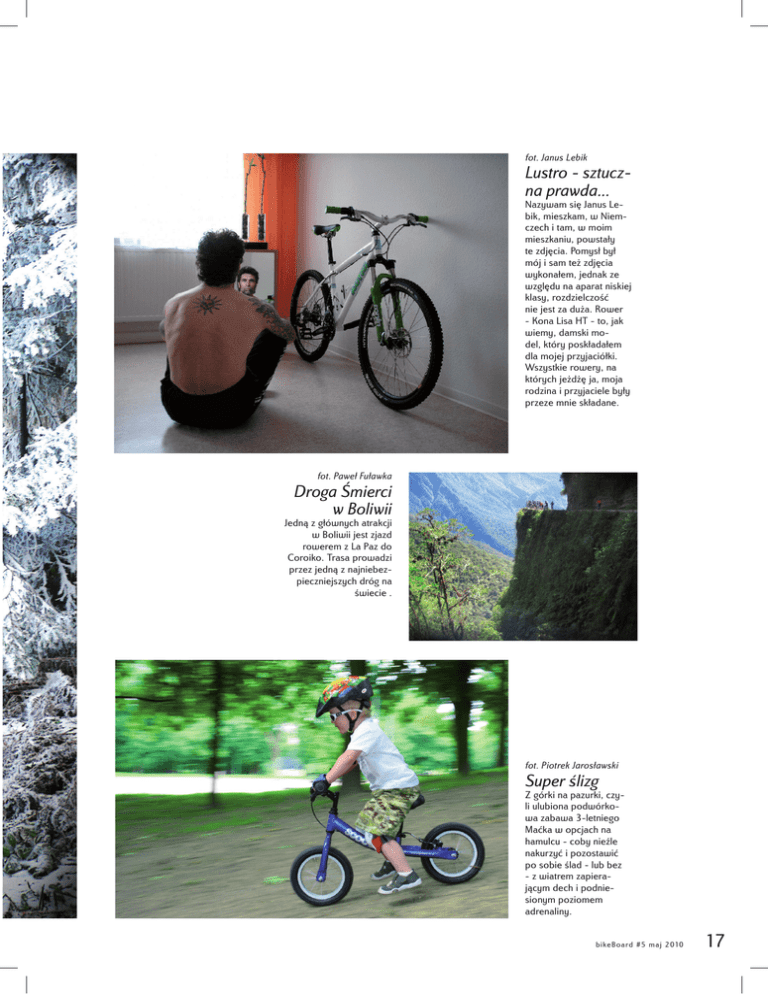 fot. Janus Lebik Lustro - sztuczna prawda... Nazywam się Janus Lebik, mieszkam, w Niemczech i tam, w moim mieszkaniu, powstały te zdjęcia. Pomysł był mój i sam też zdjęcia wykonałem, jednak ze względu na aparat niskiej klasy, rozdzielczość nie jest za duża. Rower - Kona Lisa HT - to, jak wiemy, damski model, który poskładałem dla mojej przyjaciółki. Wszystkie rowery, na których jeżdżę ja, moja rodzina i przyjaciele były przeze mnie składane. fot. Paweł Fuławka Droga Śmierci w Boliwii Jedną z głównych atrakcji w Boliwii jest zjazd rowerem z La Paz do Coroiko. Trasa prowadzi przez jedną z najniebezpieczniejszych dróg na świecie . fot. Piotrek Jarosławski Super ślizg Z górki na pazurki, czyli ulubiona podwórkowa zabawa 3-letniego Maćka w opcjach na hamulcu - coby nieźle nakurzyć i pozostawić po sobie ślad - lub bez - z wiatrem zapierającym dech i podniesionym poziomem adrenaliny. bikeBoar d #5 maj 2010 17
