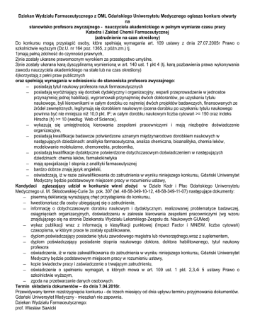Dziekan Wydziału Farmaceutycznego z OML Gdańskiego Uniwersytetu Medycznego ogłasza konkurs otwarty na stanowisko profesora zwyczajnego - nauczyciela akademickiego w pełnym wymiarze czasu pracy Katedra i Zakład Chemii Farmaceutycznej (zatrudnienie na czas określony) Do konkursu mogą przystąpić osoby, które spełniają wymagania art. 109 ustawy z dnia 27.07.2005r Prawo o szkolnictwie wyższym (Dz.U. nr 164 poz. 1365, z późn.zm.) tj. 1)mają pełną zdolność do czynności prawnych, 2)nie zostały ukarane prawomocnym wyrokiem za przestępstwo umyślne, 3)nie zostały ukarana karą dyscyplinarną wymienioną w art. 140 ust. 1 pkt 4 (tj. karą pozbawienia prawa wykonywania zawodu nauczyciela akademickiego na stałe lub na czas określony) 4)korzystają z pełni praw publicznych oraz spełniają wymagania w odniesieniu do stanowiska profesora zwyczajnego: posiadają tytuł naukowy profesora nauk farmaceutycznych posiadają wyróżniający się dorobek dydaktyczny i organizacyjny, wsparli przeprowadzenie w jednostce przynajmniej jednej habilitacji, wypromowali przynajmniej dwóch doktorantów, po uzyskaniu tytułu naukowego, byli kierownikami w całym dorobku co najmniej dwóch projektów badawczych, finansowanych ze źródeł zewnętrznych, legitymują się dorobkiem naukowym (ocena dorobku po uzyskaniu tytułu naukowego powinna być nie mniejsza niż 10,0 pkt. IF; w całym dorobku naukowym liczba cytowań >= 150 oraz indeks Hirscha (h) >= 10 (według Web of Science), wykazują się umiejętnością kierowania zespołami pracowniczymi i mają niezbędne doświadczenie organizacyjne, posiadają kwalifikacje badawcze potwierdzone uznanym międzynarodowo dorobkiem naukowych w następujących dziedzinach: analityka farmaceutyczna, analiza chemiczna, bioanalityka, chemia leków, modelowanie molekularne, chemometria, proteomika, posiadają kwalifikacje dydaktyczne potwierdzone dotychczasowym doświadczeniem w następujących dziedzinach: chemia leków, farmakokinetyka mają specjalizację I stopnia z analityki farmaceutycznej bardzo dobrze znają język angielski, oświadczają, iż w razie zakwalifikowania do zatrudnienia w wyniku niniejszego konkursu, Gdański Uniwersytet Medyczny będzie podstawowym miejscem pracy w rozumieniu ustawy, Kandydaci zgłaszający udział w konkursie winni złożyć w Dziale Kadr i Płac Gdańskiego Uniwersytetu Medycznego ul. M. Skłodowskiej-Curie 3a pok. 307 (tel. 48-58-349-10-12, 48-58-349-11-07) następujące dokumenty: pisemną deklarację wyrażającą chęć przystąpienia do konkursu, kwestionariusz dla osoby ubiegającej się o zatrudnienie, informację o dotychczasowym dorobku naukowym i dydaktycznym, realizowanej problematyce badawczej, osiągnięciach organizacyjnych, doświadczeniu w zakresie kierowania zespołami pracowniczymi (wg wzoru znajdującego się na stronie Dziekanatu Wydziału Lekarskiego-Zespołu ds. Naukowych GUMed) wykaz publikacji wraz z informacją o klasyfikacji punktowej (Impact Factor i MNiSW, liczba cytowań) czasopisma, w którym prace te zostały opublikowane, dyplom poświadczający posiadanie tytułu zawodowego magistra lub równorzędnego,wraz z suplementem, dyplom poświadczający posiadanie stopnia naukowego doktora, doktora habilitowanego, tytuł naukowy profesora oświadczenie, iż w razie zakwalifikowania do zatrudnienia w wyniku niniejszego konkursu, Gdański Uniwersytet Medyczny będzie podstawowym miejscem pracy w rozumieniu ustawy, kopie świadectw pracy i zaświadczenie o trwającym zatrudnieniu, oświadczenie o spełnieniu wymagań, o których mowa w art. 109 ust. 1 pkt. 2,3,4i 5 ustawy Prawo o szkolnictwie wyższym, zgoda na przetwarzanie danych osobowych. Termin składania dokumentów – do dnia 7.04.2016r. Przewidywany termin rozstrzygnięcia konkursu - do trzech miesięcy od dnia upływu terminu przyjmowania dokumentów. Gdański Uniwersytet Medyczny - mieszkań nie zapewnia. Dziekan Wydziału Farmaceutycznego: prof. Wiesław Sawicki The Dean of Faculty of Pharmacy with Subfaculty of Laboratory Medicine Medical University of Gdansk hereby opens a competition for the position of ordinary (full) professor – a didactic and research university employee– a full time academic teacher - Department of Pharmaceutical Chemistry (a fixed term employment contract) The competition may be entered by candidates who meet the requirements stipulated in Art. 109 of the Act of 2005, July 27, the Law on Higher Education (Journal of Laws No. 164, item 1365 as amended), and in particular: 1. have full legal capacity, 2. have not been sentenced by any legally binding decision for intentional offence, 3. have not received any disciplinary penalty specified in Art. 140 Item 1 Point 4 (i.e. the penalty of being deprived of the right to practise the profession of academic teacher either permanently or temporarily), 4. enjoy full civil rights, and meet the requirements for the position in particular: hold the title of full professor of pharmaceutical sciences (have outstanding experience in both didactic and organisational areas; have supported, within their departmental unit, at least one habilitation; promoted at least two Ph.D students, after obtaining doctoral qualification; have managed so far at least two scientific projects financed from external resources; can demonstrate their scientific achievements (literary output IF at least 10 after obtaining a postdoctoral degree; a total number of citations ˃=150 and h-index (h) ˃=10 (according to Web of Science)) have scientific and didactic work achievements, are able to manage a team of workers, have indispensible organisational skills and experience, have research qualifications documented by recognized international scientific achievements in: pharmaceutical analytics, chemical analysis, bioanalytics, pharmaceutics, molecular modeling, chemometrics, proteomics have academic teaching qualifications documented by previous experience in: pharmaceutics and pharmacokinetics 