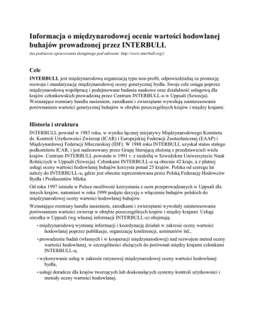 Informacja o międzynarodowej ocenie wartości hodowlanej buhajów prowadzonej przez INTERBULL (na podstawie opracowania dostępnego pod adresem: http://www.interbull.org/) Cele INTERBULL jest międzynarodową organizacją typu non-profit, odpowiedzialną za promocję rozwoju i standaryzację międzynarodowej oceny genetycznej bydła. Swoje cele osiąga poprzez międzynarodową współpracę i podejmowane badania naukowe oraz działalność usługową dla krajów członkowskich prowadzoną przez Centrum INTERBULL-u w Uppsali (Szwecja). Wzrastające rozmiary handlu nasieniem, zarodkami i zwierzętami wywołują zainteresowanie porównaniem wartości genetycznej buhajów w obrębie poszczególnych krajów i między krajami. Historia i struktura INTERBULL powstał w 1983 roku, w wyniku łącznej inicjatywy Międzynarodowego Komitetu ds. Kontroli Użytkowości Zwierząt (ICAR) i Europejskiej Federacji Zootechnicznej (EAAP) i Międzynardowej Federacji Mleczarskiej (IDF). W 1988 roku INTERBULL uzyskał status stałego podkomitetu ICAR, i jest nadzorowany przez Grupę Sterującą złożoną z przedstawicieli wielu krajów. Centrum INTERBULL powstało w 1991 r. z siedzibą w Szwedzkim Uniwersytecie Nauk Rolniczych w Uppsali (Szwecja). Członkami INTERBULL-u są obecnie 42 kraje, a z płatnej usługi oceny wartości hodowlanej buhajów korzysta ponad 25 krajów. Polska od szeregu lat należy do INTERBULL-u, gdzie jest obecnie reprezentowana przez Polską Federację Hodowców Bydła i Producentów Mleka. Od roku 1997 istniała w Polsce możliwość korzystania z ocen przeprowadzanych w Uppsali dla innych krajów, natomiast w roku 1999 podjęto decyzję o włączeniu buhajów polskich do międzynarodowej oceny wartości hodowlanej buhajów. Wzrastające rozmiary handlu nasieniem, zarodkami i zwierzętami wywołały zainteresowanie porównaniem wartości zwierząt w obrębie poszczególnych krajów i między krajami. Usługi ośrodka w Uppsali (wg własnej informacji INTERBULL-u) obejmują: • międzynarodową wymianę informacji i koordynację działań w zakresie oceny wartości hodowlanej poprzez publikacje, organizację konferencji, seminariów itd., • prowadzenie badań (własnych i w kooperacji międzynarodowej) nad rozwojem metod oceny wartości hodowlanej, w szczególności służących do porównań między krajami członkami INTERBULL-u, • wykonywanie usług w zakresie rutynowej międzynarodowej oceny wartości hodowlanej bydła, • usługi doradcze dla krajów tworzących lub doskonalących systemy kontroli użytkowości i metody oceny wartości hodowlanej. Metody oceny wartości hodowlanej Ocena wartości hodowlanej stosowana przez Centrum INTERBULL-u jest oparta na metodzie zwanej Multiple Across Country Evaluation (MACE). Przy pomocy MACE opartej na metodzie BLUP-model zwierzęcia, dokonuje porównań między buhajami użytkowanymi w różnych krajach. Metoda MACE wykorzystuje wszystkie spokrewnienia między zwierzętami w obrębie populacji krajowej i zagranicznej, np. jeżeli buhaj posiada córki w dwóch lub więcej krajach. Porównanie córek buhajów w różnych krajach (środowiskach) umożliwia szacowanie interakcji genotyp x środowisko. Dlatego obliczenia wartości genetycznych buhajów są przygotowywane oddzielnie dla każdego kraju. Możliwe różnice w uszeregowaniu buhajów mogące wystąpić przy ocenie w 2 krajach ilustruje poniższy rysunek (cyt. za INTERBULL ). Ocena Krajowa Kraj A 1. Buhaj A1 2. Buhaj A2 3. Buhaj A3 MACE INTERBULL Ocena Międzynarodowa Kraj B 1. Buhaj B1 2. Buhaj B2 3. Buhaj B3 1. 2. 3. 4. 5. 6. Kraj A Buhaj A1 Buhaj A2 Buhaj B2 Buhaj B1 Buhaj A3 Buhaj B3 1. 2. 3. 4. 5. 6. Kraj B Buhaj B1 Buhaj A2 Buhaj B2 Buhaj B3 Buhaj A1 Buhaj A3 Wyniki oceny wszystkich buhajów są przekazywane do krajów członkowskich w lokalnych jednostkach i odniesione do lokalnej bazy. W ten sposób buhaje z USA otrzymują wartości hodowlane wyrażone w funtach PTA, z uwzględnieniem odpowiedniej wartości bazy, holenderskie w kg EBV, z uwzględnieniem przyjętej bazy, podobnie wyrażone są polskie wartości hodowlane. Pozwala to na wybór najlepszych buhajów z pośród nadesłanych do międzynarodowej oceny, wg własnych kryteriów. INTERBULL zastrzega z naciskiem, że nie szereguje buhajów, a jedynie podaje dla każdego kraju ocenione wartości hodowlane dla określonych cech. Wyniki te powinny stanowić podstawę wyboru buhajów wg lokalnego celu hodowlanego. Ocenie podlegają cechy wydajności mlecznej, pokroju, cechy charakteryzujące stan zdrowotny wymienia tzn. liczbę komórek somatycznych i kliniczne zapalenie wymienia, długowieczność, przebieg porodu, płodność, szybkość oddawania mleka i temperament. Wszystkie kraje członkowskie biorą udział w ocenie dla cech produkcyjnych, prawie wszystkie dla cech pokroju. Pozostałe cechy funkcjonalne w niektórych krajach nie są jeszcze włączone do oceny międzynarodowej. Wartości hodowlane są obecnie szacowane dla następujących ras: Ayrshire, Brown Swiss, Guernsey, Holstein, Jersey i Simental. INTERBULL ocenia łącznie ponad 100 000 buhajów odmiany holsztyńskiej. Centrum INTERBULL przeprowadza ocenę 3 razy w roku oraz dwa razy w roku dokonuje ocen testowych, w których obowiązkowo muszą brać udział kraje planujące wprowadzenie zmian, modyfikacji i poprawek w swoich systemach oceny. Polska uczestniczy w ocenie międzynarodowej, której wyniki są podawane zgodnie z kryteriami zamieszczonymi w metodach oceny krajowej. Ze względu na kryteria dotyczące struktury przesyłanych danych, ocenie międzynarodowej podlega obecnie tylko rasa polska holsztyńskofryzyjska. Dokładność (powtarzalność) oceny międzynarodowej jest inna niż krajowej, co wynika z odmiennej metody jej obliczania. Ponadto buhaje użytkowane równocześnie w Polsce i innych krajach mają zazwyczaj w ocenie międzynarodowej więcej córek niż w ocenie krajowej. Dodatkową miarą dokładności oceny międzynarodowej jest e