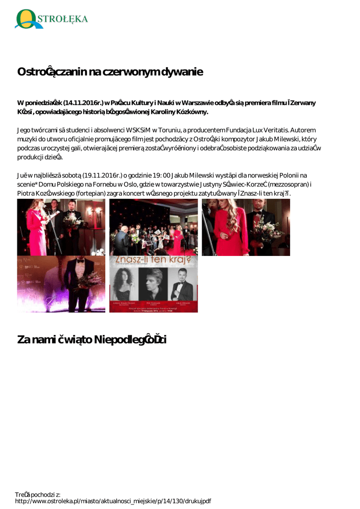 Ostrołęczanin na czerwonym dywanie W poniedziałek (14.11.2016r.) w Pałacu Kultury i Nauki w Warszawie odbyła się premiera filmu „Zerwany Kłos”, opowiadającego historię błogosławionej Karoliny Kózkówny. Jego twórcami są studenci i absolwenci WSKSiM w Toruniu, a producentem Fundacja Lux Veritatis. Autorem muzyki do utworu oficjalnie promującego film jest pochodzący z Ostrołęki kompozytor Jakub Milewski, który podczas uroczystej gali, otwierającej premierę został wyróżniony i odebrał osobiste podziękowania za udział w produkcji dzieła. Już w najbliższą sobotę (19.11.2016r.) o godzinie 19: 00 Jakub Milewski wystąpi dla norweskiej Polonii na scenie* Domu Polskiego na Fornebu w Oslo, gdzie w towarzystwie Justyny Sławiec-Korzeń (mezzosopran) i Piotra Kozłowskiego (fortepian) zagra koncert własnego projektu zatytułowany „Znasz-li ten kraj?”. Za nami Święto Niepodległości Treść pochodzi z: http://www.ostroleka.pl/miasto/aktualnosci_miejskie/p/14/130/drukujpdf Ostrołęckie uroczystości rocznicy odzyskania polskiej państwowości rozpoczęło złożenie kwiatów pod obeliskiem poświęconym kolejarzom ostrołęckiego węzła. Kolejnym elementem obchodów była uroczysta sesja Rady Miasta, odbywająca się tradycyjnie w gościnnych murach Ostrołęckiego Centrum Kultury. - Spotykamy się by uczcić 11 listopada w sposób radosny, bo jest to bardzo radosne święto. Dziś już nikt nie zabroni nam rozmawiać w języku polskim ani prezentować dumę z naszych narodowych symboli. Współczesny patriotyzm to nie przelewanie krwi za Polskę, ale troska o małą ojczyznę, poszanowanie dla wolności i dla życia, to szanowanie wspólnego dobra – mówił prowadzący obrady przewodniczący Rady Miasta Jerzy Grabowski. 11 Listopada był okazją do wręczenia honorowych odznak „Za zasługi dla miasta Ostrołęki”. Trafiły one do dwóch instytucji -Powiatowej Stacja Sanitarno-Epidemiologicznej w Ostrołęce i Energi Elektrownie Ostrołęka oraz dwóch osób zasłużonych dla podtrzymywania patriotycznych tradycji: kpt. Franciszka Chrostowskiego Prezesa ostrołęckiego oddziału Światowego Związku Żołnierzy Armii Krajowej oraz Józefa Głażewskiego – strażnika grobu Żołnierzy Wyklętych w Łodziskach. Odbierająca odznakę w imieniu spółki Energa Elektrownie Ostrołęka wiceprezes Katarzyna Kamińska powiedziała - Ta prestiżowa odznaka cieszy, ale i zobowiązuje. Oprócz podstawowej działalności, staramy się w sposób pozytywny oddziaływać na sferę gospodarczą i społeczną najbliższego otoczenia, współpracując z samorządem i innymi podmiotami. W imieniu pracowników i zarządu serdecznie dziękuję, angażowanie się w życie publiczne niesie wiele satysfakcji i daje wiele radości. Tu żyjemy, mieszkamy, pracujemy. Do tutejszych szkół i przedszkoli uczęszczają nasze dzieci. Po prostu: Ostrołęka to nasze miasto Specjalne nagrody od Stowarzyszenia Sympatyków 5 Pułku Ułanów Zasławskich za pomoc w zorganizowaniu wyjazdu do Zasławia na uroczystość odsłonięcia obelisku poświęconemu ułanom otrzymali przewodniczący Rady Miasta Jerzy Grabowski i prezydent Janusz Kotowski.. Sesję zakończył występ słowno-muzyczny w wykonaniu ostrołęckiego chóru Cantilena. Treść pochodzi z: http://www.ostroleka.pl/miasto/aktualnosci_miejskie/p/14/130/drukujpdf Filmy: http://www.youtube.com/embed/-80HJ1V3gCchttp://www.youtube.com/embed/qt7hI3LAzVg Treść pochodzi z: http://www.ostroleka.pl/miasto/aktualnosci_miejskie/p/14/130/drukujpdf Szkolenie dla organizacji pozarządowych - zmiana miejsca Urząd Miasta Ostrołęki wprowadza system Witkac wspierający konkursy ofert na realizację zadań publicznych. W związku z tym we wtorek 15 listopada 2016 r. o godz. 14:30 odbędzie się szkolenie dla organizacji pozarządowych. Uwaga! Zmiana miejsca szkolenia: Wydział Promocji Miasta, Kultury i Sportu, Urząd Miasta Ostrołęki pl. Gen. J. Bema 7A Przy okazji omówione zostaną podstawowe zagadnienia dotyczące nowych wzorów, ofert i sprawozdań. Harcerze zapraszają na Dni Niepodległej Związek Harcerstwa Rzeczypospolitej w Ostrołęce zaprasza na cykl wydarzeń kulturalnych w ramach Dni Niepodległej. Odbędą się one pod patronatem Prezydenta Miasta Ostrołęki. Film "Śmierć Rotmistrza Pileckiego" W dniu 10 listopada o godzinie 18:00 zapraszamy na plenerowe kino na skwerku przed Urzędem Stanu Cywilnego w Okolicy Placu Bema. Wyświetlony zostanie film "Śmierć Rotmistrza Pileckiego". W czasie filmu będziemy rozdawać ciepłą herbatę. Wieczornica harcerska W dniu 10 listopada o godzinie 20:00 spotykamy się przy Pomniku Żołnierzy Wyklętych by w kilku pieśniach i wierszach wspomnieć wszystkich tych, którym zawdzięczamy wolność Ojczyzny. Msza Święta Msza święta w intencji ojczyzny zostanie odprawiona o godzinie 10:00 w Kościele pw. Najświętszej Maryi Panny Królowej Rodzin przy ul. Kaczyńskiej 33. Przed Mszą Świętą o godzinie 9:30 nastąpi złożenie kwiatów pod obeliskiem poświęconym Kolejarzom Węzła Ostrołęckiego. Uroczysta XXXIII Sesja Rady Miasta Ostrołęki Sesja odbędzie się w dniu 11 listopada o godzinie 12:00 w sali widowiskowej Ostrołęckiego Centrum Kultury. Treść pochodzi z: http://www.ostroleka.pl/miasto/aktualnosci_miejskie/p/14/130/drukujpdf Spacer historyczny Po uroczystej sesji Rady Miasta Ostrołęki odbędzie się spacer historyczny. Start i koniec spaceru przewidziany jest przed OCK. Spacer rozpocznie się ok. godziny 14:00 i potrwa ok. 90 minut. Śpiewanie pieśni patriotycznych W godzinie 16:00 w sali widowiskowej OCK odbędzie się wspólne śpiewanie pieśni patriotycznych i koncert Ostrołęckiego Chóru Kameralnego. Bieg na orientację Bieg na orientację odbędzie się w Laskowcu dnia 12 listopada o godzinie 10:00. Punkt początkowy do Ośrodek Hipoterapii Tabun w Laskowcu. Od przystanku autobusowego przygotowane będą oznaczenia dojścia na miejsce. Przewidywa