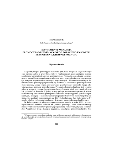 Marcin Nowik Koło Naukowe Handlu Zagranicznego „Cargo” INSTRUMENTY WSPARCIA PROMOCYJNO-INFORMACYJNEGO POLSKIEGO EKSPORTU: STAN OBECNY, KIERUNKI ROZWOJU Wprowadzenie Aktywna polityka promocyjna stosowana jest przez wszystkie kraje rozwinięte oraz liczne państwa z grupy tzw. rynków wschodzących, jako niezbędny element proeksportowej strategii rozwoju gospodarczego. Promocja gospodarcza obejmuje przede wszystkim dwa podstawowe obszary, są to promocja eksportu oraz promocja napływu bezpośrednich inwestycji zagranicznych. 1 Elementem wspólnym dla obu obszarów promocji gospodarczej są działania o charakterze promocji makroekonomicznej, której celem jest kreowanie pozytywnego wizerunku kraju jako wiarygodnego partnera gospodarczego. Promocja eksportu określana jest również mianem wsparcia promocyjno-informacyjnego eksportu, gdyż koncentruje się wokół tych dwóch dziedzin. Z jednej strony polega na wspieraniu promocji mikroekonomicznej realizowanej przez przedsiębiorstwa eksportujące na rynkach zagranicznych., z drugiej – na dostarczaniu tym przedsiębiorstwom możliwie pełnej informacji o rynkach zagranicznych, na których funkcjonują lub funkcjonować by mogły, gdyż na tych rynkach zgłaszany jest popyt na produkty przedsiębiorstwa. W Polsce promocja eksportu zapoczątkowana została w roku 1991, poprzez wydzielenie w budżecie środków na „fundusz promocji”, które to środki służyły sfinansowaniu instrumentów promocji gospodarczej realizowanych przez Ministerstwo Współpracy Gospodarczej z Zagranicą, a następnie przez Ministerstwo Go1 Wraz z rozwojem gospodarczym kraju, coraz większego znaczenia nabiera trzeci obszar promocji gospodarczej tj. promocja bezpośrednich inwestycji zagranicznych realizowanych przez przedsiębiorstwa krajowe. 300 spodarki.2 Kierunki rozwoju oraz zakres wsparcia o charakterze promocyjno- informacyjnym wyznaczane były w kolejnych programach rządowych dotyczących polityki proeksportowej. Były to „Założenia polityki proeksportowej” (1993), „Kierunki działań dla pobudzenia eksportu” (1997), „Ocena sytuacji i propozycje działań dla polepszenia sytuacji w handlu zagranicznym Polski” (1999) oraz „Program promocji gospodarczej Polski do roku 2005” (2003). Wsparcie promocyjne eksportu należy obecnie do jednego z najważniejszych instrumentów polskiej polityki proeksportowej, gdyż została ona obecnie ograniczona jedynie do wsparcia finansowego oraz promocyjno-informacyjnego. Analizując rozwój instrumentów wsparcia wskazać można na dwa wyraźne trendy: 1. Wypieranie klasycznych instrumentów wsparcia przez programy finansowane ze środków Unii Europejskiej. Dotychczasowe instrumenty będące w dyspozycji Ministra Gospodarki wygaszane są lub włączane w ramy priorytetów i działań programów operacyjnych współfinansowanych z funduszy europejskich. Pozytywną konsekwencją tego trendu jest znaczące zwiększenie środków przeznaczanych na realizację poszczególnych instrumentów wsparcia oraz określenie jasnych i uporządkowanych zasad udzielania pomocy. Negatywną konsekwencją z kolei jest usztywnienie regulacji, środki nie mogą być dowolnie przenoszone pomiędzy instrumentami, przez co stają się one mało elastyczne w stosunku do zmieniających się potrzeb. Programy wspólnotowe cechuje duży stopień biurokratyzacji, przygotowanie wniosku o pomoc staje się zbyt drogie oraz zbyt skomplikowane dla przedsiębiorców przez co rzadziej występują oni o wsparcie3. 2. Decentralizacja promocji eksportu. Wraz z kolejnymi perspektywami finansowania coraz więcej instrumentów wspierania eksportu przekazywanych jest ze stopnia centralnego do poziomu administracji samorządowej. Już w ramach kolejnych edycji programu Phare Spójność Społeczno-Gospodarcza Program Rozwoju Przedsiębiorstw Eksportowych, finansowanie przeznaczone było dla przedsiębiorstw ze wskazanych regionów. W perspektywie finansowej 2007-2013 działania takie jak dofinansowanie kosztów udziału w międzynarodowych targach i wystawach oraz w wyjazdowych misjach gospodarczych przeniesione zostały do Regionalnych Programów Operacyjnych.4 2 Gwoli ścisłości, były to kolejno ministerstwa: gospodarki (1997-2003), gospodarki, pracy i polityki społecznej (2003-2004), gospodarki i pracy (2004-2005). Od 31 października do chwili obecnej Ministerstwo Gospodarki. 3 W 2003 zarejestrowano blisko 4000 wniosków o dofinansowanie kosztów udziału w międzynarodowych targach i wystawach, dla porównania w 2005 roku zarejestrowano niewiele ponad 2000 wniosków. Podaję za: E. Cieślakiewicz, Ewolucja instrumentów promocji i wspierania eksportu ministerstwa Gospodarki w kontekście przystąpienia Polski do Unii Europejskiej, Departament Instrumentów Wsparcia, Ministerstwo Gospodarki, Warszawa 2006, s.46 4 Opracowano na podstawie wywiadu z panem J.Chojna, dn. 12.03.08 301 Analiza instrumentów wsparcia eksportu kierowanych do polskich przedsiębiorstw Znaczna liczba instytucji zajmujących się promocją gospodarczą zapewnia szeroką, chociaż mocno rozdrobnioną, ofertę instrumentów wsparcia kierowanych do przedsiębiorstw eksportujących lub takich, które chciałyby podjąć działalność eksportową. Już w 2003 roku J. Chojna w opracowaniu IKiCHZ, zauważa, iż instrumentarium wsparcia promocyjnego eksportu obejmuje szeroki zestaw środków i narzędzi, „nie odbiegający zasadniczo od funkcjonującego w krajach UE”5. Od tego czasu wachlarz dostępnych narzędzi nie uległ ograniczeniu, a wręcz przeciwnie, wzbogacił się o nowe rozwiązania, chociaż zasady udzielania pomocy w ramach niektórych instrumentów musiały zostać zmienione wraz z przyjęciem Polski do UE. W celu usystematyzowania oraz uporządkowania znacznej liczby dostępnych instrumentów wsparcia, w niniejszej pracy omówione zostały one wg podziału kompetencji poszczególnych podmiotów realizujących zadania z promocji eksportu. Ministerst