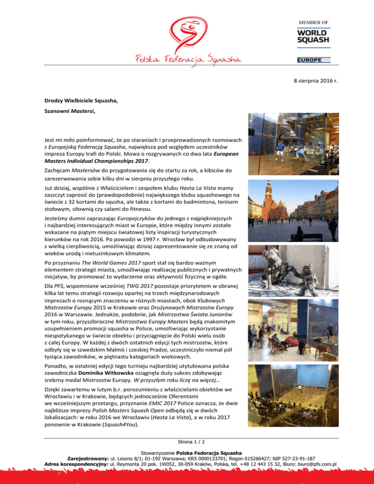 MEMBER OF 8 sierpnia 2016 r. Drodzy Wielbiciele Squasha, Szanowni Mastersi, Jest mi miło poinformować, że po staraniach i przeprowadzonych rozmowach z Europejską Federacją Squasha, największa pod względem uczestników impreza Europy trafi do Polski. Mowa o rozgrywanych co dwa lata European Masters Individual Championships 2017. Zachęcam Mastersów do przygotowania się do startu za rok, a kibiców do zarezerwowania sobie kilku dni w sierpniu przyszłego roku. Już dzisiaj, wspólnie z Właścicielem i zespołem klubu Hasta La Vista mamy zaszczyt zaprosić do (prawdopodobnie) największego klubu squashowego na świecie z 32 kortami do squsha, ale także z kortami do badmintona, tenisem stołowym, siłownią czy salami do fitnessu. Jesteśmy dumni zapraszając Europejczyków do jednego z najpiękniejszych i najbardziej interesujących miast w Europie, które między innymi zostało wskazane na piątym miejscu światowej listy inspiracji turystycznych kierunków na rok 2016. Po powodzi w 1997 r. Wrocław był odbudowywany z wielką cierpliwością, umożliwiając dzisiaj zaprezentowanie się ze znaną od wieków urodą i nietuzinkowym klimatem. Po przyznaniu The World Games 2017 sport stał się bardzo ważnym elementem strategii miasta, umożliwiając realizację publicznych i prywatnych inicjatyw, by promować to wydarzenie oraz aktywność fizyczną w ogóle. Dla PFS, wspomniane wcześniej TWG 2017 pozostaje priorytetem w obranej kilka lat temu strategii rozwoju opartej na trzech międzynarodowych imprezach o rosnącym znaczeniu w różnych miastach, obok Klubowych Mistrzostw Europy 2015 w Krakowie oraz Drużynowych Mistrzostw Europy 2016 w Warszawie. Jednakże, podobnie, jak Mistrzostwa Świata Juniorów w tym roku, przyszłoroczne Mistrzostwa Europy Masters będą znakomitym uzupełnieniem promocji squasha w Polsce, umożliwiając wykorzystanie niespotykanego w świecie obiektu i przyciągnięcie do Polski wielu osób z całej Europy. W każdej z dwóch ostatnich edycji tych mistrzostw, które odbyły się w szwedzkim Malmö i czeskiej Pradze, uczestniczyło niemal pół tysiąca zawodników, w piętnastu kategoriach wiekowych. Ponadto, w ostatniej edycji tego turnieju najbardziej utytułowana polska zawodniczka Dominika Witkowska osiągnęła duży sukces zdobywając srebrny medal Mistrzostw Europy. W przyszłym roku liczę na więcej… Dzięki zawartemu w lutym b.r. porozumieniu z właścicielami obiektów we Wrocławiu i w Krakowie, będących jednocześnie Oferentami we wcześniejszym przetargu, przyznanie EMIC 2017 Polsce oznacza, że dwie najbliższe imprezy Polish Masters Squash Open odbędą się w dwóch lokalizacjach: w roku 2016 we Wrocławiu (Hasta La Vista), a w roku 2017 ponownie w Krakowie (Squash4You). Strona 1 / 2 Stowarzyszenie Polska Federacja Squasha Zarejestrowany: ul. Leszno 8/1; 01-192 Warszawa; KRS 0000133701; Regon 015266427; NIP 527-23-91-187 Adres korespondencyjny: ul. Reymonta 20 pok. 1W052, 30-059 Kraków, Polska, tel. +48 12 443 15 32, Biuro: [email protected] MEMBER OF W ostatni piątek wieczorem Maciej Kliś wraz z zaproszonymi gośćmi oficjalnie otworzył – również w imieniu PFS – Virtual Data Center & Dental Care Mistrzostwa Świata Juniorów 2016, które odbywają się w klubie Enjoy oraz na placu Chrobrego w Bielsku-Białej. Jestem przekonany, że zespół organizacyjny stanie na wysokości zadania, sama impreza przyniesie wiele satysfakcji, a juniorzy z całego świata – także Polacy – będą bez wytchnienia walczyć o najlepsze miejsca i medale. Dziękuję bardzo za zaangażowanie, a także sponsorom i partnerom mistrzostw, bez których nie mogłyby się odbyć. Zachęcam do śledzenia na stronie turniejowej i z wynikami: http://wsfworldjuniors.com/pl/ http://bo5.pl/t1034/World+Juniors+Individual+Championships.html. Ceremonia otwarcia WJC 2016 w Polsce wyprzedziła zaledwie o kilka godzin inną wielką uroczystość – rozpoczęcie XXXI Letnich Igrzysk Olimpijskich w Rio de Janeiro. To bardzo niefortunny termin rozgrywania squashowych mistrzostw, na który zdecydowała się Światowa Federacja Squasha. Myśląc o Olimpiadzie, można też wspomnieć o zatwierdzeniu w połowie ubiegłego tygodnia przez Międzynarodowy Komitet Olimpijski pięciu sportów, które dołączą do programu w roku 2020. Zgodnie z moimi oczekiwaniami niniejsze posiedzenie było formalnością po wcześniejszym wyborze dokonanym przez Komitet Organizacyjny Tokio 2020 we wrześniu ubiegłego roku. Gratuluję sportom, które dołączą za cztery lata, czyli: Baseball i softball, skateboarding, surfing, karate i wspinaczka sportowa. Dwa ostatnie z nich będziemy mogli jeszcze zobaczyć podczas The World Games 2017 we Wrocławiu. Tomasz Banasiak Prezes Polskiej Federacji Squasha Passionate For Squash Strona 2 / 2 Stowarzyszenie Polska Federacja Squasha Zarejestrowany: ul. Leszno 8/1; 01-192 Warszawa; KRS 0000133701; Regon 015266427; NIP 527-23-91-187 Adres korespondencyjny: ul. Reymonta 20 pok. 1W052, 30-059 Kraków, Polska, tel. +48 12 443 15 32, Biuro: [email protected]