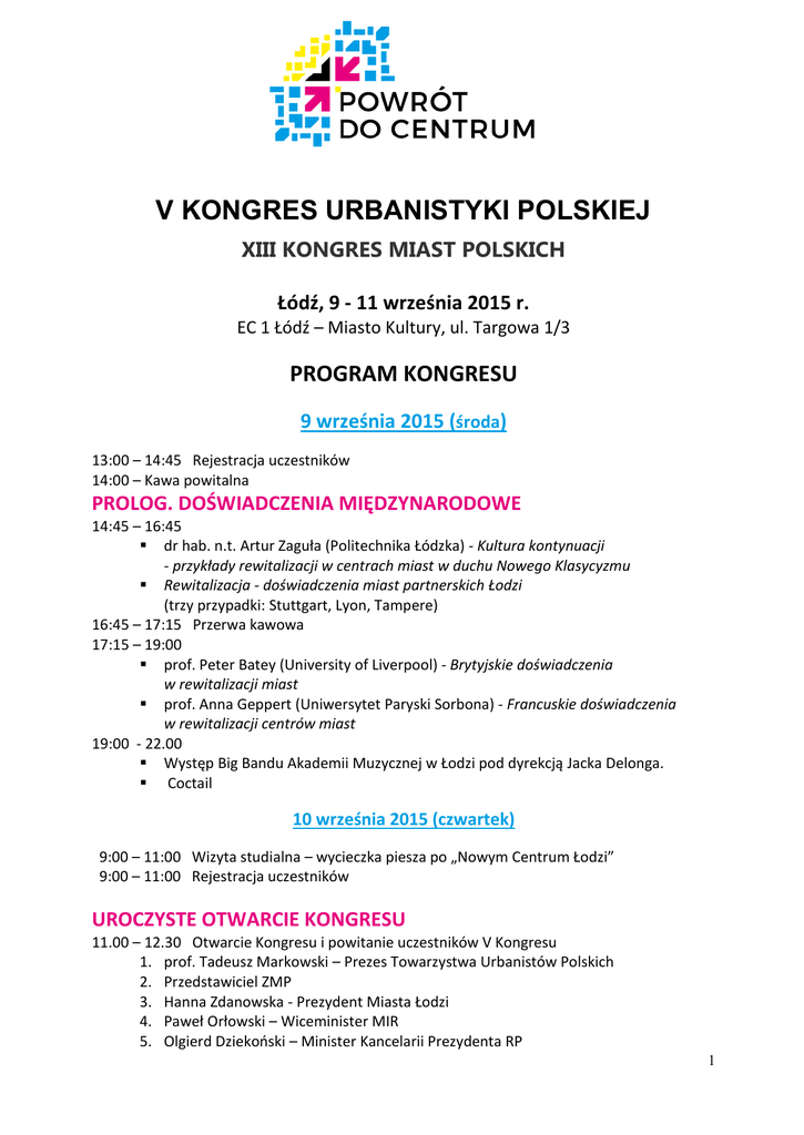 V KONGRES URBANISTYKI POLSKIEJ XIII KONGRES MIAST POLSKICH Łódź, 9 - 11 września 2015 r. EC 1 Łódź – Miasto Kultury, ul. Targowa 1/3 PROGRAM KONGRESU 9 września 2015 (środa) 13:00 – 14:45 Rejestracja uczestników 14:00 – Kawa powitalna PROLOG. DOŚWIADCZENIA MIĘDZYNARODOWE 14:45 – 16:45 dr hab. n.t. Artur Zaguła (Politechnika Łódzka) - Kultura kontynuacji - przykłady rewitalizacji w centrach miast w duchu Nowego Klasycyzmu Rewitalizacja - doświadczenia miast partnerskich Łodzi (trzy przypadki: Stuttgart, Lyon, Tampere) 16:45 – 17:15 Przerwa kawowa 17:15 – 19:00 prof. Peter Batey (University of Liverpool) - Brytyjskie doświadczenia w rewitalizacji miast prof. Anna Geppert (Uniwersytet Paryski Sorbona) - Francuskie doświadczenia w rewitalizacji centrów miast 19:00 - 22.00 Występ Big Bandu Akademii Muzycznej w Łodzi pod dyrekcją Jacka Delonga. Coctail 10 września 2015 (czwartek) 9:00 – 11:00 Wizyta studialna – wycieczka piesza po „Nowym Centrum Łodzi” 9:00 – 11:00 Rejestracja uczestników UROCZYSTE OTWARCIE KONGRESU 11.00 – 12.30 Otwarcie Kongresu i powitanie uczestników V Kongresu 1. prof. Tadeusz Markowski – Prezes Towarzystwa Urbanistów Polskich 2. Przedstawiciel ZMP 3. Hanna Zdanowska - Prezydent Miasta Łodzi 4. Paweł Orłowski – Wiceminister MIR 5. Olgierd Dziekoński – Minister Kancelarii Prezydenta RP 1 Wręczenie nagród TUP laureatom konkursu na najlepiej zagospodarowaną przestrzeń publiczną w roku 2014 pod patronatem Prezydenta RP 12:30 – 13:00 Przerwa SESJA PLENARNA. ROZWÓJ MIASTA DO WEWNĄTRZ 13:00 – 14:30 1. Andrzej Brzozowy, Departament Polityki Przestrzennej MIR - Narodowy Plan Rewitalizacji (NPR) 2. prof. Marek Janiak, Architekt Miasta Łodzi - Mechanizmy deprecjonowania historycznych centrów miast w Polsce a ich potencjał kulturowy, na przykładzie Łodzi 3. dr hab. Małgorzata Dymnicka (Politechnika Gdańska), prof. dr hab. Marek Szczepański (Uniwersytet Śląski) – Centrum miasta i jego funkcje społeczne. Perspektywa socjologiczna 4. prof. dr hab. Jacek Purchla (Przewodniczący Rady Ochrony Zabytków przy Ministrze Kultury) – Dziedzictwo kulturowe a urbanizacja. Zamiana relacji? 5. Radosław Stępień (Wiceprezes Banku Gospodarstwa Krajowego) - Zwrotne instrumenty finansowania procesów rewitalizacji 6. Kazimierz Bald (Przewodniczący Rady TUP) – Łódzka Karta „Powrotu do centrum”. Deklaracja kongresowa 14:30 – 15:15 Przerwa na lunch SESJA I. CENTRUM W MIEŚCIE ZRÓWNOWAŻONYM 15:15 – 18:00 Dwie równoległe sesje panelowe Sesja IA Centrum wielkomiejskie, współczesne procesy urbanizacji, siły destrukcji, mechanizmy naprawy, publiczny charakter centrum Przewodniczący panelu – Tomasz Jakubiec (Dyrektor Biura Strategii Miasta UMŁ) Referaty: 1. dr inż. arch. Mirosław Wiśniewski (Przewodniczący MKUA w Łodzi) 2. dr Maciej Borsa (Szkoła Główna Handlowa w Warszawie) 3. dr hab. inż. arch. Tomasz Ossowicz, prof. nadzw. (Politechnika Wrocławska) 4. Ewa Kipta (Prezes Stowarzyszenia „Forum Rewitalizacji”) 5. Bartosz Poniatowski (Urząd Miasta Łodzi) Dyskusja - 1 godzina Sesja IB Tożsamość lokalna, zjawiska wykluczenia społecznego, partycypacja społeczna, mieszkania dla wszystkich grup społecznych Przewodniczący panelu - Janusz Sepioł (Senator RP) Referaty: 1. dr hab. inż. arch. Piotr Lorens, prof. PG (Politechnika Gdańska) 2. dr inż. arch. Robert Warsza (Miejska Pracownia Urbanistyczna w Łodzi) 3. dr Waldemar Siemiński (Politechnika Warszawska) 4. Krzysztof Suskiewicz (mLocum S.A.) 5. Piotr Pawłowski (Prezes Stowarzyszania „Integracja”) 6. dr inż. arch. Agnieszka Cieśla (IGPiM w Warszawie) Dyskusja - 1 godzina 2 19:00 – 22:00 Występ żeńskiego Kwartetu Smyczkowego „Apertus” w Filharmonii Łódzkiej. Uroczysta kolacja w Filharmonii Łódzkiej, ul. Narutowicza 20/22. 11 września 2015 (piątek) 8:30 – 9:00 Rejestracja uczestników SESJA II. REWITALIZACJA CENTRUM MIASTA 9:00 – 11:00 Dwie równoległe sesje panelowe Sesja IIA Miasto zwarte, kontrrewolucja urbanistyczna, społeczny udział w rewitalizacji, bariery rewitalizacji, regeneracja terenów pokolejowych i poprzemysłowych i ich wpływ na centrum Przewodniczący panelu – dr Adam Kowalewski (Towarzystwo Urbanistów Polskich) Referaty: 1. Błażej Moder (Dyrektor Zarządu Nowego Centrum Łodzi) 2. dr hab. inż. arch. Michał Stangel (Politechnika Gliwicka) 3. Maciej Wudarski (Wiceprezydent Miasta Poznania) 4. Rajmund Ryś (Dyrektor Departamentu Polityki Przestrzennej MIR) 5. dr inż. arch. Michał Domińczak (Politechnika Łódzka) Dyskusja - 1 godzina Sesja II B Kulturowy wymiar rewitalizacji, samorządowe doświadczenia w zakresie rewitalizacji. Przewodniczący panelu - prof. Zygmunt Ziobrowski (Instytut Rozwoju Miast w Krakowie) 1. Magdalena Wiśniewska (Urząd Miasta Łodzi) 2. Wiesław Kaczmarek (Prezes Towarzystwa Opieki nad Zabytkami) 3. Robert Szymala (Biuro Urbanistyki i Planowania Przestrzennego UM w Wałbrzychu) 4. dr Jacek Karnowski (Prezydent Miasta Sopotu) 5. Marcin Obijalski (Dyrektor Biura ds. Rewitalizacji i Rozwoju Zabudowy Miasta Urzędu Miasta Łodzi) Dyskusja - 1 godzina 11:00 – 11:30 Przerwa na kawę SESJA KOŃCOWA 11:30 – 14:00 1. dr hab. inż. arch. Krzysztof Domaradzki (Politechnika Warszawska) - Referat końcowy 2. Prezentacja wyników sesji + dyskusja 3. Przyjęcie przez Kongres Łódzkiej Karty (Deklaracji) „Powrotu do centrum” (Uchwała Karty Kongresowej) 14:00 – 15:00 Lunch 15:30 Wycieczka autokarowa po Łodzi dla uczestników Kongresu i delegatów na XVII WZD TUP 3 Wystawa posterowa. Organizatorzy umożliwiają uczestnikom Kongresu zgłoszenie prezentacji zagadnień badawczych i praktycznych w formie posterowej. Warunki przygotowania posteru zamieszczono na stronie www.tup.org.pl. Komitet przewiduje zorganizowanie wystawy z wybranych 30 posterów najbardziej odpowiadających tematyce Kongresu. Wszystkie przesłane i zaakceptowane postery będą dostępne 