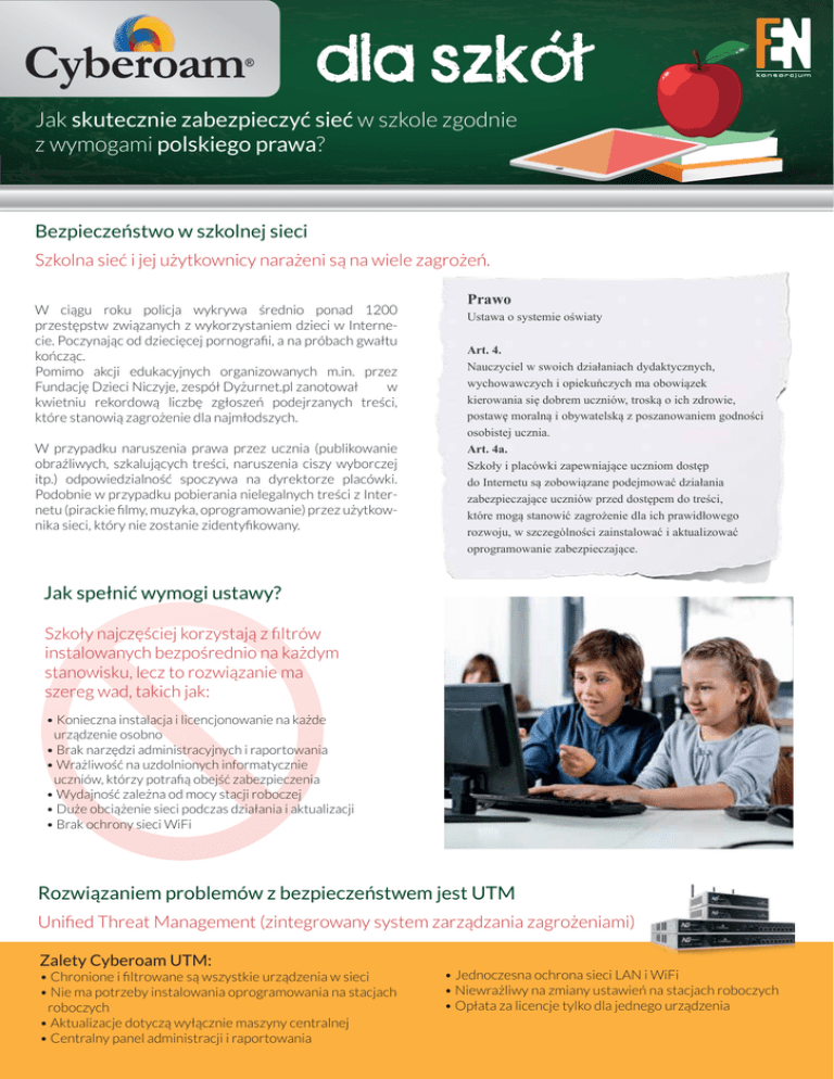 i i dla szkol Jak skutecznie zabezpieczyć sieć w szkole zgodnie z wymogami polskiego prawa? Bezpieczeństwo w szkolnej sieci Szkolna sieć i jej użytkownicy narażeni są na wiele zagrożeń. W ciągu roku policja wykrywa średnio ponad 1200 przestępstw związanych z wykorzystaniem dzieci w Internecie. Poczynając od dziecięcej pornografii, a na próbach gwałtu kończąc. Pomimo akcji edukacyjnych organizowanych m.in. przez Fundację Dzieci Niczyje, zespół Dyżurnet.pl zanotował w kwietniu rekordową liczbę zgłoszeń podejrzanych treści, które stanowią zagrożenie dla najmłodszych. W przypadku naruszenia prawa przez ucznia (publikowanie obraźliwych, szkalujących treści, naruszenia ciszy wyborczej itp.) odpowiedzialność spoczywa na dyrektorze placówki. Podobnie w przypadku pobierania nielegalnych treści z Internetu (pirackie filmy, muzyka, oprogramowanie) przez użytkownika sieci, który nie zostanie zidentyfikowany. Prawo Ustawa o systemie oświaty Art. 4. Nauczyciel w swoich działaniach dydaktycznych, wychowawczych i opiekuńczych ma obowiązek kierowania się dobrem uczniów, troską o ich zdrowie, postawę moralną i obywatelską z poszanowaniem godności osobistej ucznia. Art. 4a. Szkoły i placówki zapewniające uczniom dostęp do Internetu są zobowiązane podejmować działania zabezpieczające uczniów przed dostępem do treści, które mogą stanowić zagrożenie dla ich prawidłowego rozwoju, w szczególności zainstalować i aktualizować oprogramowanie zabezpieczające. Jak spełnić wymogi ustawy? Szkoły najczęściej korzystają z filtrów instalowanych bezpośrednio na każdym stanowisku, lecz to rozwiązanie ma szereg wad, takich jak: • Konieczna instalacja i licencjonowanie na każde urządzenie osobno • Brak narzędzi administracyjnych i raportowania • Wrażliwość na uzdolnionych informatycznie uczniów, którzy potrafią obejść zabezpieczenia • Wydajność zależna od mocy stacji roboczej • Duże obciążenie sieci podczas działania i aktualizacji • Brak ochrony sieci WiFi Rozwiązaniem problemów z bezpieczeństwem jest UTM Unified Threat Management (zintegrowany system zarządzania zagrożeniami) Zalety Cyberoam UTM: • Chronione i filtrowane są wszystkie urządzenia w sieci • Nie ma potrzeby instalowania oprogramowania na stacjach roboczych • Aktualizacje dotyczą wyłącznie maszyny centralnej • Centralny panel administracji i raportowania • Jednoczesna ochrona sieci LAN i WiFi • Niewrażliwy na zmiany ustawień na stacjach roboczych • Opłata za licencje tylko dla jednego urządzenia i i dla szkol Funkcje Cyberoam UTM Przydzielanie kompetencji i pasma użytkownikom Możliwość ustalania polityk bezpieczeństwa per użytkownik lub grupa użytkowników. Inne kompetencje i zakres pasma może mieć dyrektor, a inne nauczyciel, uczeń czy gość szkoły. Aktywność w czasie rzeczywistym - Podgląd wszystkich aplikacji uruchomionych na komputerach / urządzeniach przenośnych w szkole wraz z aktualnymi i historycznymi informacjami o zużyciu łącza. Umożliwia szybką identyfikację użytkowników na podstawie działalności. Informowania użytkowników o blokadach - Użytkownicy mogą być powiadomieni o zablokowaniu danej aplikacji czy stron i o przyczynach tego działania. Edukowanie uczniów - Na podstawie urządzenia Cyberoam można pokazać wychowankom, że ich działania w Internecie nigdy nie są anonimowe. Rozpoznawanie aplikacji proxy - Wykrywanie stron i aplikacji umożliwiających uczniom obejście standardowych firewalli. Wsparcie dla YouTube for Schools - Zablokowanie dostępu do serwisu YouTube oprócz treści oznaczonych jako EDU. Nie czekaj aż coś się stanie! Już dzisiaj skorzystaj ze specjalnej ceny na zakup Cyberoam UTM i zabezpiecz sieć w Twojej szkole. Tylko dla szkół i tylko do końca roku, Cyberoam UTM w niższych cenach. Wybierz model, który będzie najlepiej spełniał potrzeby Twojej szkoły: MODEL WYDAJNOŚĆ CENA REGULARNA * CENA SPECJALNA * CR35iNG 50 6 000 zł 3 429 zł CR50iNG 80 9 600 zł 5 999 zł CR100iNG 140 17 600 zł 9 999 zł CR200iNG 350 28 000 zł 15 239 zł CR300iNG 450 32 000 zł 20 940 zł Podane ceny obejmują koszt urządzenia, oraz rocznej subskrypcji takich usług jak: - filtr Malware - filtr SPAM - filtr aplikacji - filtr zawartości stron www (content filter) - Intrusion Prevention System - wsparcie techniczne 8x5 * cena uzależniona od kursu USD Podana wydajność wyrażona jest w liczbie jednoczesnych użytkowników w sieci i jest to sugerowana górna granica wydajności urządzenia z uruchomionymi wszystkimi usługami, obliczona dla komfortowej pracy każdego użytkownika sieci. Nie jest to jednak ograniczenie wykluczające większą liczbę użytkowników korzystających z sieci. Konsorcjum FEN Sp. z o.o. ul. Dąbrowskiego 273A 60-406 Poznań [email protected]