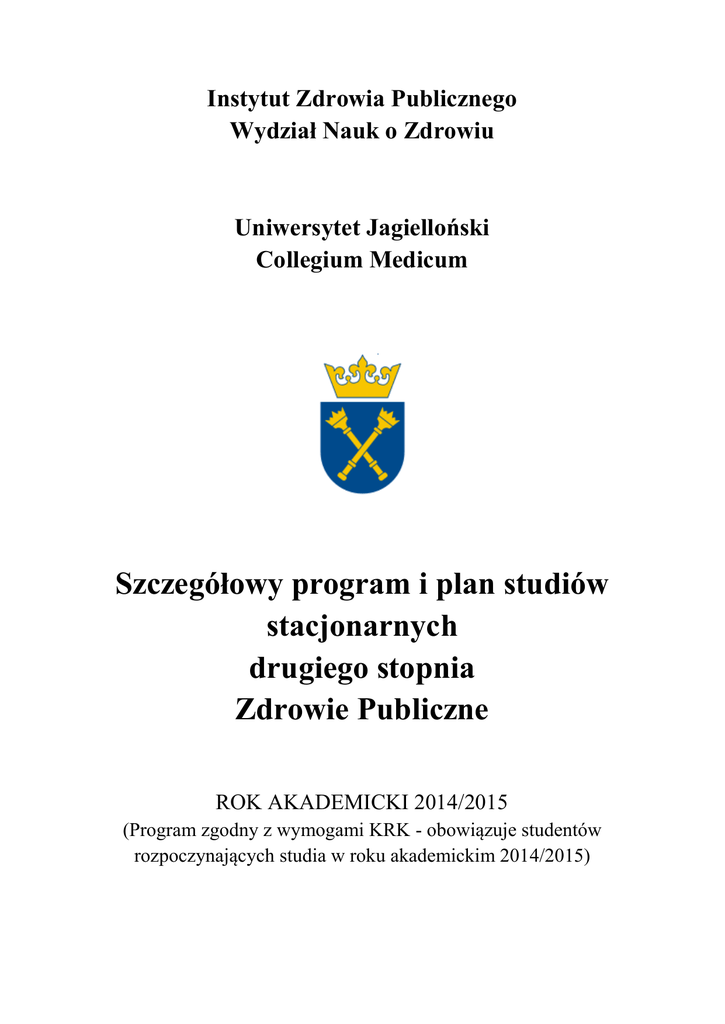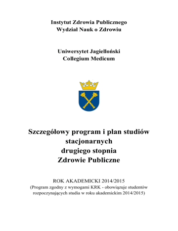 Instytut Zdrowia Publicznego Wydział Nauk o Zdrowiu Uniwersytet Jagielloński Collegium Medicum Szczegółowy program i plan studiów stacjonarnych drugiego stopnia Zdrowie Publiczne ROK AKADEMICKI 2014/2015 (Program zgodny z wymogami KRK - obowiązuje studentów rozpoczynających studia w roku akademickim 2014/2015) Dyrekcja Instytutu Zdrowia Publicznego: Prof. dr hab. Włodzimierz Cezary Włodarczyk – Dyrektor Dr Christoph Sowada – Zastępca Dyrektora Jednostki Instytutu Zdrowia Publicznego: Zakład Ekonomiki Zdrowia i Zabezpieczenia Społecznego, Kierownik: prof. dr hab. Stanisława Golinowska Zakład Epidemiologii i Badań Populacyjnych, Kierownik: prof. dr hab. med. Andrzej Pająk Zakład Polityki Zdrowotnej i Zarządzania, Kierownik: prof. dr hab. Włodzimierz Cezary Włodarczyk Zakład Żywienia Człowieka, Kierownika: prof. dr hab. Małgorzata Schlegel-Zawadzka Zakład Informacji Naukowej, p.o. Kierownika: dr Barbara Niedźwiedzka Zakład Gospodarki Lekiem, Kierownik: prof. dr hab. Andrzej Pilc Zakład Promocji Zdrowia, p.o. Kierownika: dr Mariusz Duplaga Zakład Zdrowia i Środowiska, Kierownik: dr hab. Grażyna Jasieńska, prof. UJ Zakład Medycznych Systemów Informacyjnych, Kierownik: dr hab. Wojciech Trąbka Zespół ds. Organizacji Dydaktyki i Programów Nauczania Instytutu Zdrowia Publicznego: Przewodniczący – dr hab. Grażyna Jasieńska, prof. UJ dr Ewa Kocot dr Christoph Sowada mgr Anna Szetela dr Roman Topór-Mądry dr Andrzej Galbarczyk dr Michał Seweryn dr Mariusz Duplaga lic. Maciej Burski Redaktor dokumentu: dr Christoph Sowada Szczegółowy program i plan studiów stacjonarnych drugiego stopnia Zdrowie Publiczne przyjęty uchwałą Rady Instytutu Zdrowia Publicznego z dnia 11 grudnia 2013 r. Przewodniczący Rady Instytutu Zdrowia Publicznego Dr hab. Grażyna Jasieńska, prof. UJ Odpowiedzialność za opis modułu i treści nauczania zawarte w sylabusach ponoszą osoby prowadzące moduły. 2 W ROKU AKADEMICKIM 2014/2015 ZAJĘCIA PROWADZONE BĘDĄ NA ROKU I. 3 Nazwa Wydziału Nazwa kierunku studiów Określenie obszaru kształcenia/obszarów kształcenia, z których został wyodrębniony kierunek studiów, dla którego tworzony jest program kształcenia Określenie dziedzin nauki lub sztuki oraz dyscyplin naukowych lub artystycznych, do których odnoszą się efekty kształcenia Poziom kształcenia Profil kształcenia Forma studiów Język Kierownik studiów na danym kierunku lub inna odpowiedzialna osoba Tytuł zawodowy uzyskiwany przez absolwenta Możliwości dalszego kształcenia Ogólne cele kształcenia na kierunku studiów o określonym poziomie i profilu kształcenia Wydział Nauk o Zdrowiu Zdrowie Publiczne, Ścieżki specjalizacyjne: 1) Programy zdrowotne, 2) Zarządzanie w ochronie zdrowia, 3) Health Economics and Governance of Health System Obszar nauk medycznych i nauk o zdrowiu oraz nauk o kulturze fizycznej (50% punktów ECTS) Obszar nauk społecznych (50% punktów ECTS) dziedzina nauk społecznych: - nauki o polityce publicznej dziedzina nauk ekonomicznych: - ekonomia - finanse - nauki o zarządzaniu dziedzina nauk prawnych: - nauki o administracji - prawo dziedzina nauk o zdrowiu studia drugiego stopnia profil ogólnoakademicki studia stacjonarne studia prowadzone w języku polskim i częściowo w języku angielskim Dr Christoph Sowada Dr Roman Topór-Mądry - koordynator magister studia trzeciego stopnia, studia podyplomowe Nabycie umiejętności umożliwiających podjęcie pracy na stanowiskach kierowniczych i stanowiskach samodzielnych w programach ochrony zdrowia, promocji zdrowia, profilaktyki itp., a także na stanowiskach w jednostkach administracyjnych opieki zdrowotnej, inspekcji sanitarnej i jednostek świadczących usługi zdrowotne. Przygotowanie do dalszego szkolenia na studiach trzeciego stopnia ze szczególnym uwzględnieniem umiejętności dokonywania przeglądu i krytycznej oceny informacji/informacji naukowej. W wyniku realizacji programu studiów student: Prezentuje pogłębioną wiedzę z zakresu rozpoznawania podstawowych zagrożeń zdrowia ludności związanych z jakością środowiska, stylem życia oraz innymi czynnikami ryzyka zdrowotnego. Identyfikuje bariery we wdrażaniu edukacji zdrowotnej w populacji, bazując na teoriach zmian społecznych oraz stosuje właściwe metody nauczania i umiejętności komunikacyjne w procesie dydaktycznym Wykazuje się wiedzą dotyczącą znajomości zasad tworzenia i realizowania strategii zdrowia publicznego, polityki zdrowotnej i społecznej na poziomie lokalnym, 4 krajowym i europejskim Ma pogłębioną i rozszerzoną wiedzę w zakresie zagadnień prawno-ekonomicznych w aspekcie funkcjonowania sektora ochrony zdrowia i podmiotów gospodarczych w nim działających. Posiada umiejętność efektywnego działania i wykorzystywania procedur w sytuacji kryzysowej Potrafi przeprowadzić krytyczną analizę i interpretację ekspertyz, raportów z zakresu polityki zdrowotnej, ekonomiki zdrowia, stanu zdrowia społeczeństwa Umie samodzielnie zdobywać wiedzę oraz podejmować autonomiczne działania zmierzające do rozwijania zdolności kierowania własną karierą zawodową Zgodnie ze statutem Uniwersytet Jagielloński jest powołany do kształcenia i wychowywania oraz prowadzenia badań naukowych, przygotowuje ludzi dojrzałych do samodzielnego rozwiązywania zadań i uczestniczy w rozwoju m.in. ochrony zdrowia. Kształcenie na studiach drugiego stopnia Zdrowie Publiczne wpisuje się w kluczowe zadania uczelni poprzez przygotowywanie swoich studentów do sprostania w przyszłej pracy zawodowej wyzwaniom sektora ochrony zdrowia. Brak programów o podobnie zdefiniowanych celach i efektach kształcenia. Związek kształcenia na kierunku studiów o określonym poziomie i profilu kształcenia z misją i strategią uczelni Różnice w stosunku do innych programów o podobnie zdefiniowanych celach i efektach kształcenia prowadzonych na uczelni Możliwości zatrudnienia Wymagania wstępne obo
