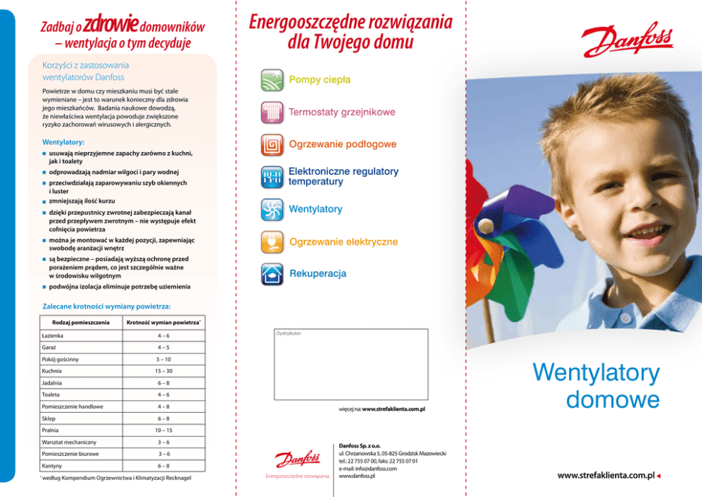 zdrowie Zadbaj o domowników – wentylacja o tym decyduje Korzyści z zastosowania wentylatorów Danfoss Energooszczędne rozwiązania dla Twojego domu Pompy ciepła Powietrze w domu czy mieszkaniu musi być stale wymieniane – jest to warunek konieczny dla zdrowia jego mieszkańców. Badania naukowe dowodzą, że niewłaściwa wentylacja powoduje zwiększone ryzyko zachorowań wirusowych i alergicznych. Wentylatory: usuwają nieprzyjemne zapachy zarówno z kuchni, jak i toalety n odprowadzają nadmiar wilgoci i pary wodnej Termostaty grzejnikowe Ogrzewanie podłogowe n przeciwdziałają zaparowywaniu szyb okiennych i luster n zmniejszają ilość kurzu n dzięki przepustnicy zwrotnej zabezpieczają kanał przed przepływem zwrotnym – nie występuje efekt cofnięcia powietrza n można je montować w każdej pozycji, zapewniając swobodę aranżacji wnętrz n są bezpieczne – posiadają wyższą ochronę przed porażeniem prądem, co jest szczególnie ważne w środowisku wilgotnym n podwójna izolacja eliminuje potrzebę uziemienia n Elektroniczne regulatory temperatury Wentylatory Ogrzewanie elektryczne Rekuperacja Zalecane krotności wymiany powietrza: Rodzaj pomieszczenia * Krotność wymian powietrza* Łazienka 4–6 Garaż 4–5 Pokój gościnny 5 – 10 Kuchnia 15 – 30 Jadalnia 6–8 Toaleta 4–6 Pomieszczenie handlowe 4–8 Sklep 6–8 Pralnia 10 – 15 Warsztat mechaniczny 3–6 Pomieszczenie biurowe 3–6 Kantyny 6–8 według Kompendium Ogrzewnictwa i Klimatyzacji Recknagel Dystrybutor: więcej na: www.strefaklienta.com.pl Energooszczędne rozwiązania Danfoss Sp. z o.o. ul. Chrzanowska 5, 05-825 Grodzisk Mazowiecki tel.: 22 755 07 00, faks: 22 755 07 01 e-mail: [email protected] www.danfoss.pl Wentylatory domowe www.strefaklienta.com.pl Wentylatory MURO PLUS Wentylatory E-STYLE Wentylatory E-SMILE typ średnica kanału zdjęcie standard opóźnienie regulowane E-SMILE 100 100 mm E-SMILE 100 CMT 100 mm E-SMILE 100 CMHT 100 mm E-SMILE 100 MHY SMART 100 mm E-SMILE 100 2S 100 mm E-STYLE 100 100 mm E-STYLE 100 T 100 mm l E-STYLE 100 HT 100 mm l E-STYLE 100 PIR 100 mm SUPER C IC H Y czujnik ruchu automatyczna żaluzja wersja dwubiegowa nr katalogowy wydajność max. [m³/h] pobór mocy [W] 2SM20000 90 7,5 l 2SM20020 90/60 7,5/5 l l 2SM20040 90/60 7,5/5 l prędkość zależy od wilgotności 2SM20060 90 do 7,5 l 2SM20080 90/60 7,5/5 l l l l l l E-STYLE 120 120 mm E-STYLE 120 T 120 mm l E-STYLE 120 HT 120 mm l E-STYLE 120 PIR 120 mm l l l E-STYLE 150 150 mm E-STYLE 150 T 150 mm l E-STYLE 150 HT 150 mm l E-STYLE 150 PIR 150 mm l l l MURO 100 100 mm MURO 100 T 100 mm l l l MURO 100 HT 100 mm MURO 100 A 100 mm MURO 100 AT 100 mm MURO 120 120 mm MURO 120 T 120 mm l MURO 120 HT 120 mm l l l l l l MURO 150 150 mm MURO 150 T 150 mm l MURO 150 HT 150 mm l Opóźnienie czasowe – Zastosowanie opóźnienia czasowego np. w toalecie, umożliwia dodatkowe przewietrzenie pomieszczenia po wyjściu użytkownika. Pozwala to na usunięcie nieprzyjemnych zapachów i nadmiaru wilgoci. Funkcję tę warto wykorzystać, gdy chcemy aby wentylator pracował jeszcze przez pewien określony czas, od chwili wyłączenia oświetlenia w pomieszczeniu. Możliwość regulacji opóźnienia obejmuje zakres od 3 do 25 minut. Wersja dwubiegowa – umożliwia pracę wentylatora na dwóch różnych prędkościach obrotowych. Tam gdzie nie jest wymagana maksymalna wydajność higrostat regulowany l l l możemy wykorzystać wolniejszy bieg i zredukować zużycie energii. Higrostat – Pozwala na pozbycie się problemu nadmiaru wilgoci szczególnie w pomieszczeniach t.j. piwnica, pralnia, łazienka. Uzależnia on pracę wentylatora od poziomu wilgotności względnej w pomieszczeniu. Wzrost wilgotności powyżej ustawionej przez nas wartości powoduje samoczynne włączenie się wentylatora. Zakres nastawy wilgotności, przy której następne włączenie wentylatora typu HT wynosi 40%-80%, a czas pracy 3-25 minut. 2MU70150 95 11 2MU70160 95 11 2MU70170 95 11 2MU70280 95 11 2MU72150 165 15 2MU72160 165 15 2MU72170 165 15 2MU72280 165 15 2MU75150 290 26 2MU75160 290 26 2MU75170 290 26 2MU75280 290 26 2MU40760 95 14 2MU40800 95 14 2MU40820 95 14 2MU40840 95 14 2MU40860 95 14 2MU42640 180 20 2MU42680 180 20 2MU42700 180 20 2MU45740 320 25 2MU45780 320 25 2MU45800 320 25 Czujnik ruchu – Polecany jest szczególnie tam, gdzie nie można zastosować funkcji sprzężenia z włącznikiem światła np. widny garaż. Uzależnia on pracę wentylatora od obecności osób w zasięgu czujnika P.I.R. Po załączeniu wentylator pracuje przez 7 minut. Automatyczna żaluzja – zabezpiecza przed nawiewem zimnego powietrza z zewnątrz, szczególnie w okresie zimy lub przy wietrznej pogodzie. Uruchomienie wentylatora powoduje automatyczne otwarcie żaluzji, a zakończenie pracy, jej automatyczne zamknięcie.