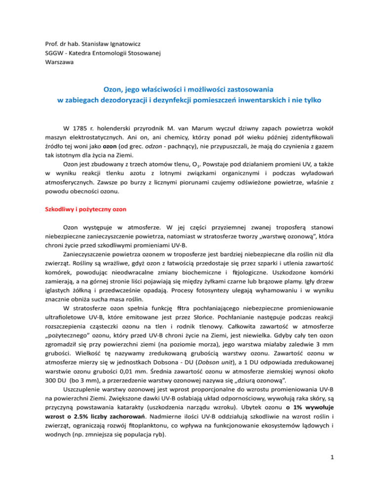 Prof. dr hab. Stanisław Ignatowicz SGGW - Katedra Entomologii Stosowanej Warszawa Ozon, jego właściwości i możliwości zastosowania w zabiegach dezodoryzacji i dezynfekcji pomieszczeń inwentarskich i nie tylko W 1785 r. holenderski przyrodnik M. van Marum wyczuł dziwny zapach powietrza wokół maszyn elektrostatycznych. Ani on, ani chemicy, którzy ponad pół wieku później zidentyfkowali źródło tej woni jako ozon (od grec. odzon - pachnący), nie przypuszczali, że mają do czynienia z gazem tak istotnym dla życia na Ziemi. Ozon jest zbudowany z trzech atomów tlenu, O 3. Powstaje pod działaniem promieni UV, a także w wyniku reakcji tlenku azotu z lotnymi związkami organicznymi i podczas wyładowań atmosferycznych. Zawsze po burzy z licznymi piorunami czujemy odświeżone powietrze, właśnie z powodu obecności ozonu. Szkodliwy i pożyteczny ozon Ozon występuje w atmosferze. W jej części przyziemnej zwanej troposferą stanowi niebezpieczne zanieczyszczenie powietrza, natomiast w stratosferze tworzy „warstwę ozonową”, która chroni życie przed szkodliwymi promieniami UV-B. Zanieczyszczenie powietrza ozonem w troposferze jest bardziej niebezpieczne dla roślin niż dla zwierząt. Rośliny są wrażliwe, gdyż ozon z łatwością przedostaje się przez szparki i utlenia zawartość komórek, powodując nieodwracalne zmiany biochemiczne i fzjologiczne. Uszkodzone komórki zamierają, a na górnej stronie liści pojawiają się między żyłkami czarne lub brązowe plamy. Igły drzew iglastych żółkną i przedwcześnie opadają. Procesy fotosyntezy ulegają wyhamowaniu i w wyniku znacznie obniża sucha masa roślin. W stratosferze ozon spełnia funkcję fltra pochłaniającego niebezpieczne promieniowanie ultrafoletowe UV-B, które emitowane jest przez Słońce. Pochłanianie następuje podczas reakcji rozszczepienia cząsteczki ozonu na tlen i rodnik tlenowy. Całkowita zawartość w atmosferze „pożytecznego” ozonu, który przed UV-B chroni życie na Ziemi, jest niewielka. Gdyby cały ten ozon zgromadził się przy powierzchni ziemi (na poziomie morza), jego warstwa miałaby zaledwie 3 mm grubości. Wielkość tę nazywamy zredukowaną grubością warstwy ozonu. Zawartość ozonu w atmosferze mierzy się w jednostkach Dobsona - DU (Dobson unit), a 1 DU odpowiada zredukowanej warstwie ozonu grubości 0,01 mm. Średnia zawartość ozonu w atmosferze ziemskiej wynosi około 300 DU (bo 3 mm), a przerzedzenie warstwy ozonowej nazywa się „dziurą ozonową”. Uszczuplenie warstwy ozonowej jest wprost proporcjonalne do wzrostu promieniowania UV-B na powierzchni Ziemi. Zwiększone dawki UV-B osłabiają układ odpornościowy, wywołują raka skóry, są przyczyną powstawania katarakty (uszkodzenia narządu wzroku). Ubytek ozonu o 1% wywołuje wzrost o 2.5% liczby zachorowań. Nadmierne ilości UV-B oddziałują szkodliwie na wzrost roślin i zwierząt, ograniczają rozwój ftoplanktonu, co wpływa na funkcjonowanie ekosystemów lądowych i wodnych (np. zmniejsza się populacja ryb). 1 Szacuje się, że w ostatnich latach „dziura ozonowa” powiększyła się znacznie, a warstwa ozonowa zmniejszyła się o 4-6%, dlatego w ramach akcji jej ochrony wycofaliśmy freony z lodówek, a w r. 2005 skuteczny fumigant - bromek metylu z zastosowań w rolnictwie, gdyż prawie 60x bardziej skutecznie niszczył ozon w stratosferze niż freony. Ozon w zabiegach dezynfekcji i dezynsekcji może nawet zastąpić bromek metylu, który go niszczył w stratosferze (!). Właściwości ozonu Ozon jest gazem niebieskim, cięższym od powietrza. Występuje w trzech stanach skupienia. Stały ozon topi się w temperaturze -192,7 oC, temperatura wrzenia cieczy wynosi -111,9 oC, a gęstość gazu w temp. 0oC określono jako 2,144 g/dm3. Ozon około 10 razy lepiej rozpuszcza się w wodzie niż tlen O2. Jego cząsteczka O3 jest nietrwała. Okres połowicznego rozkładu wynosi tylko 20-50 minut w powietrzu i 1-10 minut w wodzie. Szybko się wtedy rozpada na tlen (O 2) i jednoatomowy (O), który jest bardzo silnym utleniaczem, silniejszym niż tlen dwuatomowy. Przyłącza się do podwójnego wiązania w cząsteczkach nienasyconych związków organicznych, drastycznie zmieniając ich właściwości. Generatory ozonu Gazowy ozon można wytwarzać na miejscu w przenośnych generatorach ozonu, zwanych też ozonatorami, w których następują ciche wyładowania elektryczne w czystym tlenie lub w powietrzu. Pospolite generatory ozonu wytwarzają z otaczającego powietrza od 5 g do 20 g ozonu na godzinę. Najważniejszą częścią każdego ozonatora jest elektroda wyładowań koronowych, dzięki której możliwe jest uzyskanie wysokich stężeń ozonu w krótkim czasie. Np. w generatorze trioxygen 20 zastosowano dwie elektrody wyładowań koronowych najnowszej generacji, dzięki którym uzyskano bardzo wysoką wydajność urządzenia. Możliwość wyłączenia jednej elektrody sprawia, że generator ozonu obniża swoją wydajność, jeśli taka potrzeba. Każdy ozonator posiada zamontowany wentylator o dużym przepływie powietrza. Wytworzony ozon jest równomiernie rozprowadzany po pomieszczeniu, bez potrzeby używania dodatkowych dmuchaw. Zastosowania ozonu Ozon należy do najsilniejszych utleniaczy, dlatego znalazł szerokie zastosowanie w zabiegach dezynfekcji, dezynsekcji i dezodoryzacji, a także usługach odbarwiania, czy usuwania przykrego smaku z niektórych produktów żywnościowych. Aplikowany jest w formie gazowej (częściej) lub ozonowanej wody. Silny utleniacz ma największe zastosowanie w zabiegach dezodoryzacji, gdyż zmienia właściwości najróżniejszych związków organicznych decydujących o przykrych zapachach. Nie maskuje źródła odoru, ale go trwale usuwa. Dezodoryzację ozonem można przeprowadzić w pomieszczeniach mieszkalnych, obiektach użytku publicznego i w budynkach inwentarskich w celu usunięcia przykrych lub obcych zapachów. Po zakupie nowych mebli ich obcy