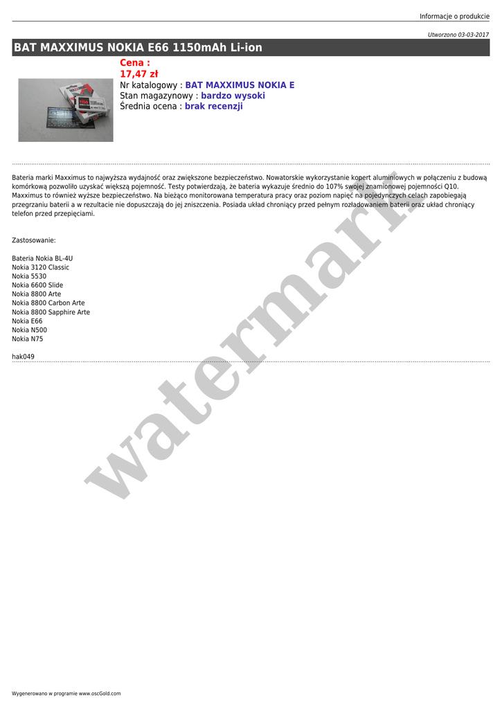 Informacje o produkcie Utworzono 03-03-2017 BAT MAXXIMUS NOKIA E66 1150mAh Li-ion Cena : 17,47 zł Nr katalogowy : BAT MAXXIMUS NOKIA E Stan magazynowy : bardzo wysoki Średnia ocena : brak recenzji Zastosowanie: Bateria Nokia BL-4U Nokia 3120 Classic Nokia 5530 Nokia 6600 Slide Nokia 8800 Arte Nokia 8800 Carbon Arte Nokia 8800 Sapphire Arte Nokia E66 Nokia N500 Nokia N75 w at hak049 er m ar k Bateria marki Maxximus to najwyższa wydajność oraz zwiększone bezpieczeństwo. Nowatorskie wykorzystanie kopert aluminiowych w połączeniu z budową komórkową pozwoliło uzyskać większą pojemność. Testy potwierdzają, że bateria wykazuje średnio do 107% swojej znamionowej pojemności Q10. Maxximus to również wyższe bezpieczeństwo. Na bieżąco monitorowana temperatura pracy oraz poziom napięć na pojedynczych celach zapobiegają przegrzaniu baterii a w rezultacie nie dopuszczają do jej zniszczenia. Posiada układ chroniący przed pełnym rozładowaniem baterii oraz układ chroniący telefon przed przepięciami. Wygenerowano w programie www.oscGold.com