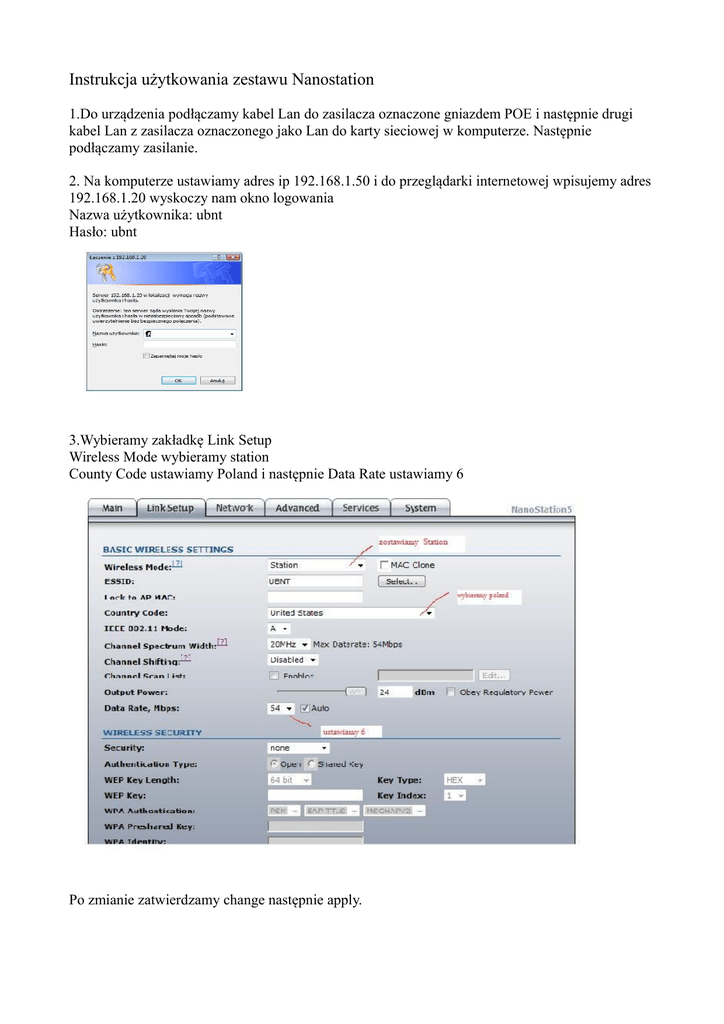 Instrukcja użytkowania zestawu Nanostation 1.Do urządzenia podłączamy kabel Lan do zasilacza oznaczone gniazdem POE i następnie drugi kabel Lan z zasilacza oznaczonego jako Lan do karty sieciowej w komputerze. Następnie podłączamy zasilanie. 2. Na komputerze ustawiamy adres ip 192.168.1.50 i do przeglądarki internetowej wpisujemy adres 192.168.1.20 wyskoczy nam okno logowania Nazwa użytkownika: ubnt Hasło: ubnt 3.Wybieramy zakładkę Link Setup Wireless Mode wybieramy station County Code ustawiamy Poland i następnie Data Rate ustawiamy 6 Po zmianie zatwierdzamy change następnie apply. 4.Następnie przechodzimy na zakładkę Network W polu Network Mode wybieramy Router następnie WLAN IP Addres ustawiamy Static 5. W zakładce Network następnie uzupełniamy wartości podane jak na rysunku 6. W zakładce advanced ustawiamy Antenna Settings na External i ACK Time Out ustawiamy wartość 240 następnie klikamy change i apply 7. Następnie przechodzimy na zakładkę Link Setup i klikamy select Otworzy się okienko w którym pojawi się lista nadajników z której spisujemy MAC address najmocniejszego nadajnika bestnet (największa wartość sygnału oznaczona jest wartością ujemną i powinna być zbliżona do wartości -60) Po skonfigurowaniu urządzenia na komputerze ustawiamy adresy ip automatycznie Z zakładki Main podajemy konsultatnowi WLAN MAC następnie podajemy Mac adres z nadajnika bestnet który wyświetli się w zakładce Link Setup. 8. Aktywacja W celu dokonania aktywacji należy skontaktować się telefonicznie z konsultantem w godzinach od 10:00 do 16:00 od Poniedziałku do Piątku pod numerem telefonu 717170530 wew. 0 J E Ś LI S T R O N A U R Z Ą DZ E NI A S I Ę NI E O TWIR A N A L E Ż Y S P R AW D ZI Ć C Z Y J E S T Z AI N S TA L O WA N A K A R TA S I E C I O WA , W K OM P U T E R Z E , D L A S Y S T E M U WI ND OW S X P W Y BI E R AM Y PA N E L S T E R O WA NIA/PO Ł A C Z E NI A S I E CI OW E , N A S T Ę P NI E P OWI N N A B Y Ć I KO N K A P O Ł Ą C Z E NI E L O K A L N E K o nfi g ur a c j a ko m p u t e r a d o pr a c y z urz ą dz e ni e m (krok o p c j o n a l ny). DLA Windows XP: Na początku należy ustawić połączenie lokalne sieciowe komputera tak, aby automatycznie pobierało adres IP. Większość komputerów posiada to ustawienie domyślnie. Należy wykonać następujące czynności: nacisnąć przycisk S t a r t , wybrać P a n e l S t e r o w a ni a , wybrać P oł ą c z e ni a s i e c i o w e (jeśli brak takiej ikony, należy w lewym górnym rogu wybrać opcję P r z e ł ą c z d o w id o k u kl a s y c z n e g o) . W otwartym oknie znajduje się akapit S i e ć L A N lub s z y b ki int e r n e t , a w nim ikona P oł ą c z e ni e lok a ln e . Należy wybrać tę ikonę prawym przyciskiem myszy, a z menu kontekstowego wybrać Wł a ś c i w o ś c i . Po otwarciu nowego okna należy dwukrotnie kliknąć napis P r o t o k ół int e r n e t o w y (T C P/IP). Otworzy się kolejne okno, w którym należy zaznaczyć, jeśli jest inaczej: U z y s k a j a dr e s I P a u t o m a t y c z ni e oraz U z y s k a j a dr e s y s e r w e r ó w D N S a u t o m a t y c z ni e . Wszystkie otwarte okna należy zamknąć korzystając z przycisków O K . D L A S Y S T E M U Wind o w s VI S TA : Konfiguracja sieci TCP/IP - Windows Vista Windows pewno już sam zainstalował kartę sieciowa oraz wszystkie protokoły, wiec będzie trzeba trochę po nim "posprzątać" Przejdź do "Panel Sterowania" >> "Centrum sieci i odnajdywania" i wybierz "Zarządzaj połączeniami sieciowymi" a następnie "Połączenie lokalne" i "Właściwości". Następnie należy sprawdzić czy w właściwościach Protokołu Internetowego TCP/IP Wersji 4 jest wybrane U z y s k a j a dr e s I P a u t o m a t y c z ni e oraz U z y s k a j a dr e s y s e r w e r ó w D N S a u t o m a t y c z ni e . Wszystkie otwarte okna należy zamknąć korzystając z przycisków O K .