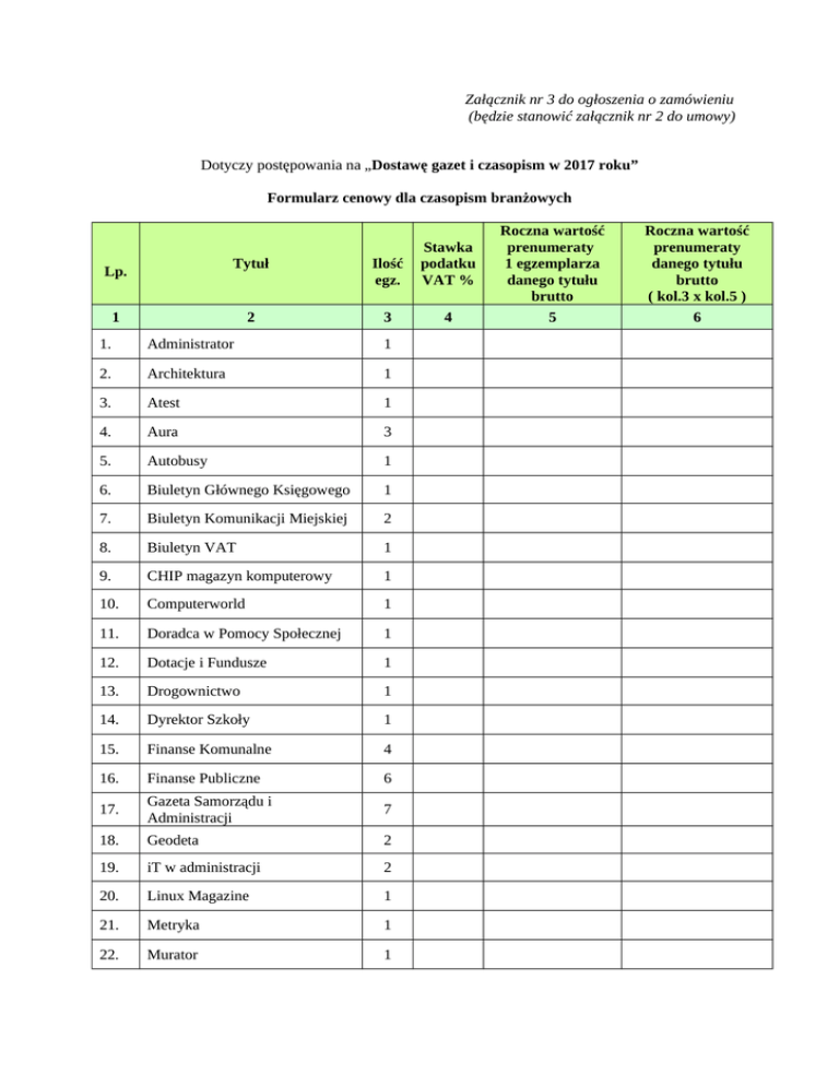 Załącznik nr 3 do ogłoszenia o zamówieniu (będzie stanowić załącznik nr 2 do umowy) Dotyczy postępowania na „Dostawę gazet i czasopism w 2017 roku” Formularz cenowy dla czasopism branżowych Lp. Tytuł Ilość egz. Stawka podatku VAT % 2 3 4 1 1. Administrator 1 2. Architektura 1 3. Atest 1 4. Aura 3 5. Autobusy 1 6. Biuletyn Głównego Księgowego 1 7. Biuletyn Komunikacji Miejskiej 2 8. Biuletyn VAT 1 9. CHIP magazyn komputerowy 1 10. Computerworld 1 11. Doradca w Pomocy Społecznej 1 12. Dotacje i Fundusze 1 13. Drogownictwo 1 14. Dyrektor Szkoły 1 15. Finanse Komunalne 4 16. Finanse Publiczne 6 17. Gazeta Samorządu i Administracji 7 18. Geodeta 2 19. iT w administracji 2 20. Linux Magazine 1 21. Metryka 1 22. Murator 1 Roczna wartość prenumeraty 1 egzemplarza danego tytułu brutto 5 Roczna wartość prenumeraty danego tytułu brutto ( kol.3 x kol.5 ) 6 23. Niebieska Linia 1 24. Niepełnosprawność i Rehabilitacja 1 25. Nieruchomości 2 26. Nowa Geodezja w Praktyce 1 27. Nowe Zeszyty Samorządowe. Opinie Prawne 1 28. Odpady Komunalne 1 29. Odpady i Środowisko 1 30. Orzecznictwo Naczelnego Sądu Administracyjnego i wojewódzkich sądów administracyjnych 1 31. Orzecznictwo Sądów Polskich 1 32. 33. Orzecznictwo Sądu Najwyższego. Izba Cywilna PC WORLD komputer z płytą DVD 1 1 34. Polskie Drogi (z bezpłatnym dodatkiem-Nawierzchnie Asfaltowe) 1 35. Poradnik Rachunkowości Budżetowej 3 36. Prawo Pomocy Publicznej 1 37. Przed Szkołą 1 38. Przegląd Geodezyjny 1 39. Przegląd Komunalny 1 40. Przegląd Obrony Cywilnej 1 41. Przegląd Podatków Lokalnych i Finansów samorządowych 2 42. Przetargi Publiczne 5 43. Rachunkowość Budżetowa 7 44. Renowacje i Zabytki 1 45. Samorząd Terytorialny 1 46. Spotkania z Zabytkami 1 47. Szkoła Jazdy 1 48. Świat Problemów 1 49. Terapia Uzależnienia i Współuzależnienia 1 50. Transport Miejski i Regionalny 2 51. Wiedza Obronna kwartalnik TWO 1 52. Wodociągi i Kanalizacja 1 53. Zamówienia Publiczne Doradca 5 54. 55. 56. Zeszyty Metodyczne Rachunkowości Zeszyty Problemowe kwartalnik TWO Zieleń Miejska 2 1 2 Wartość razem