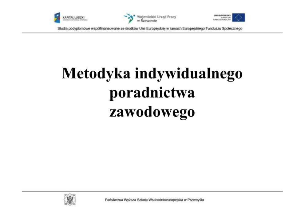 Metodyka indywidualnego poradnictwa zawodowego Doradztwo zawodowe R. Lamb określa je jako „proces, w którym doradca zawodowy pomaga klientowi w osiągnięciu lepszego zrozumienia samego siebie w odniesieniu do środowiska pracy, aby umoŜliwić mu realistyczny wybór lub zmianę zatrudnienia lub teŜ osiągnięcie właściwego dostosowania zawodowego” wg. E. Herr, S. Cramer jest to “proces w duŜej mierze werbalny, w którym doradca i klient (klienci) współpracują w dynamiczny sposóbi gdzie doradca wykorzystuje zachowania z szerokiego wachlarza metod w celu osiągnięcia przez klienta lepszego samozrozumienia oraz doprowadzenia do podejmowania przez klienta „dobrych” decyzji zawodowych, przy czym to klient odpowiedzialny jest za swoje działania” Zadania poradnictwa zawodowego - pomoc jednostce w osiągnięciu obiektywnej znajomości samego siebie - zwiększenie umiejętności obiektywnej oceny sytuacji w której znajduje się osoba poszukująca pracy - wyzwalanie aktywności i inicjatywy osób radzących się, a tym samym wspomaganie rozwiązywania problemów - doprowadzanie do podjęcia samodzielnej decyzji - długoterminowe planowanie drogi zawodowej - towarzyszenie i udzielanie wsparcia w procesie zmiany Zadania doradcy zawodowego w szkole: - wielostronna obserwacja ucznia - kształtowanie postaw ucznia dot. pracy, samego siebie, aspiracji zawodowych i Ŝyciowych - pomoc w odkrywaniu indywidualnych zdolności, predyspozycji - rozwijanie i utrwalanie cech pozytywnych - przeprowadzanie indywidualnych konsultacji z uczniami rodzicami w celu właściwego ukierunkowania wyboru zawodu - przekazanie informacji nt. zawodów, wymaganych zdolności, warunków pracy - przekazywanie informacji o szkołach przygotowujących do poszczególnych zawodów - przekazanie informacji o rynku pracy Metody i techniki stosowane w poradnictwie indywidualnym rozmowa doradcza wywiad behawioralny diagnoza kompetencji zawodowych aktywne słuchanie testy i kwestionariusze ćwiczenia na rozpoznawanie przekonań metody projekcyjne – case study metody plastyczne portfolio q-sort kreatywne techniki rozwiązywania problemów: - mapa myśli (Mind Maping) - analiza SMART - analiza SWOT Rozmowa doradcza Długofalowy proces, w którym doradca motywuje klient do pracy nad sobą. Cel rozmowy doradczej Stworzenie własnych rozwiązań uwzględnieniem: - uwarunkowań biologicznych - zainteresowań i predyspozycji - wpływu środowiska zawodowych/edukacyjnych z Rozmowa doradcza 1. doradca spostrzega klienta na tle jego uwarunkowań systemowych 2. doradca - klient umowa-kontrakt; 3. doradca pomaga klientowi sformułować cel i określić kierunek zmian; 4. doradca pracuje nad zwiększeniem zakresu świadomych działań klienta; 5. doradca proponując zadania do wykonania i ćwiczenia wymagające osobistego zaangaŜowania klienta; 6. doradca pomaga zachować spójność pomiędzy projektem zawodowym a planami Ŝyciowymi klienta; cd. rozmowy doradczej 7. klient sam moŜe dokonywać analizy swoich działań i oceniać realizację celów; 8. klient sam podejmuje decyzje ustalając własne priorytety i odkrywając hierarchię wartości; 9. doradca pracuje na zasobach i mocnych stronach klienta, ale nie oznacza to unikania tematów subiektywnie trudnych; 10. doradca stara się elastycznie dostosowywać do zmian w obrębie własnej roli zawodowej. Etapy prowadzenia rozmowy doradczej wg B. Wojtasik 1. przygotowanie się doradcy do przeprowadzenia rozmowy 2. pierwszy kontakt 3. ustalenie, kto ma problem i na czym on polega 4. zawarcie kontraktu między doradcą a radzącym się 5. budowanie relacji doradca – radzący się 6. zbieranie faktów oraz badanie pedagogiczne/psychologiczne 7. aktywizowanie radzącego się do zbierania informacji o zawodach i szkołach 8. konsultacje z rodzicami 9. dopasowywanie siebie do zawodu 10. zakończenie TWORZENIA I ZAWIERANIA KONTRAKTU Doradca powinien pamiętać przede wszystkim o potrzebie przejęcia odpowiedzialności przez klienta, sprecyzowania celu i istoty problemu. Warunki kontraktu - ustalenie celu spotkań doradczych - określenie form pracy z klientem - ustalenie miejsca spotkań - ustalenie czasu trwania rozmowy - określenie warunków odwołania spotkania - ustalenie częstotliwości spotkań - ustalenie sposobu komunikowania się pomiędzy spotkaniami - ustalenie czasu trwania procesu doradczego - uzyskanie zgody klienta na rejestrowanie spotkań - zobowiązanie doradcy do poufności 5 Kroków J. Enrighta 1. „świadomy wybór” 2. rzeczywisty problem klienta i jego istota 3. analiza moŜliwości rozwiązania problemu 4. przeciwdziałanie zakwestionowaniu osoby doradcy zawodowego 5. dyskontowanie wtórnego zysku Zakończenie procesu doradzania Jak klient rozumie to, co zrobił, aby rozwiązać problem? Jak blisko jest celu? Czy klient ma jasny obraz tego, co się wydarzyło, zmieniło w czasie spotkań? Czy klient moŜe skorzystać z wiedzy, umiejętności, w róŜnych obszarach swojej aktywności? Czy klient wie, co jest sygnałem zmian w jego Ŝyciu zawodowym? Czy klient wie, co jest sygnałem powrotu do dawnych schematów, zachowań i jak moŜe sobie z tym poradzić? Skuteczność porady doradczej zaleŜy od poznania ucznia w kontekście róŜnorodnych wyznaczników i obszarów wpływających na kształtowanie się jego roli zawodowej: - biologiczne uwarunkowania wyboru zawodu - zainteresowania, predyspozycje; - kwalifikacje, kompetencje, umiejętności; - środowisko: rodzina, rówieśnicy, szkoła; - umiejętność wyznaczania celów i wartości; - umiejętność podejmowania decyzji; Cel i planowanie w rozmowie doradczej Cechy poprawnie określonego celu: - cel jest pozytywny dla klienta - moŜliwy do opisania - moŜliwy do zaobserwowania - moŜliwy do osiągnięcia w niedalekiej przyszłości - związany z systemem wartości osoby - spostrzegany przez klienta jako wymagający wysiłku Kiedy klient zna swoje wartości moŜe zaplanować w zgodzie z sobą włas