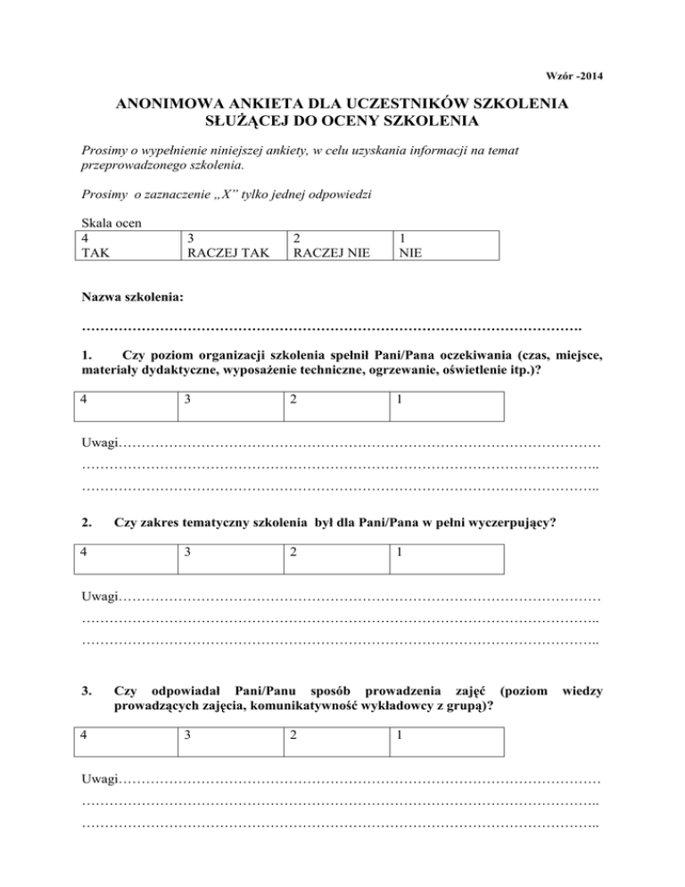 Wzór -2014 ANONIMOWA ANKIETA DLA UCZESTNIKÓW SZKOLENIA SŁUŻĄCEJ DO OCENY SZKOLENIA Prosimy o wypełnienie niniejszej ankiety, w celu uzyskania informacji na temat przeprowadzonego szkolenia. Prosimy o zaznaczenie „X” tylko jednej odpowiedzi Skala ocen 4 TAK 3 RACZEJ TAK 2 RACZEJ NIE 1 NIE Nazwa szkolenia: ………………………………………………………………………………………………. 1. Czy poziom organizacji szkolenia spełnił Pani/Pana oczekiwania (czas, miejsce, materiały dydaktyczne, wyposażenie techniczne, ogrzewanie, oświetlenie itp.)? 4 3 2 1 Uwagi…………………………………………………………………………………………… ………………………………………………………………………………………………….. ………………………………………………………………………………………………….. 2. 4 Czy zakres tematyczny szkolenia był dla Pani/Pana w pełni wyczerpujący? 3 2 1 Uwagi…………………………………………………………………………………………… ………………………………………………………………………………………………….. ………………………………………………………………………………………………….. 3. 4 Czy odpowiadał Pani/Panu sposób prowadzenia zajęć (poziom prowadzących zajęcia, komunikatywność wykładowcy z grupą)? 3 2 wiedzy 1 Uwagi…………………………………………………………………………………………… ………………………………………………………………………………………………….. ………………………………………………………………………………………………….. 4. 4 Czy poleciłaby/łby Pani/Pan to szkolenie innym osobom? 3 2 1 Uwagi…………………………………………………………………………………………… ………………………………………………………………………………………………….. ………………………………………………………………………………………………….. 5. Sugestie oraz uwagi Pani/Pana skierowane do organizatora szkolenia ………………………………………………………………………………………………… ………………………………………………………………………………………………… ………………………………………………………………………………………………… ………………………………………………………………………………………………… ………………………………………………………………………………………………… ………………………………………………………………………………………………… ………………………………………………………………………………………………… ………………………………………………………………………………………………… ………………………………………………………………………………………………… ………………………………………………………………………………………………… Dziękujemy za wypełnienie ankiety