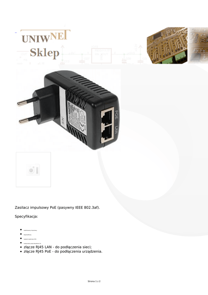 Zasilacz impulsowy PoE (pasywny IEEE 802.3af). Specyfikacja: stabilizowany impulsowy; dogniazdkowy; napięcie wyjściowe 24V; maksymalny prąd obciążenia 1A; złącze RJ45 LAN - do podłączenia sieci; złącze RJ45 PoE - do podłączenia urządzenia. Strona 1 z 2 Strona 2 z 2