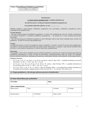 Numer Identyfikacji Podatkowej podatnika Oświadczenie o wyborze formy opodatkowania w podatku dochodowym od osób fizycznych z tytułu prowadzenia działalności gospodarczej oraz sposobu wpłacania zaliczek na rok ……………….. Składają podatnicy rozpoczynający działalność gospodarczą oraz prowadzący działalność gospodarczą, którzy zmieniają formę opodatkowania. Termin złożenia: - dla osób rozpoczynających działalność gospodarczą w trakcie roku podatkowego, które nie złożyły oświadczenia na podstawie przepisów o swobodzie działalności gospodarczej – nie później niż w dniu uzyskania pierwszego przychodu, - dla osób prowadzących działalność gospodarczą, które dokonują wyboru innej formy opodatkowania na dany rok podatkowy - do dnia 20 stycznia roku podatkowego. Uwaga: Oświadczenie dotyczy również lat następnych, chyba że podatnik w terminie do dnia 20 stycznia roku podatkowego, zawiadomi w formie pisemnej właściwego naczelnika urzędu skarbowego o rezygnacji z tego sposobu opodatkowania lub złoży w tym terminie oświadczenie o wyborze innej formy opodatkowania. Pouczenie: W przypadku wyboru formy opodatkowania przychodów/dochodów uzyskiwanych z tytułu prowadzenia pozarolniczej działalności gospodarczej w formie ryczałtu od przychodów ewidencjonowanych bądź wg stawki 19% (podatek liniowy) brak jest możliwości wspólnego rozliczania się z małżonkiem lub jako osoba samotnie wychowująca dziecko. Podstawa Prawna: − art. 9 a ust. 1, art. 27, art. 44 ust. 3, art. 44 ust. 3g ustawy z dnia 26 lipca 1991 r. o podatku dochodowym od osób fizycznych ( tj. Dz. U. z 2012, poz. 361, ze zm.), − art. 9 a ust. 2, art. 30 c, art. 44 ust. 3f, art. 44 ust. 3h ustawy z dnia 26 lipca 1991 r. o podatku dochodowym od osób fizycznych (tj. Dz. U. z 2012 , poz. 361, ze zm.), − art. 9, art. 21ust. 1, art. 21 ust. 1a ustawy z dnia 20 listopada 1998 r. o zryczałtowanym podatku dochodowym od niektórych przychodów osiąganych przez osoby fizyczne (Dz. U Nr 144, poz. 930 z późn. zm.), A. Organ podatkowy, do którego adresowane jest oświadczenie: B. Dane identyfikacyjne podatnika: Nazwisko: Imię: Adres zamieszkania: Miejscowość: Kod pocztowy: Ulica: Nr domu: Nr telefonu: Nr lokalu: Adres e-mail:. 1 C. Dane dotyczące działalności gospodarczej: C.1. Działalność prowadzona samodzielnie REGON: Podstawowy rodzaj działalności: Data rozpoczęcia działalności: Data uzyskania pierwszego przychodu: Adres siedziby: Miejsce wykonywania działalności: C.2. Działalność prowadzona w formie spółki Forma prawna Nazwa KRS: NIP: Podstawowy rodzaj działalności: Data rozpoczęcia działalności: Data uzyskania pierwszego przychodu: Adres siedziby: Miejsce wykonywania działalności: D. Oświadczenie o wyborze formy opodatkowania: Oświadczam , że począwszy od roku ………………… rozliczenie w podatku dochodowym od osób fizycznych wybieram w formie (należy zaznaczyć właściwy kwadrat): □ ryczałtu od przychodów ewidencjonowanych, □ wg skali podatkowej 18% i 32% (na zasadach określonych w art. 27 ustawy o p. d .o .f.), □ wg stawki liniowej 19% (na zasadach określonych w art. 30 c ustawy o p. d. o .f.) E. Sposób wpłacania zaliczek/ ryczałtu: □ płatne/płatny miesięcznie □ Płatne/ płatny kwartalnie F. Zmiana właściwości urzędu skarbowego: Poprzednio właściwy Naczelnik Urzędu Skarbowego G. Oświadczenie i podpis podatnika: Oświadczam, że spełniam warunki do wyboru wskazanej w niniejszym formularzu formy opodatkowania oraz sposobu wpłacania zaliczek. Imię i nazwisko Data, podpis H. Podpis osoby reprezentującej podatnika Imię i nazwisko Data, podpis 2