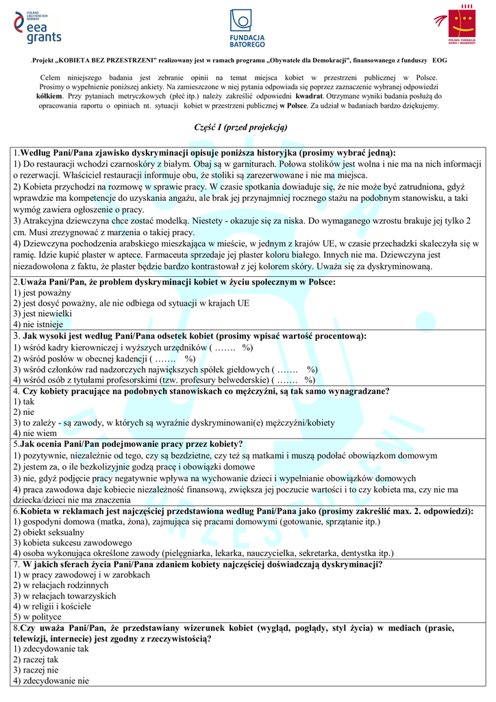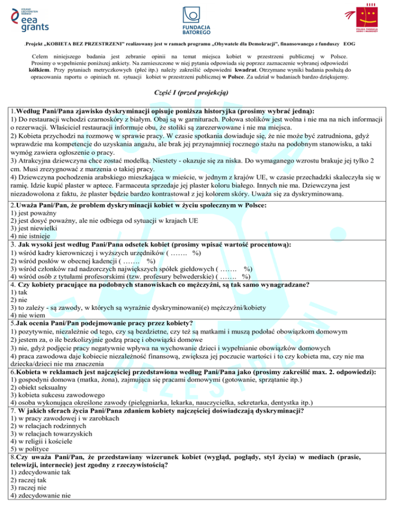 .Projekt „KOBIETA BEZ PRZESTRZENI” realizowany jest w ramach programu „Obywatele dla Demokracji”, finansowanego z funduszy EOG Celem niniejszego badania jest zebranie opinii na temat miejsca kobiet w przestrzeni publicznej w Polsce. Prosimy o wypełnienie poniższej ankiety. Na zamieszczone w niej pytania odpowiada się poprzez zaznaczenie wybranej odpowiedzi kółkiem. Przy pytaniach metryczkowych (płeć itp.) należy zakreślić odpowiedni kwadrat. Otrzymane wyniki badania posłużą do opracowania raportu o opiniach nt. sytuacji kobiet w przestrzeni publicznej w Polsce. Za udział w badaniach bardzo dziękujemy. Część I (przed projekcją) 1.Według Pani/Pana zjawisko dyskryminacji opisuje poniższa historyjka (prosimy wybrać jedną): 1) Do restauracji wchodzi czarnoskóry z białym. Obaj są w garniturach. Połowa stolików jest wolna i nie ma na nich informacji o rezerwacji. Właściciel restauracji informuje obu, że stoliki są zarezerwowane i nie ma miejsca. 2) Kobieta przychodzi na rozmowę w sprawie pracy. W czasie spotkania dowiaduje się, że nie może być zatrudniona, gdyż wprawdzie ma kompetencje do uzyskania angażu, ale brak jej przynajmniej rocznego stażu na podobnym stanowisku, a taki wymóg zawiera ogłoszenie o pracy. 3) Atrakcyjna dziewczyna chce zostać modelką. Niestety - okazuje się za niska. Do wymaganego wzrostu brakuje jej tylko 2 cm. Musi zrezygnować z marzenia o takiej pracy. 4) Dziewczyna pochodzenia arabskiego mieszkająca w mieście, w jednym z krajów UE, w czasie przechadzki skaleczyła się w ramię. Idzie kupić plaster w aptece. Farmaceuta sprzedaje jej plaster koloru białego. Innych nie ma. Dziewczyna jest niezadowolona z faktu, że plaster będzie bardzo kontrastował z jej kolorem skóry. Uważa się za dyskryminowaną. 2.Uważa Pani/Pan, że problem dyskryminacji kobiet w życiu społecznym w Polsce: 1) jest poważny 2) jest dosyć poważny, ale nie odbiega od sytuacji w krajach UE 3) jest niewielki 4) nie istnieje 3. Jak wysoki jest według Pani/Pana odsetek kobiet (prosimy wpisać wartość procentową): 1) wśród kadry kierowniczej i wyższych urzędników ( ……. %) 2) wśród posłów w obecnej kadencji ( ……. %) 3) wśród członków rad nadzorczych największych spółek giełdowych ( ……. %) 4) wśród osób z tytułami profesorskimi (tzw. profesury belwederskie) ( ……. %) 4. Czy kobiety pracujące na podobnych stanowiskach co mężczyźni, są tak samo wynagradzane? 1) tak 2) nie 3) to zależy - są zawody, w których są wyraźnie dyskryminowani(e) mężczyźni/kobiety 4) nie wiem 5.Jak ocenia Pani/Pan podejmowanie pracy przez kobiety? 1) pozytywnie, niezależnie od tego, czy są bezdzietne, czy też są matkami i muszą podołać obowiązkom domowym 2) jestem za, o ile bezkolizyjnie godzą pracę i obowiązki domowe 3) nie, gdyż podjęcie pracy negatywnie wpływa na wychowanie dzieci i wypełnianie obowiązków domowych 4) praca zawodowa daje kobiecie niezależność finansową, zwiększa jej poczucie wartości i to czy kobieta ma, czy nie ma dziecka/dzieci nie ma znaczenia 6.Kobieta w reklamach jest najczęściej przedstawiona według Pani/Pana jako (prosimy zakreślić max. 2. odpowiedzi): 1) gospodyni domowa (matka, żona), zajmująca się pracami domowymi (gotowanie, sprzątanie itp.) 2) obiekt seksualny 3) kobieta sukcesu zawodowego 4) osoba wykonująca określone zawody (pielęgniarka, lekarka, nauczycielka, sekretarka, dentystka itp.) 7. W jakich sferach życia Pani/Pana zdaniem kobiety najczęściej doświadczają dyskryminacji? 1) w pracy zawodowej i w zarobkach 2) w relacjach rodzinnych 3) w relacjach towarzyskich 4) w religii i kościele 5) w polityce 8.Czy uważa Pani/Pan, że przedstawiany wizerunek kobiet (wygląd, poglądy, styl życia) w mediach (prasie, telewizji, internecie) jest zgodny z rzeczywistością? 1) zdecydowanie tak 2) raczej tak 3) raczej nie 4) zdecydowanie nie Część II (po projekcji) 1. Czy zaprezentowany dokument zmienił postrzegany przez Panią/Pana obraz miejsca kobiet w przestrzeni publicznej w Polsce? 1) tak, w sposób zasadniczy 2) tak, ale niewielkim stopniu 3) nie, o wszystkim wcześniej wiedziałam/wiedziałem 4) nie zgadzam się z przekazem dokumentu 2. Do większego udziału kobiet na rynku pracy według Pani/Pana przyczyniłyby się (prosimy wskazać 2. najważniejsze Pani/Pana zdaniem czynniki): 1) łatwiejszy dostęp do żłobków, przedszkoli 2) zmiana wizerunku kobiet w mediach 3) wyrównanie dochodów kobiet i mężczyzn pracujących na tych samych stanowiskach pracy i/lub zwiększenie dostępu kobiet do dobrze płatnych stanowisk pracy, 4) zmiana systemu wychowania i edukacji w kierunku równouprawnienia 3. Czy media powinny szczególnie podkreślać sukcesy kobiet w różnych dziedzinach (pisarek, naukowczyń, reżyserek, polityczek, przedsiębiorczyń, prawniczek, artystek, wynalazczyń itp.)? 1) tak, gdyż podnosi to samoocenę kobiet 2) nie, sukces nie ma płci 3) w mediach tę kwestię przedstawia się we właściwy, wyważony sposób 4) trudno powiedzieć 4. Czy powinny być rozpowszechniane reklamy przedstawiające kobietę jako matkę i gospodynię domową? 1) nie, ponieważ takie reklamy sprzyjają utrwaleniu stereotypu Matki-Polki 2) tak, gdyż kobiety rzeczywiście pełnią takie role w rodzinie i społeczeństwie 3) o treści i formie przekazu powinien decydować reklamodawca 4) odbiorca nie ma wpływu na emisję reklam 5. Czy powinny być rozpowszechniane reklamy przedstawiające kobiety jako obiekt seksualny? 1) tak, odbiorcy lubią oglądać w reklamach piękne, kobiece ciała 2) nie, gdyż nie można zawężać wizerunku kobiet wyłącznie do ich atrakcyjności fizycznej 3) o treści i formie przekazu powinien decydować reklamodawca 4) odbiorca nie ma wpływu na emisje reklam 6. Czy realizacja filmów o tematyce równościowej jest potrzebna? 1) nie, gdyż odmienność kobiet i mężczyzn jest na tyle duża, że ich role i miejsce w pr