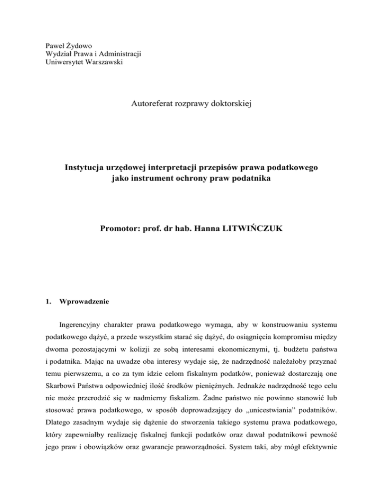 Paweł Żydowo Wydział Prawa i Administracji Uniwersytet Warszawski Autoreferat rozprawy doktorskiej Instytucja urzędowej interpretacji przepisów prawa podatkowego jako instrument ochrony praw podatnika Promotor: prof. dr hab. Hanna LITWIŃCZUK 1. Wprowadzenie Ingerencyjny charakter prawa podatkowego wymaga, aby w konstruowaniu systemu podatkowego dążyć, a przede wszystkim starać się dążyć, do osiągnięcia kompromisu między dwoma pozostającymi w kolizji ze sobą interesami ekonomicznymi, tj. budżetu państwa i podatnika. Mając na uwadze oba interesy wydaje się, że nadrzędność należałoby przyznać temu pierwszemu, a co za tym idzie celom fiskalnym podatków, ponieważ dostarczają one Skarbowi Państwa odpowiedniej ilość środków pieniężnych. Jednakże nadrzędność tego celu nie może przerodzić się w nadmierny fiskalizm. Żadne państwo nie powinno stanowić lub stosować prawa podatkowego, w sposób doprowadzający do „unicestwiania” podatników. Dlatego zasadnym wydaje się dążenie do stworzenia takiego systemu prawa podatkowego, który zapewniałby realizację fiskalnej funkcji podatków oraz dawał podatnikowi pewność jego praw i obowiązków oraz gwarancje praworządności. System taki, aby mógł efektywnie oddziaływać na życie społeczne podatników musi być spójny, a więc zawierać taki zbiór norm, dla którego można znaleźć odpowiednie uzasadnienie aksjologiczne w uporządkowanym systemie wartości. Uporządkowaniu takiego zbioru służą m.in. zasady podatkowe, jako wiążące normy prawa podatkowego, które są nadrzędne w stosunku do innych norm należących do tego systemu, pełniąc w nim szczególną rolę. Szczególna rola zasad podatkowych polega m.in. na tym, że wyznaczają one kierunki działań prawodawczych, procesu interpretacji prawa podatkowego oraz jego stosowania. Jedną z fundamentalnych zasad podatkowych jest zasada pewności opodatkowania, w myśl której podatnik powinien mieć pewność co do tego, jakie są jego uprawnienia i obowiązki w zakresie ustalenia oraz zapłaty należnego podatku. Zasadzie tej należałoby przyznać prymat, bowiem powinna być ona brana pod uwagę i realizowana zarówno w fazie tworzenia prawa, jak i jego stosowania. Inne zasady podatkowe dotyczące techniki opodatkowania (dogodność i taniość) oraz etyki opodatkowania (sprawiedliwe rozkładanie ciężaru podatkowego), również bardzo istotne w systemie podatkowym, kierowane są głównie do prawodawcy, by stanowił podatki tanie, zarówno dla podatnika, jaki i budżetu, sprawiedliwe, a także dogodne. Zauważyć należy, że sam twórca tej zasady Adam Smith stawiał ją przed innymi stwierdzając, że „Pewność co do tego ile każda jednostka ma zapłacić, jest, jeżeli chodzi o podatki, sprawą tak wielkiej wagi, iż uważam, że jak to wynika z doświadczenia wszystkich narodów, nawet bardzo nierównomiernie rozłożone podatki nie są w przybliżeniu złem tak wielkim, jak wielkim złem jest nawet mały stopień niepewności w tym względzie.”1. Formułowane w przeszłości postulaty dotyczące pewności opodatkowania pozostają aktualne także w naszych czasach, a ich głównym przesłaniem jest, jak podatki uczynić znośnymi. Takie ujęcie powoduje potrzebę stworzenia gwarancji prawnych, które z jednej strony zabezpieczać będą podatnika przed naruszaniem tej zasady przez ustawodawcę, a z drugiej strony przez organy podatkowe stosujące prawo. W polskim systemie prawa, zasada pewności opodatkowania nie została wyrażona wprost, zarówno w Konstytucji, jak i przepisach prawa podatkowego. Można ją jednak wywieść z konstytucyjnej zasady państwa prawnego z uwagi na jej wyraźny związek z zasadą zaufania obywateli do organów władzy i administracji państwowej. 1 A. Smith, Badania nad naturą i przyczynami bogactwa narodów, Warszawa 1954, s. 585. 2 W prawie regulującym daniny publiczne, którego cechą jest ingerencja w sferę praw i wolności obywatelskich jego adresatów, szczególnie ważne znaczenie posiada pewność prawa i związane z nią bezpieczeństwo prawne. Interwencyjny charakter prawa podatkowego oraz przyjęcie w polskim systemie zasady samoobliczania w podstawowych podatkach powoduje, że należy kłaść szczególny nacisk na bezpieczeństwo prawne i ekonomiczne podatnika. Gwarantem tego bezpieczeństwa jest m.in. przestrzeganie zasady pewności prawa i sprawiedliwości podatkowej. Samoobliczanie wpływa również na zwiększenie wymogów, co do jakości prawa podatkowego, które winno być stanowione w sposób zrozumiały dla podatnika, nie powinno zawierać pojęć nieostrych utrudniających interpretację, powinno być stabilne, stanowione z zachowaniem odpowiednich okresów vacatio legis. Jednak rzeczywistość zdaje się odbiegać od ideału. Do najczęściej wymienianych „niedomagań” polskiego systemu podatkowego, w odniesieniu do zasady pewności opodatkowania, zaliczyć można zbyt dużą ilość aktów prawnych, brak stabilności prawa podatkowego, używanie pojęć nieostrych, system odniesień uniemożliwiający interpretację niektórych przepisów, błędy konstrukcyjne i definicyjne oraz nadmierną restrykcyjność przepisów. Opóźnienia w rozstrzyganiu przez sądy administracyjne spraw podatkowych oraz częste zmiany prawa podatkowego powodują, że orzeczenia wydawane w oparciu o historyczny materiał normatywny nie pozwalają na szerokie wykorzystywanie dorobku sądownictwa w zakresie interpretacji prawa. Potrzebna zatem jest w systemie instytucja, która wypełniałaby przestrzeń między ustawodawstwem, a orzecznictwem sądów administracyjnych oraz służyłaby pomocą podatnikowi i stanowiła instrument ochrony jego praw. W ustawodawstwach wielu państw świata, od dawna funkcjonują instrumenty prawne, za pomocą których organy administracji podatkowej wyjaśniają podatnikom treści obowiązującego prawa podatkowego lub prezentują sposób stosowania