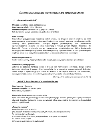 Ćwiczenia relaksujące i wyciszające dla młodszych dzieci 1. „Opowiadający kłębek” Miejsce: świetlica, klasa, pokój stołowy Czas trwania: około 10 do 15 minut Przeznaczony dla: dzieci od lat 8, grupa 4-15 osób Cel: Ćwiczenie uwagi, uspokojenie, pobudzenie fantazji Opis zabawy: Prowadzący przygotowuje wcześniej kłębek wełny. Na długości około 5 metrów do nitki przymocowane są spinaczami biurowymi karteczki, na których napisane zostały nazwy osób, zwierząt albo przedmiotów. Zwinięty kłębek przekazywany jest pierwszemu opowiadającemu. Zaczyna on jakąś historyjkę i rozwija powoli kłębek, docierając do karteczki. Potem przekazuje on go następnemu opowiadającemu, który kontynuuje historyjkę i możliwie jak najszybciej wbudowuje w nią zapisane słowo. W taki sposób kłębek wędruje przez ręce wszystkich uczestników, aż zostanie całkowicie rozwinięty. Materiały pomocnicze: Gruby kłębek wełny. Poza tym karteczki, mazak, spinacze, rozmaite małe przedmioty. Wskazówki pedagogiczne: Zabawa ta pobudza fantazję dzieci i trenuje ich narratorskie zdolności. Dzięki niemu ćwiczymy skupienie i uwagę, dzieci wsłuchują się w opowieść poprzedzających kolegów. Jeżeli któryś z opowiadających stanie w miejscu i nie będzie wiedział, co powiedzieć, nauczyciel może pomóc mu jednym, prowadzącym go dalej zdaniem lub pytaniem. [Fleming, J. Fritz „Zabawy na uspokojenie”, str. 46-47] 2. „Jesień” i „Przyszła myszka” – masażyk dziecięcy Czas trwania : 3 minuty Przeznaczony dla: od 4 roku życia Cel : relaks, wyciszenie Materiały : brak potrzebnych materiałów Opis ćwiczenia: Wypowiadając dziecko dotykamy jego pleców, przy tym uczymy wierszyka również dziecko. Ćwiczenie można powtarzać kilka razy, można też samemu dopowiadać dalsze części historii. „Przyszła myszka” Przyszła myszka do braciszka. (Na plecach dziecka wykonujemy ruch jak byśmy chodzili paluszkami) Tu zajrzała, tam wskoczyła, (Lekko drapiemy dziecko za jednym uchem, następnie za drugim) na koniec tu się skryła. (Wsuwamy palec za kołnierzyk bluzki) „Jesień” Drzewom we włosy dmucha wiatr, (Dziecko jest zwrócone do nas plecami, dmuchamy w jego włosy) A deszczyk kropi: kap, kap, kap. (Delikatnie opukujemy jego plecy opuszkami palców) Krople kapią równiuteńko, (Delikatnie opukujemy jego plecy, w rytm sylab rów-niu-teń-ko) Szepczą cicho: „mój maleńki, (Delikatnie przesuwamy dłońmi wzdłuż tali dziecka) Śpij już, śpij, śpij już, już śpij...” (Głaszczemy dziecko po ramionach) Leci listek, poprzez świat (Wodzimy opuszkami po plecach dziecka) Gdzieś na ziemię cicho spadł. (Lekko naciskamy w jednym miejscu) Leci drugi, leci trzeci, (Wędrujemy opuszkami palców dwa razy) Biegną zbierać listki dzieci. (Szybko, z wyczuciem stukamy wszystkimi palcami po całych plecach dziecka) No, a potem wszystkie liście (Lekko szczypiemy symbolizując ilość liści) Układają w piękne kiście. (Układamy dwie dłonie na środku pleców dziecka) [M. Bogdanowicz „Przytulanki czyli wierszyki na dziecięce masażyki”, str. 12] 3.”Cicho jak myszki” Miejsce: świetlica, sala Czas trwania: 5- 10 minut Przeznaczone dla : 4-10 lat Cel: wyciszenie, regeneracja siły i relaks. Opis zabawy: Na początku wybrana zostaje jedna osoba – myszka- pozostałym dzieciom zawiązuje się oczy. Myszka będzie skradała cicho po całej sali, zadaniem pozostałych uczestników jest śledzenie jej za pomocą zmysłu słuchu. Na sygnał prowadzącego (np. dźwięk dzwonka) myszka staje bez ruchu, a dzieci wskazują wyciągając dłoń, w którym miejscu według nich znajduje się myszka. Ćwiczenie można powtórzyć kilka razy. Materiały pomocnicze: szaliki, opaski na oczy dla dzieci, dzwoneczek. 3. Śpiący olbrzym [U. Rucker – Vennemann, Zabawy odprężające dla dzieci, s. 91, wyd. Jedność, Kielce 2003] 4. Wizualizacja kinetyczna „Głowa” Cel : odprężenie, relaksacja Czas trwania: około 5 minut Materiały pomocnicze: brak Opis ćwiczenia: Dzieci wsłuchują się w polecenia nauczyciela prowadzącego wizualizację. Usiądźcie prosto, patrząc przed siebie. Teraz powoli obróćcie głowy jak najdalej w prawo i skupcie uwagę na punkcie pokoju najbardziej od was oddalonym. Powróćcie do postawy wyjściowej i powtórzcie to ćwiczenie, patrząc w lewo. Znowu siedząc prosto, zamknijcie oczy i wyobraźcie sobie, że obracacie głowę - chociaż fizycznie jesteście nieruchomi - luźno, spokojnie i powoli, najpierw w prawo, potem w lewo. A teraz w wyobraźni wyprostujcie głowę, po czym otwórzcie oczy i raz jeszcze powtórzcie w rzeczywistości początkowe ćwiczenie, obróćcie głowę jak najdalej w prawo, a następnie w lewo za każdym razem zwracając uwagę na to, jaki najdalszy punkt możecie uchwycić z prawej, a jaki z lewej strony. I co? Czy nie okazało się przypadkiem, że tym razem udało się wam obrócić głowę w obie strony odrobinę dalej? [J. Day, Twórcza wizualizacja dla dzieci, str. 47] 5. Wizualizacja twórcza Cel: Relaksacja, wyciszenie, ćwiczenie wyobraźni Czas trwania : 10 minut Przeznaczona dla : dzieci od 6 roku życia ŚCIEŻKA Wyobraź sobie ścieżkę, taką jaką chcesz: szeroką lub wąską, krętą lub prostą, wzdłuż strumienia lub plaży, polną lub leśną. Idź teraz tą ścieżką, aż dojdziesz do wysokiego drzewa z mnóstwem gałęzi. To Drzewo Kłopotów, na którym wiszą wszystkie twoje zgryzoty. Stań na chwilę spokojnie, a potem zacznij zdejmować z siebie wszystkie strapienia, nawet te najmniejsze, wieszając je na gałęziach... Nie zapomnij tylko o żadnym!... Teraz zawróć swoją ścieżką. Jeśli są na niej jakieś kamienie, gałązki czy inne przeszkody, zatrzymuj się przy każdej z nich i odrzucaj je na bok. Obdarz je całą miłością, która zagościła w sercu, ale potem idź dalej. Wkrótce dotrzesz do swojej ulubionej furtki, okolonej pięknymi kwiatami. Rozk