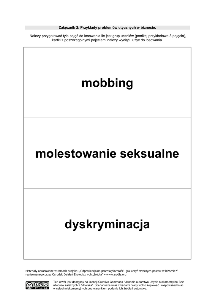 Załącznik 2: Przykłady problemów etycznych w biznesie. Należy przygotować tyle pojęć do losowania ile jest grup uczniów (poniżej przykładowe 3 pojęcia), kartki z poszczególnymi pojęciami należy wyciąć i użyć do losowania. mobbing molestowanie seksualne dyskryminacja Materiały opracowane w ramach projektu „Odpowiedzialna przedsiębiorczość - jak uczyć etycznych postaw w biznesie?” realizowanego przez Ośrodek Działań Ekologicznych „Źródła” – www.zrodla.org Ten utwór jest dostępny na licencji Creative Commons "Uznanie autorstwa-Użycie niekomercyjne-Bez utworów zależnych 2.5 Polska". Scenariusze wraz z kartami pracy wolno kopiować i rozpowszechniać w celach niekomercyjnych pod warunkiem podania ich źródła i autorstwa.