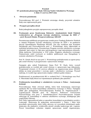 Protokół XV posiedzenia plenarnego Rady Głównej Nauki i Szkolnictwa Wyższego w dniu 11 czerwca 2015 roku I. Otwarcie posiedzenia Przewodniczący RG prof. J. Woźnicki otwierając obrady, przywitał członków Rady oraz zaproszonych gości. II. Przyjęcie porządku obrad Rada jednogłośnie przyjęła zaproponowany porządek obrad. III. Przekazanie przez Konferencję Rektorów Akademickich Szkół Polskich wydawnictwa pt. „Program rozwoju szkolnictwa wyższego do 2020 r.” – prof. Ryszard Zimak, Wiceprzewodniczący KRASP Prezentowana publikacja przygotowana została przez Fundację Rektorów Polskich w ramach Programu rozwoju szkolnictwa wyższego do 2020 r. na podstawie decyzji Zgromadzenia Plenarnego KRASP. Jest ona wynikiem prac Komitetu Sterującego pod Przewodnictwem prof. J. Woźnickiego, który odpowiadał za realizację przedsięwzięcia. Prezentowany Program rozwoju szkolnictwa wyższego obejmuje pięć części: tj. Opis prac nad programem i jego najważniejsze elementy, Misja społeczna Uniwersytetu w XXI wieku, Diagnoza szkolnictwa wyższego, Finansowanie szkół wyższych ze środków publicznych oraz Deregulacja w systemie szkolnictwa Wyższego. Prof. R. Zimak złożył na ręce prof. J. Woźnickiego podziękowania za ogrom pracy jaki został włożony w przygotowanie i opracowanie strategii. Następnie głos zabrał Podsekretarz Stanu Prof. W. Duch, który wyraził podziękowania za wysiłek jaki został włożony w opracowanie tego dokumentu. Przypomniał również, iż 24 czerwca odbędzie się organizowana przez MNiSW debata na temat przyszłości i rozwoju nauki i szkolnictwa wyższego. Wyraził nadzieję, że wyniki tego opracowania znajdą w debacie godne miejsce. Poinformował, że przedstawiciele RG w osobach Prof. J. Woźnickiego oraz Prof. Z. Marciniaka będą obecni na wspomnianym spotkaniu jako paneliści. IV. Problematyka konsolidacji w szkolnictwie wyższym w Polsce – kontynuacja dyskusji Przewodniczący Rady otworzył debatę, która była kontynuacją marcowego spotkania RG na temat konsolidacji szkolnictwa wyższego w Polsce. Następnie oddał głos prelegentom Przewodniczącemu Komisji ds. Organizacyjnych i Legislacyjnych KRASP prof. M. Pałysowi, Rektorowi Uniwersytetu Warszawskiego oraz prof. J. Szambelańczykowi Przewodniczącemu Zespołu roboczego ds. konsolidacji w sektorze szkolnictwa wyższego, działającego jako zespół Rady Głównej. Prof. Pałys zaprezentował jeden ze sposobów konsolidacji na przykładzie uczelni z Lotaryngii. Motywacją do połączenia uniwersytetów z Nancy i Metz było powołanie uniwersytetu, który byłby aktywny we wszystkich dziedzinach nauki, atrakcyjny dla studentów zwiększyłby prestiż ośrodka naukowego jak i regionu. Proces konsolidacji wdrażano etapami opracowano model organizacyjny, utrzymano wewnętrzną różnorodność, zadbano o dobrą komunikację wewnętrzną i zewnętrzną, a także podniesiono standard usług świadczonych przez administrację. Prof. Pałys zwrócił uwagę, że proces konsolidacji nie jest procesem standardowym. Dlatego tak ważne podczas jego tworzenia jest uwzględnienie zarówno uwarunkowań wewnętrznych każdej z uczelni tj. poziomu kadry, poziomu prowadzonych badań naukowych, obaw środowiska przed zmianami jak i uwarunkowań prawnych. A także należy wiedzieć co chce się osiągnąć poprzez konsolidację. Podkreślił, że przeprowadzenie tego procesu nie daje gwarancji osiągnięcia sukcesu. Następnie głos zabrał prof. J. Szambelańczyk, który przedstawił dotychczasowy przebieg działań Zespołu oraz podzielił się wątpliwościami jakie pojawiły się podczas prac Zespołu. Zgodnie z przyjętymi założeniami Zespół planuje: uzyskać informacje i uwagi jakie płyną ze środowiska na temat konsolidacji uczelni, zasięgnąć opinii ekspertów, zorganizować sieć osób współpracujących z Zespołem, wykorzystać doświadczenia innych krajów europejskich w zakresie przeprowadzania procesu konsolidacji (np. Niemcy, Szwecja), przygotować narzędzia badawcze np. opracowanie ankiet, które będą rozesłane do uczelni, zebrać bazę publikacji na temat konsolidacji, Kończąc swoje wystąpienie prof. J. Szambelańczyk zaapelował do obecnych na sali rektorów o podjęcie współpracy i podzielenie się opiniami środowiska na temat konsolidacji z członkami Zespołu. W nawiązaniu do tego zaproszenia, prof. J. Woźnicki przytoczył treść uchwały RG w sprawie powołania Zespołu oraz przedstawił zakres jego działania i skład członków Zespołu, a następnie jako Przewodniczący Rady otworzył debatę. W debacie uczestniczyli: prof. P. Lampe, prof. M. Krawczyk, dr. A. Bartczak, prof. J. Żmija, dr A. Pieniądz, dr A. Kiebała, prof. K. Czaplicka-Kolarz, prof. M. Szczerek, mgr Gajda, prof. T. Miczka, prof. J. Szambelańczyk, prof. Z. Marciniak Podczas dyskusji podkreślono, że: przykład Lotaryngii może nie dawać szansy powodzenia z uwagi na przyzwyczajenia środowiska akademickiego do obecnie istniejących rozwiązań systemowych, nie należy łączyć dużych uczelni akademickich lecz dążyć do ich wzajemnej współpracy w zakresie prowadzenia badań naukowych i tworzenia struktur charakterystycznych dla uniwersytetów badawczych, ale nie do zwiększania liczby studentów, istnieje potrzeba reformowania uczelni (podniesienie efektywności pracy, zmniejszenie liczby pracowników techniczno-administracyjnych itd.), należy iść w kierunku łączenia szkół wyższych w badawcze związki uczelni, należy podjąć kampanię informacyjną czym jest konsolidacja, opracować bilans zysków i strat przeprowadzenia jej procesu, 2 nie należy dokonywać konsolidacji poprzez wprowadzanie odgórnych rozwiązań prawnych lecz dążyć do uzyskania akceptacji środowiska akademickiego i wspierania jego własnych inicjatyw w tym zakresie, przeprowadzenie konsolidacji odgórnej byłoby możliwe w przypadku uczelni nieefektywnych, należy wyraźnie okreś