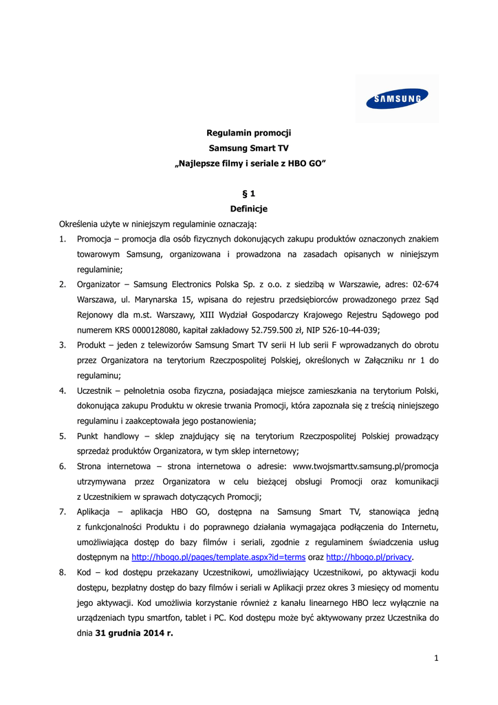 Regulamin promocji Samsung Smart TV „Najlepsze filmy i seriale z HBO GO” §1 Definicje Określenia użyte w niniejszym regulaminie oznaczają: 1. Promocja – promocja dla osób fizycznych dokonujących zakupu produktów oznaczonych znakiem towarowym Samsung, organizowana i prowadzona na zasadach opisanych w niniejszym regulaminie; 2. Organizator – Samsung Electronics Polska Sp. z o.o. z siedzibą w Warszawie, adres: 02-674 Warszawa, ul. Marynarska 15, wpisana do rejestru przedsiębiorców prowadzonego przez Sąd Rejonowy dla m.st. Warszawy, XIII Wydział Gospodarczy Krajowego Rejestru Sądowego pod numerem KRS 0000128080, kapitał zakładowy 52.759.500 zł, NIP 526-10-44-039; 3. Produkt – jeden z telewizorów Samsung Smart TV serii H lub serii F wprowadzanych do obrotu przez Organizatora na terytorium Rzeczpospolitej Polskiej, określonych w Załączniku nr 1 do regulaminu; 4. Uczestnik – pełnoletnia osoba fizyczna, posiadająca miejsce zamieszkania na terytorium Polski, dokonująca zakupu Produktu w okresie trwania Promocji, która zapoznała się z treścią niniejszego regulaminu i zaakceptowała jego postanowienia; 5. Punkt handlowy – sklep znajdujący się na terytorium Rzeczpospolitej Polskiej prowadzący sprzedaż produktów Organizatora, w tym sklep internetowy; 6. Strona internetowa – strona internetowa o adresie: www.twojsmarttv.samsung.pl/promocja utrzymywana przez Organizatora w celu bieżącej obsługi Promocji oraz komunikacji z Uczestnikiem w sprawach dotyczących Promocji; 7. Aplikacja – aplikacja HBO GO, dostępna na Samsung Smart TV, stanowiąca jedną z funkcjonalności Produktu i do poprawnego działania wymagająca podłączenia do Internetu, umożliwiająca dostęp do bazy filmów i seriali, zgodnie z regulaminem świadczenia usług dostępnym na http://hbogo.pl/pages/template.aspx?id=terms oraz http://hbogo.pl/privacy. 8. Kod – kod dostępu przekazany Uczestnikowi, umożliwiający Uczestnikowi, po aktywacji kodu dostępu, bezpłatny dostęp do bazy filmów i seriali w Aplikacji przez okres 3 miesięcy od momentu jego aktywacji. Kod umożliwia korzystanie również z kanału linearnego HBO lecz wyłącznie na urządzeniach typu smartfon, tablet i PC. Kod dostępu może być aktywowany przez Uczestnika do dnia 31 grudnia 2014 r. 1 §2 Postanowienia ogólne 1. Promocja prowadzona jest na zasadach określonych niniejszym regulaminem. 2. Promocja prowadzona jest na terytorium Rzeczpospolitej Polskiej w okresie od dnia 18 września 2014 r. do dnia 19 października 2014 r. (okres, w którym należy zakupić Produkt promocyjny). 3. Regulamin określa zasady bezpłatnego skorzystania z bazy filmów i seriali oferowanej w aplikacji hbogo.pl. 4. Z zastrzeżeniem postanowień poniższych, w celu wzięcia udziału w Promocji należy: 1) dokonać zakupu Produktu w Punkcie handlowym w okresie od dnia 18 września 2014 r. do dnia 19 października 2014 r. i zachować dowód zakupu (paragon lub faktura VAT), 2) w terminie od dnia 18 września 2014 r. do dnia 5 listopada 2014 r. zgłosić swój udział w Promocji wypełniając formularz zgłoszeniowy dostępny on-line na Stronie internetowej www.smarttv.samsung.pl/promocja obowiązkowo dołączając za każdym razem dowód nabycia Produktu w postaci skanu/zdjęcia paragonu lub faktury VAT, model zakupionego Produktu, adres Punktu handlowego i datę zakupu, 5. 3) podać dane osobowe dotyczące Uczestnika, tj. adres e-mail Uczestnika oraz 4) zaakceptować regulamin Promocji. Formularze zgłoszeniowe rejestrowane za pośrednictwem Strony internetowej przyjmowane będą do dnia 5 listopada 2014 r. 6. Data i godzina zakupu Produktu, widniejąca na skanie dołączonego dowodu zakupu Produktu nie może być późniejsza niż data rejestracji Formularza zgłoszeniowego za pośrednictwem Strony internetowej. 7. Warunkiem udziału w Promocji jest przestrzeganie postanowień niniejszego regulaminu oraz podanie prawdziwych i poprawnych danych w Formularzu zgłoszeniowym. W przypadku powzięcia jakichkolwiek wątpliwości co do prawdziwości oświadczeń lub prawidłowości działań Uczestnika w tym zakresie, Uczestnik będzie zobowiązany do przedstawienia na żądanie Organizatora dowodów potwierdzających dane lub oświadczenia Uczestnika, np. faktur lub paragonów potwierdzających zakup Produktu w terminie trwania Promocji lub zdjęcia opakowania Produktu, umożliwiającego weryfikację nazwy i modelu zakupionego Produktu, w przypadku gdy z faktury lub paragonu nie wynika jednoznacznie zakup Produktu objętego Promocją. §3 Zasady Promocji 1. Każdy Uczestnik, który spełni warunki określone w § 2 ust. 4, otrzyma Kod dostępu, umożliwiający bezpłatny dostęp do bazy filmów i seriali w Aplikacji, zgodnie z regulaminem świadczenia usług dostępnym na stronie http://hbogo.pl/pages/template.aspx?id=terms. Uczestnik otrzymuje dostęp do całej bazy filmów i seriali w Aplikacji. Warunkiem aktywacji Kodu dostępu jest prawidłowa rejestracja i założenie przez Użytkownika konta w Aplikacji 2 i zaakceptowanie przez Uczestnika regulaminu świadczenia usług i polityki prywatności umieszczonych na stronie http://hbogo.pl/pages/template.aspx?id=terms. 2. Kod dostępu zostanie przekazany Uczestnikowi przez Organizatora pocztą elektroniczną, na adres e-mail podany w Formularzu zgłoszeniowym w terminie od 3 do 5 dni roboczych od daty rejestracji Formularza zgłoszeniowego za pośrednictwem Strony internetowej www.twojsmarttv.samsung.pl/promocja. 3. Wartość Kodu dostępu wynosi 89,7 złotych brutto. W przypadku Uczestników będących osobami fizycznymi nieprowadzącymi działalności gospodarczej wartość świadczenia jest zwolniona z podatku dochodowego od osób fizycznych na podstawie art. 21 ust. 1 pkt 68a ustawy z dnia 26 lipca 1991 r. o podatku dochodowym od osób fizycznych (t.j. Dz. U. z 2010 r., Nr 51, poz. 307). W przypadku Uczestników będących osobami fizycznymi prowadzącymi działalność gospodarcz
