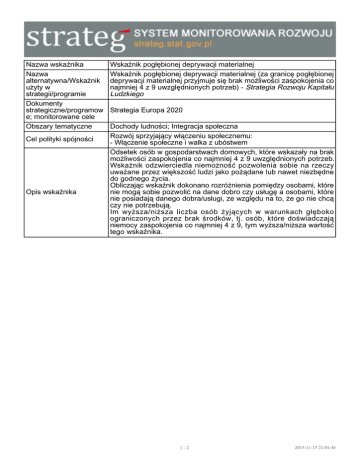Nazwa wskaźnika Nazwa alternatywna/Wskaźnik użyty w strategii/programie Dokumenty strategiczne/programow e; monitorowane cele Obszary tematyczne Cel polityki spójności Opis wskaźnika Wskaźnik pogłębionej deprywacji materialnej Wskaźnik pogłębionej deprywacji materialnej (za granicę pogłębionej deprywacji materialnej przyjmuje się brak możliwości zaspokojenia co najmniej 4 z 9 uwzględnionych potrzeb) - Strategia Rozwoju Kapitału Ludzkiego Strategia Europa 2020 Dochody ludności; Integracja społeczna Rozwój sprzyjający włączeniu społecznemu: - Włączenie społeczne i walka z ubóstwem Odsetek osób w gospodarstwach domowych, które wskazały na brak możliwości zaspokojenia co najmniej 4 z 9 uwzględnionych potrzeb. Wskaźnik odzwierciedla niemożność pozwolenia sobie na rzeczy uważane przez większość ludzi jako pożądane lub nawet niezbędne do godnego życia. Obliczając wskaźnik dokonano rozróżnienia pomiędzy osobami, które nie mogą sobie pozwolić na dane dobro czy usługę a osobami, które nie posiadają danego dobra/usługi, ze względu na to, że go nie chcą czy nie potrzebują. Im wyższa/niższa liczba osób żyjących w warunkach głęboko ograniczonych przez brak środków, tj. osób, które doświadczają niemocy zaspokojenia co najmniej 4 z 9, tym wyższa/niższa wartość tego wskaźnika. 1-2 2015-11-15 21:01:44 Wskaźnik obliczany jest na podstawie informacji uzyskanych z Badania EU-SILC. Wyjaśnienie metodologiczne Źródło danych Dostępność danych w systemie; częstotliwość Dostępne wymiary Poziom dostępności terytorialnej Dostępność dla UE Badanie EU-SILC (Europejskie Badanie Dochodów i Warunków Życia) jest badaniem stałym (prowadzonym co roku), którego podmiotem są gospodarstwa domowe oraz osoby w wieku 16 lat i więcej w gospodarstwach domowych. Badanie ma charakter panelowy, tzn. wylosowaną grupę respondentów poddaje się kilkukrotnej "obserwacji" w odstępach czasu, dzięki czemu można zaobserwować i przeanalizować zmieniającą się sytuację, postawy, zachowania lub opinie badanej grupy. Badanie jest realizowane metodą wywiadu bezpośredniego z wykorzystaniem 2 kwestionariuszy; z których jeden służy do pozyskiwania danych dotyczących gospodarstw domowych, a drugi – danych o osobach indywidualnych. Celem badania EU-SILC jest pozyskiwanie informacji, które umożliwiają ocenę warunków życia polskiego społeczeństwa oraz pozwalają porównać je z warunkami życia w innych krajach Unii Europejskiej. Służy temu przyjęta przez Eurostat jednolita metodologia. W miarę potrzeb organów Unii Europejskiej w ramach badania EUSILC prowadzone są również badania modułowe poświęcone wybranemu zagadnieniu (jest to dodatkowa ankieta realizowana jednocześnie z badaniem podstawowym). Główny Urząd Statystyczny wdrożył badanie EU-SILC w 2005 r. Jednostką badania jest gospodarstwo domowe, czyli osoby, które są lub nie są ze sobą spokrewnione, mieszkają razem i wspólnie utrzymują się (gospodarstwo domowe wieloosobowe). Gospodarstwo domowe może również tworzyć jedna osoba, która utrzymuje się samodzielnie, bez względu na to, czy mieszka sama, czy z innymi osobami (gospodarstwo domowe jednoosobowe). Deprywacja materialna definiowana jest jako wymuszona niemożność (a nie rezygnacja z własnego wyboru) zaspokojenia 4 z 9 następujących potrzeb: 1) opłacenia tygodniowego wyjazdu wszystkich członków gospodarstwa domowego na wypoczynek raz w roku, 2) spożywania mięsa, ryb (lub wegetariańskiego odpowiednika) co drugi dzień, 3) ogrzewania mieszkania odpowiednio do potrzeb, 4) pokrycia niespodziewanego wydatku (w wysokości odpowiadającej miesięcznej wartości granicy ubóstwa relatywnego, przyjętej w danym kraju, w roku poprzedzającym badanie), 5) terminowego regulowania opłat związanych z mieszkaniem, spłatą rat i kredytów, 6) posiadania telewizora kolorowego, 7) posiadania samochodu, 8) posiadania pralki, 9) posiadania telefonu (stacjonarnego lub komórkowego). Główny Urząd Statystyczny Dane roczne; od 2005 r. Nie dotyczy Polska Kraje UE, UE-27, UE-28 Źródło danych: Eurostat Uwagi 2-2 2015-11-15 21:01:44