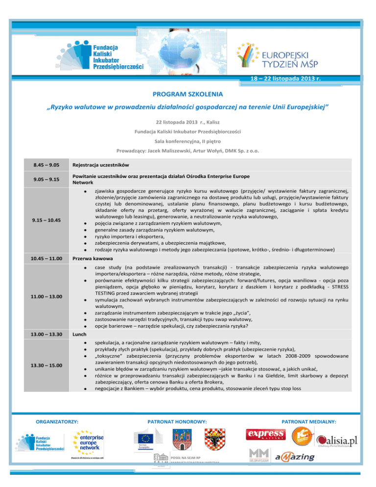 18 – 22 listopada 2013 r. PROGRAM SZKOLENIA „Ryzyko walutowe w prowadzeniu działalności gospodarczej na terenie Unii Europejskiej” 22 listopada 2013 r., Kalisz Fundacja Kaliski Inkubator Przedsiębiorczości Sala konferencyjna, II piętro Prowadzący: Jacek Maliszewski, Artur Wołyń, DMK Sp. z o.o. 8.45 – 9.05 Rejestracja uczestników 9.05 – 9.15 Powitanie uczestników oraz prezentacja działań Ośrodka Enterprise Europe Network zjawiska gospodarcze generujące ryzyko kursu walutowego (przyjęcie/ wystawienie faktury zagranicznej, złożenie/przyjęcie zamówienia zagranicznego na dostawę produktu lub usługi, przyjęcie/wystawienie faktury czystej lub denominowanej, ustalanie planu finansowego, planu budżetowego i kursu budżetowego, składanie oferty na przetarg, oferty wyrażonej w walucie zagranicznej, zaciąganie i spłata kredytu walutowego lub leasingu), generowanie, a neutralizowanie ryzyka walutowego, pojęcia związane z zarządzaniem ryzykiem walutowym, generalne zasady zarządzania ryzykiem walutowym, ryzyko importera i eksportera, zabezpieczenia derywatami, a ubezpieczenia majątkowe, rodzaje ryzyka walutowego i metody jego zabezpieczania (spotowe, krótko-, średnio- i długoterminowe) 9.15 – 10.45 10.45 – 11.00 Przerwa kawowa case study (na podstawie zrealizowanych transakcji) - transakcje zabezpieczenia ryzyka walutowego importera/eksportera – różne narzędzia, różne metody, różne strategie, porównanie efektywności kilku strategii zabezpieczających: forward/futures, opcja waniliowa - opcja poza pieniądzem, opcja głęboko w pieniądzu, korytarz, korytarz z daszkiem i korytarz z podkładką - STRESS TESTING przed zawarciem wybranej strategii symulacja zachowań wybranych instrumentów zabezpieczających w zależności od rozwoju sytuacji na rynku walutowym, zarządzanie instrumentem zabezpieczającym w trakcie jego „życia”, zastosowanie narzędzi tradycyjnych, transakcji typu swap walutowy, opcje barierowe – narzędzie spekulacji, czy zabezpieczania ryzyka? 11.00 – 13.00 13.00 – 13.30 Lunch 13.30 – 15.00 ORGANIZATORZY: spekulacja, a racjonalne zarządzanie ryzykiem walutowym – fakty i mity, przykłady złych praktyk (spekulacja), przykłady dobrych praktyk (ubezpieczenie ryzyka), „toksyczne” zabezpieczenia (przyczyny problemów eksporterów w latach 2008-2009 spowodowane zawieraniem transakcji opcyjnych niedostosowanych do jego potrzeb), unikanie błędów w zarządzaniu ryzykiem walutowym –jakie transakcje stosować, a jakich unikać, różnice w przeprowadzaniu transakcji zabezpieczających w Banku i na Giełdzie, limit skarbowy a depozyt zabezpieczający, oferta cenowa Banku a oferta Brokera, negocjacje z Bankiem – wybór produktu, cena produktu, stosowanie zleceń typu stop loss PATRONAT HONOROWY: POSEŁ NA SEJM RP MARIUSZ SEBASTIAN WITCZAK PATRONAT MEDIALNY: