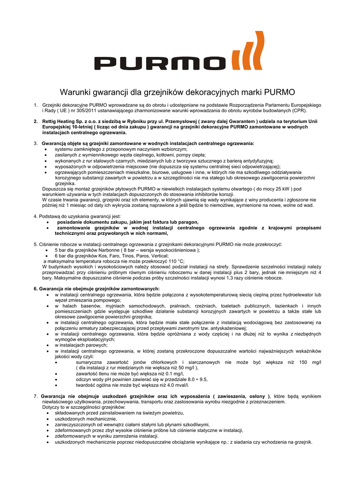 Warunki gwarancji dla grzejników dekoracyjnych marki PURMO 1. Grzejniki dekoracyjne PURMO wprowadzane są do obrotu i udostępniane na podstawie Rozporządzenia Parlamentu Europejskiego i Rady ( UE ) nr 305/2011 ustanawiającego zharmonizowane warunki wprowadzania do obrotu wyrobów budowlanych (CPR). 2. Rettig Heating Sp. z o.o. z siedzibą w Rybniku przy ul. Przemysłowej ( zwany dalej Gwarantem ) udziela na terytorium Unii Europejskiej 10-letniej ( licząc od dnia zakupu ) gwarancji na grzejniki dekoracyjne PURMO zamontowane w wodnych instalacjach centralnego ogrzewania. 3. Gwarancją objęte są grzejniki zamontowane w wodnych instalacjach centralnego ogrzewania: systemu zamkniętego z przeponowym naczyniem wzbiorczym; zasilanych z wymiennikowego węzła cieplnego, kotłowni, pompy ciepła; wykonanych z rur stalowych czarnych, miedzianych lub z tworzywa sztucznego z barierą antydyfuzyjną; wyposażonych w odpowietrzenia miejscowe (nie dopuszcza się systemu centralnej sieci odpowietrzającej); ogrzewających pomieszczeniach mieszkalne, biurowe, usługowe i inne, w których nie ma szkodliwego oddziaływania korozyjnego substancji zawartych w powietrzu a w szczególności nie ma stałego lub okresowego zawilgocenia powierzchni grzejnika. Dopuszcza się montaż grzejników płytowych PURMO w niewielkich instalacjach systemu otwartego ( do mocy 25 kW ) pod warunkiem używania w tych instalacjach dopuszczonych do stosowania inhibitorów korozji. W czasie trwania gwarancji, grzejniki oraz ich elementy, w których ujawnią się wady wynikające z winy producenta i zgłoszone nie później niż 1 miesiąc od daty ich wykrycia zostaną naprawione a jeśli będzie to niemożliwe, wymienione na nowe, wolne od wad. 4. Podstawą do uzyskania gwarancji jest: posiadanie dokumentu zakupu, jakim jest faktura lub paragon, zamontowanie grzejników w wodnej instalacji centralnego ogrzewania zgodnie z krajowymi przepisami technicznymi oraz przywołanych w nich normami, 5. Ciśnienie robocze w instalacji centralnego ogrzewania z grzejnikami dekoracyjnymi PURMO nie może przekroczyć: 5 bar dla grzejników Narbonne ( 8 bar – wersja wysokociśnieniowa ); 6 bar dla grzejników Kos, Faro, Tinos, Paros, Vertical; a maksymalna temperatura robocza nie może przekroczyć 110 °C; W budynkach wysokich i wysokościowych należy stosować podział instalacji na strefy. Sprawdzenie szczelności instalacji należy przeprowadzać przy ciśnieniu próbnym równym ciśnieniu roboczemu w danej instalacji plus 2 bary, jednak nie mniejszym niż 4 bary. Maksymalne dopuszczalne ciśnienie podczas próby szczelności instalacji wynosi 1,3 razy ciśnienie robocze. 6. Gwarancja nie obejmuje grzejników zamontowanych: w instalacji centralnego ogrzewania, która będzie połączona z wysokotemperaturową siecią cieplną przez hydroelewator lub węzeł zmieszania pompowego; w halach basenów, myjniach samochodowych, pralniach, rzeźniach, toaletach publicznych, łazienkach i innych pomieszczeniach gdzie występuje szkodliwe działanie substancji korozyjnych zawartych w powietrzu a także stałe lub okresowe zawilgocenie powierzchni grzejnika; w instalacji centralnego ogrzewania, która będzie miała stałe połączenie z instalacją wodociągową bez zastosowanej na połączeniu armatury zabezpieczającej przed przepływami zwrotnymi tzw. antyskażeniowej; w instalacji centralnego ogrzewania, która będzie opróżniana z wody częściej i na dłużej niż to wynika z niezbędnych wymogów eksploatacyjnych; w instalacjach parowych; w instalacji centralnego ogrzewania, w której zostaną przekroczone dopuszczalne wartości najważniejszych wskaźników jakości wody czyli: sumaryczna zawartość jonów chlorkowych i siarczanowych nie może być większa niż 150 mg/l ( dla instalacji z rur miedzianych nie większa niż 50 mg/l ), zawartość tlenu nie może być większa niż 0.1 mg/l, odczyn wody pH powinien zawierać się w przedziale 8.0 ÷ 9.5, twardość ogólna nie może być większa niż 4.0 mval/l. 7. Gwarancja nie obejmuje uszkodzeń grzejników oraz ich wyposażenia ( zawieszenia, osłony ), które będą wynikiem niewłaściwego użytkowania, przechowywania, transportu oraz zastosowania wyrobu niezgodnie z przeznaczeniem. Dotyczy to w szczególności grzejników: składowanych przed zainstalowaniem na świeżym powietrzu, uszkodzonych mechanicznie, zanieczyszczonych od wewnątrz ciałami stałymi lub płynami szkodliwymi, zdeformowanych przez zbyt wysokie ciśnienie próbne lub ciśnienie statyczne w instalacji, zdeformowanych w wyniku zamrożenia instalacji. uszkodzonych mechanicznie poprzez niedopuszczalne obciążanie wynikające np.: z siadania czy wchodzenia na grzejnik. 8. Grzejniki należy montować bez zdejmowania indywidualnego opakowania fabrycznego. Opakowanie to powinno pozostać na grzejniku nawet, jeżeli instalacja centralnego ogrzewania uruchamiana jest dla ogrzewania budynku w czasie prac wykończeniowych lub dla osuszania budynku. Zaleca się, aby opakowanie było zdejmowane przez użytkownika pomieszczenia po zakończeniu wszystkich prac wykończeniowych. Grzejniki ze względów higienicznych wymagają okresowego czyszczenia. Wymaga się używania do tego celu delikatnych i miękkich materiałów ewentualnie lekko zwilżonych wodą. Do czyszczenia grzejników nie wolno używać agresywnych lub żrących środków czyszczących ( rozpuszczalniki, środki zawierające chlor ). Grzejniki płytowe nie mogą być wykorzystywane do suszenia mokrych lub wilgotnych przedmiotów kładzionych na grzejniku. Reklamacje składane na uszkodzenia powłoki lakierniczej spowodowane niewłaściwą eksploatacją i konserwacją nie będą uwzględniane. 9. Zabrania się opróżniania całej instalacji lub jej części z wody i pozostawiania w tym stanie. Dotyczy to również nowych instalacji poddanych próbom szczelności. W razie potrzeby opróżnienia instalacji np. z powodu remontu lub konserwacji, wodę należy