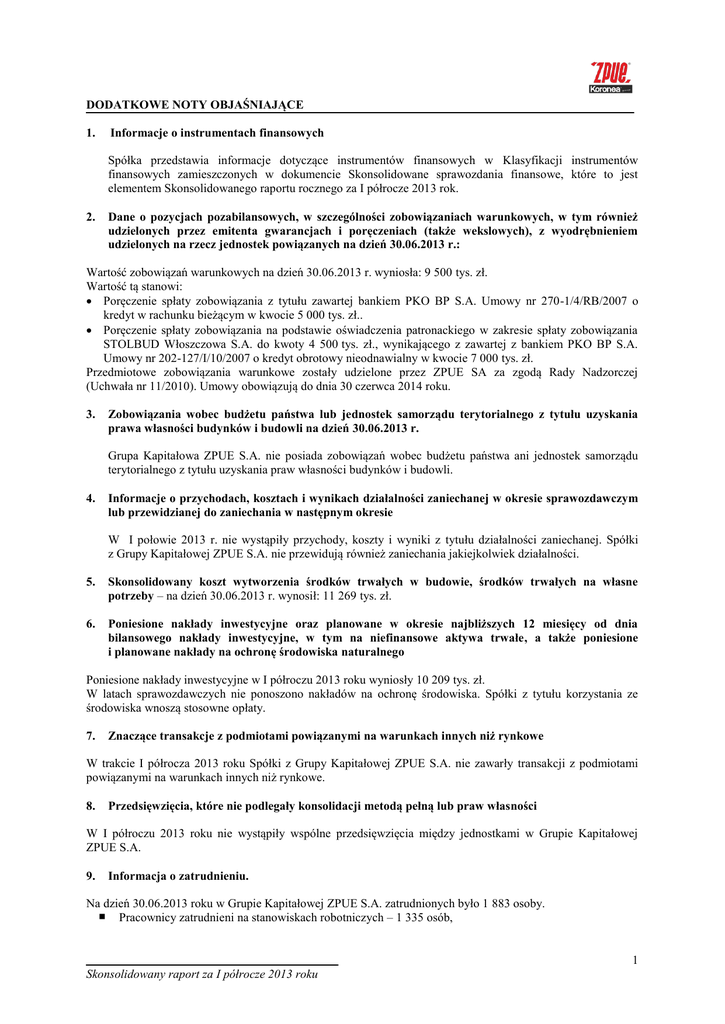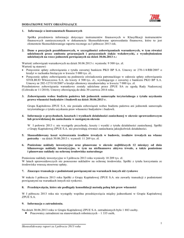 DODATKOWE NOTY OBJAŚNIAJĄCE 1. Informacje o instrumentach finansowych Spółka przedstawia informacje dotyczące instrumentów finansowych w Klasyfikacji instrumentów finansowych zamieszczonych w dokumencie Skonsolidowane sprawozdania finansowe, które to jest elementem Skonsolidowanego raportu rocznego za I półrocze 2013 rok. 2. Dane o pozycjach pozabilansowych, w szczególności zobowiązaniach warunkowych, w tym również udzielonych przez emitenta gwarancjach i poręczeniach (także wekslowych), z wyodrębnieniem udzielonych na rzecz jednostek powiązanych na dzień 30.06.2013 r.: Wartość zobowiązań warunkowych na dzień 30.06.2013 r. wyniosła: 9 500 tys. zł. Wartość tą stanowi: Poręczenie spłaty zobowiązania z tytułu zawartej bankiem PKO BP S.A. Umowy nr 270-1/4/RB/2007 o kredyt w rachunku bieżącym w kwocie 5 000 tys. zł.. Poręczenie spłaty zobowiązania na podstawie oświadczenia patronackiego w zakresie spłaty zobowiązania STOLBUD Włoszczowa S.A. do kwoty 4 500 tys. zł., wynikającego z zawartej z bankiem PKO BP S.A. Umowy nr 202-127/I/10/2007 o kredyt obrotowy nieodnawialny w kwocie 7 000 tys. zł. Przedmiotowe zobowiązania warunkowe zostały udzielone przez ZPUE SA za zgodą Rady Nadzorczej (Uchwała nr 11/2010). Umowy obowiązują do dnia 30 czerwca 2014 roku. 3. Zobowiązania wobec budżetu państwa lub jednostek samorządu terytorialnego z tytułu uzyskania prawa własności budynków i budowli na dzień 30.06.2013 r. Grupa Kapitałowa ZPUE S.A. nie posiada zobowiązań wobec budżetu państwa ani jednostek samorządu terytorialnego z tytułu uzyskania praw własności budynków i budowli. 4. Informacje o przychodach, kosztach i wynikach działalności zaniechanej w okresie sprawozdawczym lub przewidzianej do zaniechania w następnym okresie W I połowie 2013 r. nie wystąpiły przychody, koszty i wyniki z tytułu działalności zaniechanej. Spółki z Grupy Kapitałowej ZPUE S.A. nie przewidują również zaniechania jakiejkolwiek działalności. 5. Skonsolidowany koszt wytworzenia środków trwałych w budowie, środków trwałych na własne potrzeby – na dzień 30.06.2013 r. wynosił: 11 269 tys. zł. 6. Poniesione nakłady inwestycyjne oraz planowane w okresie najbliższych 12 miesięcy od dnia bilansowego nakłady inwestycyjne, w tym na niefinansowe aktywa trwałe, a także poniesione i planowane nakłady na ochronę środowiska naturalnego Poniesione nakłady inwestycyjne w I półroczu 2013 roku wyniosły 10 209 tys. zł. W latach sprawozdawczych nie ponoszono nakładów na ochronę środowiska. Spółki z tytułu korzystania ze środowiska wnoszą stosowne opłaty. 7. Znaczące transakcje z podmiotami powiązanymi na warunkach innych niż rynkowe W trakcie I półrocza 2013 roku Spółki z Grupy Kapitałowej ZPUE S.A. nie zawarły transakcji z podmiotami powiązanymi na warunkach innych niż rynkowe. 8. Przedsięwzięcia, które nie podlegały konsolidacji metodą pełną lub praw własności W I półroczu 2013 roku nie wystąpiły wspólne przedsięwzięcia między jednostkami w Grupie Kapitałowej ZPUE S.A. 9. Informacja o zatrudnieniu. Na dzień 30.06.2013 roku w Grupie Kapitałowej ZPUE S.A. zatrudnionych było 1 883 osoby. Pracownicy zatrudnieni na stanowiskach robotniczych – 1 335 osób, 1 Skonsolidowany raport za I półrocze 2013 roku DODATKOWE NOTY OBJAŚNIAJĄCE Pracownicy zatrudnieni na stanowiskach nierobotniczych – 548 osób. Zatrudnienie na stanowiskach robotniczych: brygadzista z-ca brygadzisty betoniarz-zbrojarz elektromonter elektroautomatyk elektromechanik kierowca laborant budowlany lakiernik ładowacz mechanik monter aparatury pozostali – monter operator maszyn i urządzeń operator wózka widłowego pomocnik wykwalifikowany pracownik gospodarczy technolog robót wykończeniowych spawacz ślusarz ślusarz-spawacz wydawca narzędzi kontroler jakości monter wyrobów z tworzyw sztucznych sprzątaczka magazynier Razem: Zatrudnienie na stanowiskach nierobotniczych: zarząd - dyrektor prokurent – dyrektor dyrektor doradca zarządu dyrektor regionalny dyrektorzy techniczno- handlowi kierownik z-ca kierownika mistrz technolog produktu specjalista referent doradca techniczno-handlowy automatyk Razem: 54 osoby 27 osób 121 osób 218 osób 38 osób 14 osób 4 osoby 1 osoba 18 osób 17 osób 13 osób 184 osoby 66 osób 167 osób 5 osób 6 osób 50 osób 46 osób 10 osób 120 osób 78 osób 4 osoby 10 osób 51 osób 3 osoby 10 osób 1 335 osób 10 osób 3 osoby 7 osób 5 osób 14 osób 11 osób 57 osób 2 osoby 18 osób 3 osoby 322 osoby 47 osób 48 osoby 1 osoba 548 osób 10. Informacja o wartości niespłaconych zaliczek, kredytów, pożyczek, gwarancji, poręczeń lub innych umów zobowiązujących do świadczeń na rzecz Emitenta, udzielonych osobom zarządzającym i nadzorującym oraz ich współmałżonkom, krewnym i powinowatym do II stopnia, przysposobionym lub przysposabiającym oraz innym osobom, z którymi są one powiązane osobiście, z podaniem warunków oprocentowania i spłaty tych kwot. Wartość zobowiązań z tytułu pożyczek z ZFŚS udzielonych przez ZPUE S.A. osobom nadzorującym, zarządzającym oraz prokurentom według stanu na 30.06.2013 r.: Członek Zarządu Mariusz Synowiec – 19 tys. zł. 2 Skonsolidowany raport za I półrocze 2013 roku DODATKOWE NOTY OBJAŚNIAJĄCE Prokurent Iwona Dobosz – 52 tys. zł. 11. Informacje o umowie z podmiotem uprawnionym do badań sprawozdań finansowych W dniu 25 czerwca 2013 roku Rada Nadzorcza ZPUE S.A. we Włoszczowie Uchwałą Nr 1/06/2013 dokonała wyboru biegłego rewidenta, tytułem przeglądu jednostkowego i skonsolidowanego sprawozdania finansowego za I półrocze 2013 r. oraz badania sprawozdań finansowych jednostkowych i skonsolidowanych za rok obrotowy 2013. Podmiotem wybranym do dokonania przeglądu sprawozdań finansowych oraz przeprowadzenia badania sprawozdań rocznych została spółka ECA Seredyński i Wspólnicy Spółka komandytowa (poprze
