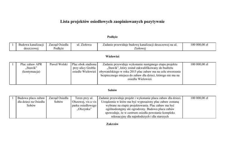 Lista projektów osiedlowych zaopiniowanych pozytywnie Podłęże 1 Budowa kanalizacji deszczowej Zarząd Osiedla Podłęże ul. Ziołowa Zadanie przewiduje budowę kanalizacji deszczowej na ul. Ziołowej 100 000,00 zł Wielowieś 1 Plac zabaw APR „Stawik” (kontynuacja) Paweł Wolski Plac obok stadionu Zadanie przewiduje wykonanie następnego etapu projektu przy ulicy Grobla „Stawik”, który został zakwalifikowany do budżetu osiedle Wielowieś obywatelskiego w roku 2015 plac zabaw ma na celu stworzenie bezpiecznego miejsca do zabaw dla dzieci, którego nie ma na osiedlu Wielowieś. 100 000,00 zł Sobów 1 Budowa placu zabaw dla dzieci na Osiedlu Sobów Zarząd Osiedla Sobów Teren przy ul. Zadanie przewiduje projekt i wykonanie placu zabaw dla dzieci. Olszowej, vis a vis Urządzenia w które ma być wyposażony plac zabaw zostaną parku osiedlowego wybrane na etapie projektowania. Plac zabaw ma być „Olszynka” ogólnodostępny ale ogrodzony. Budowa placu zabaw spowoduje, że w centrum osiedla powstanie kompleks rekreacyjny dla najmłodszych i dla starszych Zakrzów 100 000,00 zł 1 Zasypanie zbiornika wodnego w Zakrzowie pod kątem utworzenia osiedlowego kącika rekreacyjno – wypoczynkowego Zarząd Osiedla Zakrzów Osiedle Zakrzów przy ul. Plac Ludowy w miejscu znajdującego się tam obecnie zbiornika wodnego Zadanie przewiduje: zasypanie zbiornika wodnego i otoczenie tego terenu chodnikiem z kostki brukowej. W następnym etapie planuje się urządzenie w tej strefie kącika rekreacji, wypoczynku i spotkań dla mieszkańców wraz z infrastrukturą towarzyszącą takim miejscom typu : ławki, stoliki plenerowe, chodniki, kosze na śmieci oraz tereny zielone. 100 000,00 zł Nagnajów 1 Ogrodzenie budynku osiedlowego i placu zabaw oraz budowa altany Zarząd Osiedla Nagnajów Osiedle Nagnajów Projekt obejmuje : wykonanie ogrodzenia wokół budynku osiedlowego z siatki ogrodzeniowej panelowej, modernizacja drogi dojazdowej do garażu przeciwpowodziowego wraz z wymianą płyt typu Jomb na kostkę betonowa, budowę drewnianej altany na placu przy budynku osiedlowym o wymiarach 5m x 5m ( ławki + stoły), podłoże z kostki oraz wymianę ogrodzenia wokół placu zabaw z siatki ogrodzeniowej panelowej o wymiarach 19m x 19 m z bramą wejściową. Przywiśle 100 000,00 zł 1 Remont alejki – chodnika w rejonie obeliska Porucznika Sarny , Remont alejki – chodnika w „Lasku Bulońskim” Przewodniczący Osiedla „Przywiśle” Stanisław Kulig Osiedle Zadanie przewiduje :wymianę zniszczonych płyt chodnikowych Przywiśle : Alejka na kostkę brukową - chodnik rejon obeliska Porucznika Sarny, komunikacyjna na w rejonie Lasku Bulońskiego należy położyć dywanik skarpie wiślnej – asfaltowy. Projekt poprawi bezpieczeństwo mieszkańców rejon obeliska ponieważ w chwili obecnej ubytki asfaltu są bardzo zniszczone Porucznika Sarny; Alejka komunikacyjna w Lasku Bulońskim do cmentarza od strony Kościoła Chrystusa Króla. 100 000,00 zł Piastów 1 Remont ulicy Łokietka I etap Przewodnicząca Osiedla Piastów Agnieszka Korczak Ul. Łokietka Osiedle Piastów Remont ulicy Łokietka poprawi infrastrukturę miejską oraz polepszy warunki życia i funkcjonowania mieszkańców. Ułatwiony zostanie dojazd do posesji, nastąpi poprawa bezpieczeństwa jazdy jak również komunikacji pieszej oraz samochodowej. Zyska estetyka osiedla. Dzików 100 000,00 zł 1 Rewitalizacja trasy spacerowo – rowerowej od Parku Dzikowskiego do Osiedla Dzików Wiceprzewodnic Przedmiotowy Projekt obejmuje utworzenie ciągu pieszo – rowerowego, ząca Rady teren położony jest rewitalizację istniejącej drogi gruntowej przebiegającej od Parku Miasta Bożena na północ od Dzikowskiego do Muzeum Przemysłu Siarkowego położonego Kapuściak Parku na osiedlu Dzików. Przedmiotowa droga o dł. ok. 650 mb służy Dzikowskiego i mieszkańcom miasta do przemieszczania się pieszego oraz obejmuje rowerowego z centrum miasta do osiedli Dzików, Podłęże a istniejącą drogę także Zakrzów, jest ważnym szlakiem komunikacji oraz gruntową łączącą spacerowym dla mieszkańców miasta a także młodzieży Muzeum Siarki z szkolnej. Parkiem Dzikowskim oraz przyległy teren do drogi. 100 000,00 zł 2 Rewitalizacja zabytkowej fontanny w Parku Dzikowskim – „ daj fontannie nowe życie” Janusz Wepsięć Konrad Niedźwiedź 100 000,00 zł 3 Zakup kserokopiarki Radna Miasta Szkoła dla Szkoły Tarnobrzeg Anna Podstawowa nr 9 Podstawowej nr 9 im. Pekar im. Jana Pawła II Jana Pawła II w w Tarnobrzegu ul. Tarnobrzegu Wiejska 4 na osiedlu Dzików Zabytkowy Park Tarnowskich w Dzikowie – przy północnej skarpie Zadanie obejmuje przywrócenie pełnej funkcjonalności zabytkowej fontannie w Parku Tarnowskich. Sprawna i działająca fontanna będzie dużą atrakcją obiektu, ponadto element wodny przyczyni się do wytworzenia mikroklimatu dając ochłodę spacerowiczom w upalne dni. Fontanna jest ważnym elementem kompozycyjnym, który zasługuje na odbudowę. Projekt przewiduje zakup urządzenia kserokopiarki dla SP nr 9 w Tarnobrzegu. Kserokopiarka firmy SHARP AR – 6023 N to szybkie, gotowe do pracy w sieci, monochromatyczne urządzenie wielofunkcyjne A3 o uniwersalnej konstrukcji. Podsumowując urządzenie znacznie ułatwi pracę i naukę w Szkole. Sielec 5 000,00 zł 1 2 Budynek przedszkola Przewodniczący niepublicznego wraz Osiedla Sielec z mieszkaniem Michał Wiącek komunalnym Budynek Domu Przewodniczący Ludowego Osiedla Sielec Michał Wiącek Ul. Sielecka 26 Ul. Sielecka 29 Zadanie przewiduje: wymianę stolarki okiennej oraz wykonanie dociepleń ścian fundamentowych. Docieplenie ścian budynku oraz wykonanie kolorystyki poprawi wizerunek, gdyż obecnie występują duże ubytki tynku. Zadanie przewiduje docieplenie ścian budynku oraz wykonanie kolorystyki. Poprawi to wizerunek i estetykę budynku, gdyż obecnie występują duże ubytki tynku. Projekt również uwzględnia wymianę ogrodzenia. Serbi