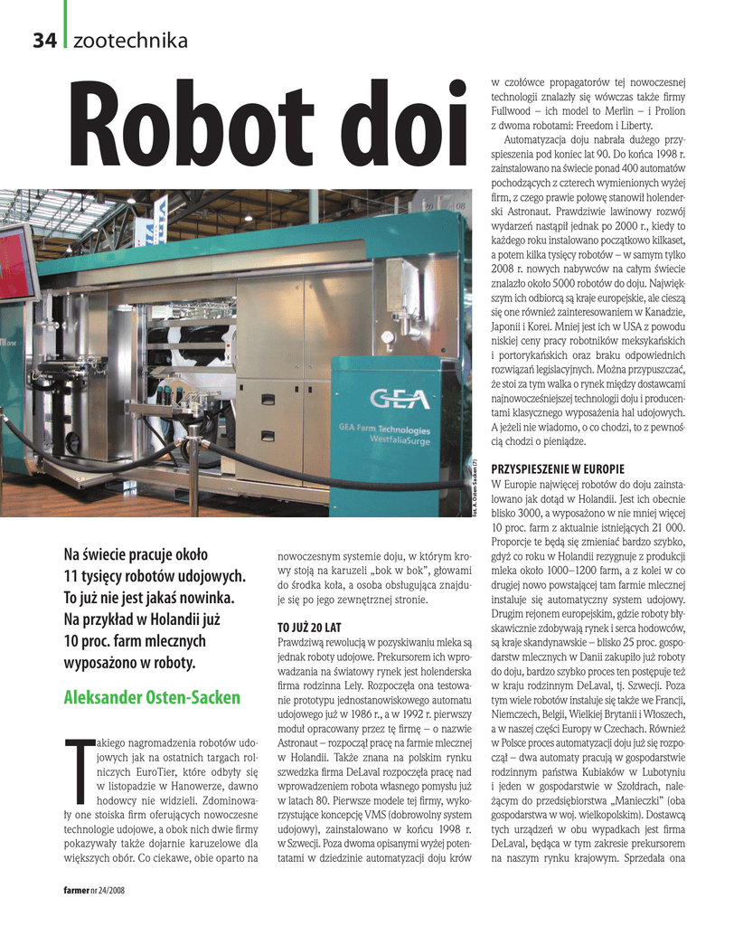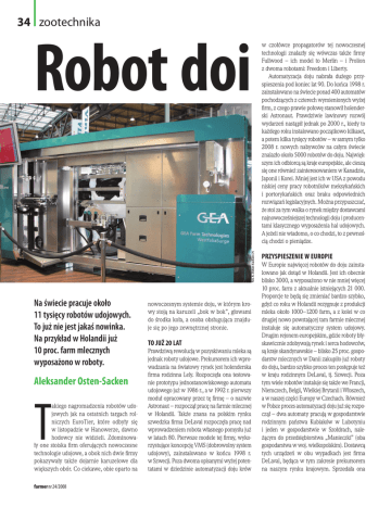34 zootechnika fot. A. Osten-Sacken (7) Robot doi Na świecie pracuje około 11 tysięcy robotów udojowych. To już nie jest jakaś nowinka. Na przykład w Holandii już 10 proc. farm mlecznych wyposażono w roboty. Aleksander Osten-Sacken T akiego nagromadzenia robotów udojowych jak na ostatnich targach rolniczych EuroTier, które odbyły się w listopadzie w Hanowerze, dawno hodowcy nie widzieli. Zdominowały one stoiska firm oferujących nowoczesne technologie udojowe, a obok nich dwie firmy pokazywały także dojarnie karuzelowe dla większych obór. Co ciekawe, obie oparto na farmer nr 24/2008 nowoczesnym systemie doju, w którym krowy stoją na karuzeli „bok w bok”, głowami do środka koła, a osoba obsługująca znajduje się po jego zewnętrznej stronie. To już 20 lat Prawdziwą rewolucją w pozyskiwaniu mleka są jednak roboty udojowe. Prekursorem ich wprowadzania na światowy rynek jest holenderska firma rodzinna Lely. Rozpoczęła ona testowanie prototypu jednostanowiskowego automatu udojowego już w 1986 r., a w 1992 r. pierwszy moduł opracowany przez tę firmę – o nazwie Astronaut – rozpoczął pracę na farmie mlecznej w Holandii. Także znana na polskim rynku szwedzka firma DeLaval rozpoczęła pracę nad wprowadzeniem robota własnego pomysłu już w latach 80. Pierwsze modele tej firmy, wykorzystujące koncepcję VMS (dobrowolny system udojowy), zainstalowano w końcu 1998 r. w Szwecji. Poza dwoma opisanymi wyżej potentatami w dziedzinie automatyzacji doju krów w czołówce propagatorów tej nowoczesnej technologii znalazły się wówczas także firmy Fullwood – ich model to Merlin – i Prolion z dwoma robotami: Freedom i Liberty. Automatyzacja doju nabrała dużego przyspieszenia pod koniec lat 90. Do końca 1998 r. zainstalowano na świecie ponad 400 automatów pochodzących z czterech wymienionych wyżej firm, z czego prawie połowę stanowił holenderski Astronaut. Prawdziwie lawinowy rozwój wydarzeń nastąpił jednak po 2000 r., kiedy to każdego roku instalowano początkowo kilkaset, a potem kilka tysięcy robotów – w samym tylko 2008 r. nowych nabywców na całym świecie znalazło około 5000 robotów do doju. Największym ich odbiorcą są kraje europejskie, ale cieszą się one również zainteresowaniem w Kanadzie, Japonii i Korei. Mniej jest ich w USA z powodu niskiej ceny pracy robotników meksykańskich i portorykańskich oraz braku odpowiednich rozwiązań legislacyjnych. Można przypuszczać, że stoi za tym walka o rynek między dostawcami najnowocześniejszej technologii doju i producentami klasycznego wyposażenia hal udojowych. A jeżeli nie wiadomo, o co chodzi, to z pewnością chodzi o pieniądze. Przyspieszenie w Europie W Europie najwięcej robotów do doju zainstalowano jak dotąd w Holandii. Jest ich obecnie blisko 3000, a wyposażono w nie mniej więcej 10 proc. farm z aktualnie istniejących 21 000. Proporcje te będą się zmieniać bardzo szybko, gdyż co roku w Holandii rezygnuje z produkcji mleka około 1000–1200 farm, a z kolei w co drugiej nowo powstającej tam farmie mlecznej instaluje się automatyczny system udojowy. Drugim rejonem europejskim, gdzie roboty błyskawicznie zdobywają rynek i serca hodowców, są kraje skandynawskie – blisko 25 proc. gospodarstw mlecznych w Danii zakupiło już roboty do doju, bardzo szybko proces ten postępuje też w kraju rodzinnym DeLaval, tj. Szwecji. Poza tym wiele robotów instaluje się także we Francji, Niemczech, Belgii, Wielkiej Brytanii i Włoszech, a w naszej części Europy w Czechach. Również w Polsce proces automatyzacji doju już się rozpoczął – dwa automaty pracują w gospodarstwie rodzinnym państwa Kubiaków w Lubotyniu i jeden w gospodarstwie w Szołdrach, należącym do przedsiębiorstwa „Manieczki” (oba gospodarstwa w woj. wielkopolskim). Dostawcą tych urządzeń w obu wypadkach jest firma DeLaval, będąca w tym zakresie prekursorem na naszym rynku krajowym. Sprzedała ona zootechnika 35 zresztą w Polsce kolejnych 6 robotów, które będą instalowane w oborach z początkiem następnego roku. Można się spodziewać, że to dopiero początek i w ślad za pionierami automatyzacji pójdą następni hodowcy. Proces ten może jednak zostać poważnie zahamowany przez niskie aktualnie ceny mleka w Polsce, Europie i na świecie, ograniczając znacznie możliwości inwestycyjne rolników. Dlaczego roboty? Co powoduje, że tak wielu hodowców decyduje się na zakup robotów do doju? Przede wszystkim chodzi o uwolnienie się od codziennego obowiązku dwukrotnego doju krów, co jest największą uciążliwością przy tym kierunku produkcji. Wielu młodym ludziom trudno jest zdecydować się na takie uwiązanie przy gospodarstwie, dlatego automatyzacja doju w dużej mierze może pomóc rozwiązać problem następców dla aktualnych właścicieli stad. Nie bez znaczenia jest też wzrost prestiżu hodowcy korzystającego z najnowocześniejszej technologii i elektroniki oraz związane z tym poczucie własnej wartości. Po wprowadzeniu robotów obserwuje się wzrost wydajności mleka nawet do 15 proc., przy jednoczesnym spadku liczby komórek somatycznych w mleku. Jest to efekt częstszego doju krów i specjalnych rozwiązań, które sprzyjają dobrej zdrowotności wymion. Negatywnym zjawiskiem może być pogorszenie się składu mleka, jednak można temu zapobiec poprzez odpowiednie żywienie i pracę hodowlaną w stadzie. W kontekście pracy hodowlanej trzeba też wspomnieć o konieczności ciągłego poprawiania budowy wymion u krów, co jest ważnym elementem związanym z automatyzacją doju. Robot od podstaw Dla osób, które jeszcze nigdy nie zetknęły się z automatyzacją doju, warto podać kilka informacji ogólnych, wspólnych dla wszystkich robotów. Pierwsza sprawa to stacja paszowa – jest ona zintegrowana z robotem i stanowi niejako wabik dla krów. Jest to konieczne, gdyż krowy mają zapewniony stały całodobowy dostęp do robota, a