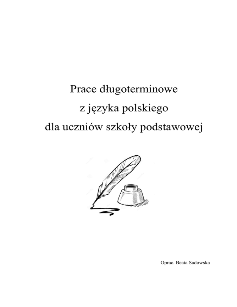 Prace długoterminowe z języka polskiego dla uczniów szkoły podstawowej Oprac. Beata Sadowska CEL GŁÓWNY: - rozwijanie zdolności i zainteresowań poznawczych ucznia. CELE SZCZEGÓŁOWE: - poszukiwanie, porządkowanie i wykorzystywanie informacji z różnych źródeł, - rozbudzanie zainteresowań czytelniczych i teatralnych, - przygotowanie do publicznych wystąpień, - posługiwanie się technologią informacyjną, - efektywne współdziałanie w zespole, - pogłębianie aktywności poznawczej ucznia, pomoc w rozwijaniu jego osobistych zainteresowań, - poprawne budowanie tekstu z zastosowaniem środków językowych i przy przestrzeganiu norm ortograficznych, gramatycznych i interpunkcyjnych, - uwzględnienie indywidualnych potrzeb, zainteresowań i uzdolnień ucznia. METODY REALIZACJI: portfolio / folder drama przekład intersemiotyczny pokaz FORMY REALIZACJI I PREZENTACJI EFEKTÓW PRACY UCZNIÓW: sprawozdania foldery inscenizacje wystawy UCZESTNICY: uczniowie klas 4-6 szkoły podstawowej PROPOZYCJE PRAC DŁUGOTERMINOWYCH DLA POSZCZEGÓLNYCH KLAS SZKOŁY PODSTAWOWEJ KLASA IV (1) Poniższa praca długoterminowa wprowadzana jest po omówieniu „Akademii Pana Kleksa” Jana Brzechwy. INSTRUKCJA DLA UCZNIA: Wyobraź sobie, że jesteś dyrektorem własnej szkoły, ale nie takiej, do której chodzisz teraz. To będzie szkoła niezwykła, o której marzy każdy uczeń. To Ty, jako dyrektor, zadecydujesz, jakich przedmiotów będą uczyć się uczniowie, kim będą wykładowcy, a także, jak będzie wyglądał budynek. Praktycznie decydujesz o wszystkim, co się tam dzieje – ile czasu trwają przerwy, jak wyglądają sale itp. Jesteś ograniczony jedynie przez swoją wyobraźnię. Twoją pracą będzie stworzenie FOLDERU, w którym zaprezentujesz wymarzoną szkołę. Postaraj się o ilustracje i zgodność z następującym spisem treści: 1. Opis szkoły. 2. Prawa i obowiązku ucznia. 3. System oceniania. 4. Przedmioty nauczane w szkole. 5. Wykładowcy. 6. Tygodniowy plan zajęć. W razie wątpliwości konsultuj się z nauczycielem. Na wykonanie swojej pracy masz czas do …………… Powodzenia! KLASA IV (2) Praca długoterminowa polegająca na stworzeniu LEKSYKONU UCZNIA, po omówieniu większości zasad ortograficznych – przydaje się na kolejne lata nauki, jest świetnym powtórzeniem zdobytej wiedzy. INSTRUKCJA DLA UCZNIA: Wyobraź sobie, że zgłosił się do Ciebie wydawca poradników dla dzieci i młodzieży. Pragnie złożyć Ci całkiem korzystną, nieźle opłacaną propozycję. Otóż proponuje Ci napisanie LEKSYKONU 4-KLASISTY, w którym, w bardzo przystępny sposób, opiszesz reguły ortograficzne, wyjaśnisz znaczenie poszczególnych haseł i ułożysz kilka krzyżówek lub rebusów. Postaraj się o estetyczne, pełne ilustracji wydanie, dzięki temu możesz liczyć na korzystną umowę z wydawnictwem i stać się znanym i cenionym autorem leksykonów szkolnych! LEKSYKON 4-KLASISTY ma się składać z 3 rozdziałów zapisanych na spiętych kartkach w formie książeczki lub w oddzielnym zeszycie. Pamiętaj o estetycznym zapisie, stronie tytułowej (okładce) i ilustracjach (dowolna technika). Prace mają być stworzone odręcznie (nie na komputerze). Rozdział 1 – Reguły ortograficzne (opiszesz w nim reguły ortograficzne dotyczące pisowni wyrazów z „rz”, „ż”, „ó”, „u”, „ch”, „h” + przykłady i wyjątki). Rozdział 2 – Pojęcia (ułożysz w kolejności alfabetycznej i wyjaśnisz następujące hasła: związek frazeologiczny, homonim, synonim, antonim, epitet, porównanie, przenośnia (czyli metafora), onomatopeja (czyli dźwiękonaśladownictwo), ożywienie, uosobienie, wyrazy pokrewne, podmiot liryczny, narrator). Rozdział 3 – Zadania (ułóż krzyżówkę polonistyczną i 2 zadania ortograficzne – mogą to być rebusy, wykreślanki, testy z lukami do uzupełnienia. W tym rozdziale muszą się pojawić również rozwiązania wymyślonych przez Ciebie zadań). Na wykonanie pracy masz czas do …………. Powodzenia! KLASA V (1) Poniższa praca długoterminowa wprowadzana jest równolegle z lekcjami dotyczącymi mitologii greckiej. INSTRUKCJA DLA UCZNIA: Zbierz jak najwięcej informacji o wylosowanej przez Ciebie postaci z panteonu bogów greckich. Następnie wymyśl odpowiednie przebranie i zaprezentuj swoją postać przed klasą w ramach kilkuminutowego wystąpienia. W razie wątpliwości skonsultuj się z nauczycielem. Na przygotowanie się do prezentacji masz czas do …………………… Postaci do wylosowania: AFRODYTA – bogini miłości. Urodziła się z krwi okaleczonego Uranosa zmieszanej z pianą morską. „Wyłoniona z morskiej piany”, czasem kojarzona z morską muszlą. APOLLO - bóg słońca, patron poezji, muzyki, sztuk i nauk, przewodnik muz. ARES - bóg wojny, utożsamiany z rzymskim Marsem. ARTEMIDA - bogini świata zwierzęcego i roślinnego, w późniejszych okresie czczona jako dziewicza bogini lasów i gór, łowów i dzikich zwierząt. ASKLEPIOS - bóg sztuki lekarskiej, w Rzymie czczono Asklepiosa pod imieniem Eskulapa. Atrybut to węże owinięte wokół laski. ATENA - bogini pokoju i wojny słusznej, wyskoczyła z głowy Zeusa, dlatego uważana była za usposobienie wszelkiego rozumu i mądrości. DEMETER - bogini pól i urodzajów, córka Kronosa i Rei. Przedstawiano ją jako poważną niewiastę z wieńcem na głowie, sierpem i pochodnią lub koszem owoców w ręku. DIONIZOS - bóg winnej latorośli, wina i płodnych sił przyrody, syn Zeusa i Semele. EOS - bogini rozpoczynającego się dnia. ERIS - bogini niezgody i kłótni, jedna z cór Nocy. Eris rozgniewana, że nie została zaproszona na wesele Peleusa i Tetydy, rzuciła między boginię jabłko z napisem "dla najpiękniejszej", doprowadziło to do sporu między Herą, Ateną i Afrodytą. EROS - bóg miłości. W Rzymie utożsamiany z Amorem. HADES - bóg zmarłych, władca świata podziemnego, syn Kronosa i Rei, brat Zeusa i Posejdona, m