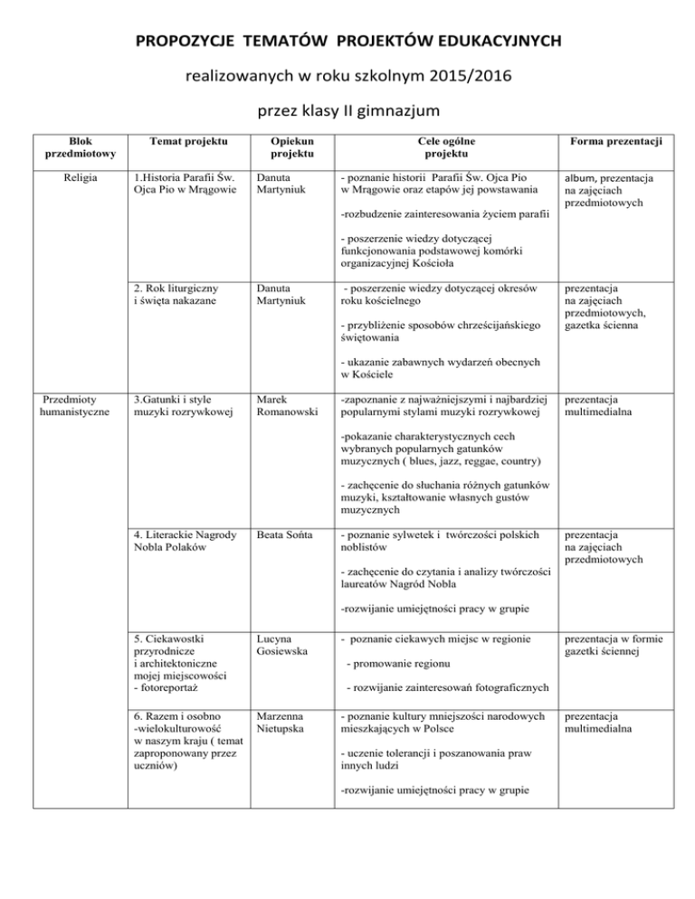 PROPOZYCJE TEMATÓW PROJEKTÓW EDUKACYJNYCH realizowanych w roku szkolnym 2015/2016 przez klasy II gimnazjum Blok przedmiotowy Religia Temat projektu 1.Historia Parafii Św. Ojca Pio w Mrągowie Opiekun projektu Danuta Martyniuk Cele ogólne projektu - poznanie historii Parafii Św. Ojca Pio w Mrągowie oraz etapów jej powstawania -rozbudzenie zainteresowania życiem parafii Forma prezentacji album, prezentacja na zajęciach przedmiotowych - poszerzenie wiedzy dotyczącej funkcjonowania podstawowej komórki organizacyjnej Kościoła 2. Rok liturgiczny i święta nakazane Danuta Martyniuk - poszerzenie wiedzy dotyczącej okresów roku kościelnego - przybliżenie sposobów chrześcijańskiego świętowania prezentacja na zajęciach przedmiotowych, gazetka ścienna - ukazanie zabawnych wydarzeń obecnych w Kościele Przedmioty humanistyczne 3.Gatunki i style muzyki rozrywkowej Marek Romanowski -zapoznanie z najważniejszymi i najbardziej popularnymi stylami muzyki rozrywkowej prezentacja multimedialna -pokazanie charakterystycznych cech wybranych popularnych gatunków muzycznych ( blues, jazz, reggae, country) - zachęcenie do słuchania różnych gatunków muzyki, kształtowanie własnych gustów muzycznych 4. Literackie Nagrody Nobla Polaków Beata Sońta - poznanie sylwetek i twórczości polskich noblistów prezentacja na zajęciach przedmiotowych - zachęcenie do czytania i analizy twórczości laureatów Nagród Nobla -rozwijanie umiejętności pracy w grupie 5. Ciekawostki przyrodnicze i architektoniczne mojej miejscowości - fotoreportaż Lucyna Gosiewska 6. Razem i osobno -wielokulturowość w naszym kraju ( temat zaproponowany przez uczniów) Marzenna Nietupska - poznanie ciekawych miejsc w regionie prezentacja w formie gazetki ściennej - promowanie regionu - rozwijanie zainteresowań fotograficznych - poznanie kultury mniejszości narodowych mieszkających w Polsce - uczenie tolerancji i poszanowania praw innych ludzi -rozwijanie umiejętności pracy w grupie prezentacja multimedialna 7. Zasłużeni mieszkańcy naszego miasta Beata Więcek - poznanie życiorysów i działalności zasłużonych mrągowian prezentacja w formie gazetki ściennej - poznanie historii małej ojczyzny - zaznajomienie z wkładem zasłużonych mrągowian w rozwój naszego miasta 8.Migracje Polaków na przestrzeni wieków (XIX – XX wiek) Katarzyna Oman - Janczewska -poznanie przyczyn migracji Polaków - rozwijanie umiejętności poszukiwania i analizowania informacji prezentacja na zajęciach przedmiotowych - wskazanie kierunków migracji - rozwijanie umiejętności prezentowania rezultatów własnej pracy na forum publicznym Przedmioty matematyczno - przyrodnicze 9.Czy wiem ile chemii jem? Karolina Kodź - Wichowska - wyszukiwanie informacji na etykietach produktów spożywczych prezentacja multimedialna, gazetka w gablocie - poznanie konserwantów - wykrywanie składników odżywczych w produktach spożywczych 10. Zasoby wodne Ziemi Katarzyna Szablak - zapoznanie się z zasobami wodnymi Ziemi, typami mórz - poznanie wybranych cech wód wszechoceanu oraz możliwościami gospodarczego wykorzystania wód podziemnych prezentacja na lekcji geografii lub zajęciach koła geograficznego - rozwijanie umiejętności poszukiwania, analizowania informacji - rozwijanie umiejętności prezentowania rezultatów własnej pracy na forum publicznym - wykorzystywanie najnowszych technologii w trakcie pracy 11.Cechy populacji biologicznej na przykładzie populacji naszego miasta 12. Kuchenka mikrofalowaprzyjaciel czy wróg? Barbara Bąbka - kształtowanie umiejętności pracy zespołowej - kształtowanie umiejętności zdobywania informacji z różnych źródeł i ich analizy - kształtowanie umiejętności pracy zespołowej Iwona Michnowicz - doskonalenie umiejętności opracowywania i prezentacji danych. - poznanie widma fal elektromagnetycznych - charakterystyka promieniowania mikrofalowego, zastosowanie i właściwości - poznanie zasady działania kuchenki mikrofalowej - określenie zalet i wad kuchni mikrofalowej - kształtowanie własnych opinii na podstawie poznanych faktów prezentacja na zajęciach przedmiotowych, gazetka ścienna prezentacja na zajęciach przedmiotowych 13. Jaki jest miesięczny koszt utrzymania statystycznej rodziny? Ewa Chodkowska - kształtowanie i rozwijanie umiejętności zbierania, porządkowania, selekcjonowania, opracowywania i analizowania danych prezentacja multimedialna na zajęciach przedmiotowych - nabywanie umiejętności obliczania wydatków tygodniowych z wykorzystaniem rachunku procentowego - kształtowanie umiejętności pracy w grupie i współdziałania w zespole organizacyjnym 14. Liczba π i jej historia. Justyna Wanago - poznanie historii liczby π - poznanie najczęstszych przybliżeń liczby π i jej zastosowań prezentacja na zajęciach przedmiotowych, gazetka w gablocie - kształtowanie umiejętności pracy w grupie 15. Co słychać w naszej szkole? sondaż Lucyna Obrycka - rozwijanie umiejętności zbierania, porządkowania, selekcjonowania, opracowywania i analizowania informacji na temat szkoły - doskonalenie stosowania obliczeń procentowych prezentacja na zajęciach przedmiotowych lub spotkaniu z rodzicami, gazetka w gablocie - praktyczne zastosowanie diagramów 16. Thanksgiving Day – tradycje związane ze Świętem Dziękczynienia Marek Madej - pogłębianie wiedzy w zakresie słownictwa - zapoznanie z kulturą obchodzenia Święta Dziękczynienia, tradycjami związanymi z tym świętem prezentacja multimedialna, plakat, album - rozwijanie umiejętności zbierania, porządkowania, selekcjonowania informacji 17. Saint Patrick’s Day - Tradycje związane z dniem Św. Patryka Joanna Kotuszewska - rozwijanie umiejętności pracy w grupie - kształtowanie umiejętności zdobywania wiedzy z różnych źródeł prezentacja multimedialna, plakat, album. -zapoznanie z kulturą obchodzenia dnia Świętego Patryka, tradycjami związanymi z tym Świętem -pogłębi