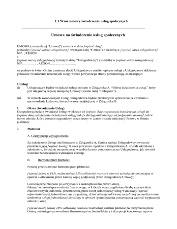 1.1.Wzór umowy świadczenia usług społecznych _____________________________________________________________________ Umowa na świadczenie usług społecznych UMOWA (zwana dalej “Umową”) zawarta w dniu [wpisać datę], pomiędzy [wpisać nazwę usługobiorcy] (zwanym dalej “Gminą”) z siedzibą w [wpisać adres usługobiorcy] NIP: , REGON: a [wpisać nazwę usługodawcy] (zwanym dalej “Usługodawcą”) z siedzibą w [wpisać adres usługodawcy] NIP:………… , REGON……………………… na podstawie której Gmina zamierza zlecić Usługodawcy poniżej opisane usługi a Usługodawca deklaruje gotowość świadczenia rzeczonych usług, wobec powyższego strony postanawiają, co następuje: 1.Usługi (i) Usługodawca będzie świadczył usługi opisane w Załączniku A, “Oferta świadczenia usług,” który jest integralną częścią niniejszej Umowy (zwane dalej “Usługami”). (ii) W ramach świadczonych Usług Usługodawca będzie przekazywał sprawozdania kwartalne i sprawozdanie końcowe, których wzory znajdują się w Załączniku B 2. Okres (świadczenia Usług) Usługodawca będzie świadczył Usługi w okresie od [wpisać datę rozpoczęcia świadczenia usług] do [wpisać datę zakończenia świadczenia usług] lub [x dni/tygodni/miesięcy od podpisania umowy], lub w innym okresie, który zostanie uzgodniony przez strony w czasie trwania niniejszej Umowy w formie pisemnej. 3. Płatności A. Górny pułap wynagrodzenia Za świadczone Usługi zdefiniowane w Załączniku A, Gmina zapłaci Usługodawcy kwotę nie przekraczającą [wpisać kwotę]. Kwota powyższa, zgodnie z Załącznikiem A, została określona z założeniem, że będzie ona pokrywać wszelkie koszty ponoszone przez Usługodawcę, jak również wszelkie zobowiązania wynikające z usługi. B. Harmonogram płatności Poniżej przedstawiono harmonogram płatności: [wpisać kwotę w PLN, maksymalnie 25% całkowitej wartości umowy) zaliczka aktywizacyjna w oparciu o otrzymaną przez Gminę kopię podpisanej przez Usługodawcę Umowy; Comiesięczne płatności po otrzymaniu i zaakceptowaniu przez Gminę faktury/rachunku/sprawozdania finansowego, w których wyszczególniono liczbę rzeczywiście zrealizowanych jednostek, przemnożoną przez koszt jednostkowy usług wynoszący (wpisać odpowiedni koszt jednostkowy, np. za godzinę, dzień, miesiąc lub kwotę ryczałtową za zrealizowanie konkretnej usługi jednostkowej określony w ofercie) (pomniejszoną o miesięczną wartość wypłaconej zaliczki); oraz [wpisać kwotę równą 20% całkowitej wartości kontraktu] ostatnia płatność po otrzymaniu przez Gminę ostatniego sprawozdania finansowego/rachunku/faktury i akceptacji końcowego raportu podsumowującego efekt wyświadczonych usług (łącznie z badaniem satysfakcji usługobiorców – jeśli ma zastosowanie). C. Zasady płatności Przelewy będą dokonywane nie później niż 30 dni po otrzymaniu przez Koordynatora, którym będzie osoba zdefiniowana w punkcie 4, sprawozdania finansowego /rachunku/faktury (w dwóch egzemplarzach) na konto banku [wpisać numer konta bankowego Usługodawcy) 4. Zarządzanie projektem A. Koordynator. Gmina powołuje Pana/Panią [wpisać nazwisko] na stanowisko Koordynatora reprezentującego Gminę; Koordynator będzie odpowiedzialny za koordynowanie działań prowadzonych w ramach niniejszej Umowy. B. Raporty. Raporty opisane w Załączniku B będą przedkładane w trakcie realizacji zlecenia i będą stanowić podstawę do dokonywania płatności określonych w punkcie 3. 5. Standard świadczonych usług Usługodawca zobowiązuje się świadczyć Usługi zgodnie z najwyższymi standardami odpowiedzialności i kompetencji zawodowej i etycznej. Usługodawca niezwłocznie zatrudni inną osobę na stanowisko pracownika, którego Gmina uzna za niespełniającego jej oczekiwań. 6. Poufność Usługodawca w czasie trwania Umowy i dwóch lat po jej wygaśnięciu nie będzie ujawniał jakichkolwiek wewnętrznych (zastrzeżonych) lub poufnych informacji dotyczących usług, niniejszej Umowy, bądź interesów lub działań Gminy, chyba że Gmina wyrazi na to pisemną zgodę. 7. Prawo własności 1. Wszelkie opracowania, raporty, lub inne materiały – graficzne, w formie oprogramowania komputerowego, lub inne – przygotowane przez Usługodawcę dla Gminy w ramach niniejszej Umowy będą i pozostaną własnością Gminy. Usługodawca może zatrzymać kopie powyżej wspomnianych dokumentów bądź oprogramowania. [2. Środki trwałe zakupione w ramach projektu przez Usługodawcę pozostają własnością Usługodawcy do końca realizacji umowy. Po jej zakończeniu, własność tych środków trwałych przechodzi na Gminę. W przypadku kontynuacji przez Usługodawcę usług będących przedmiotem niniejszej umowy, Gmina może zgodzić się na dalsze wykorzystywanie tych środków trwałych przez Usługodawcę]. lub [2. Środki trwałe zakupione przez Usługodawcę celem realizacji usług integracji społecznej w ramach umowy zawartej z Gminą i sfinansowane w całości z funduszy PPWOW muszą być wykorzystywane do realizacji usług społecznych minimum przez okres 3 lat. W przypadku rezygnacji przez Usługodawcę z realizowania usług społecznych po zakończeniu umowy z Gminą jest on zobowiązany do: - przekazania ww. środków trwałych organizacji pozarządowej lub jednostce organizacyjnej gminy prowadzącej działania w zakresie usług społecznych na terenie tej Gminy, lub - zwrotu otrzymanych na ten cel środków wraz z odsetkami w wysokości ustawowej od dnia zakończenia wykonywania usługi i po potrąceniu kosztów zużycia, zgodnie z formułą: wartość zakupu środka trwałego/36 (bazowy 3 letni okres użytkowania) * ilość miesięcy, przez które środek trwały był wykorzystywany do realizacji usług w ramach zawartej z Gminą umowy.] 8. Zakaz działań naruszających konkurencję Usługodawca wyraża zgodę, iż w okresie obowiązywania nini