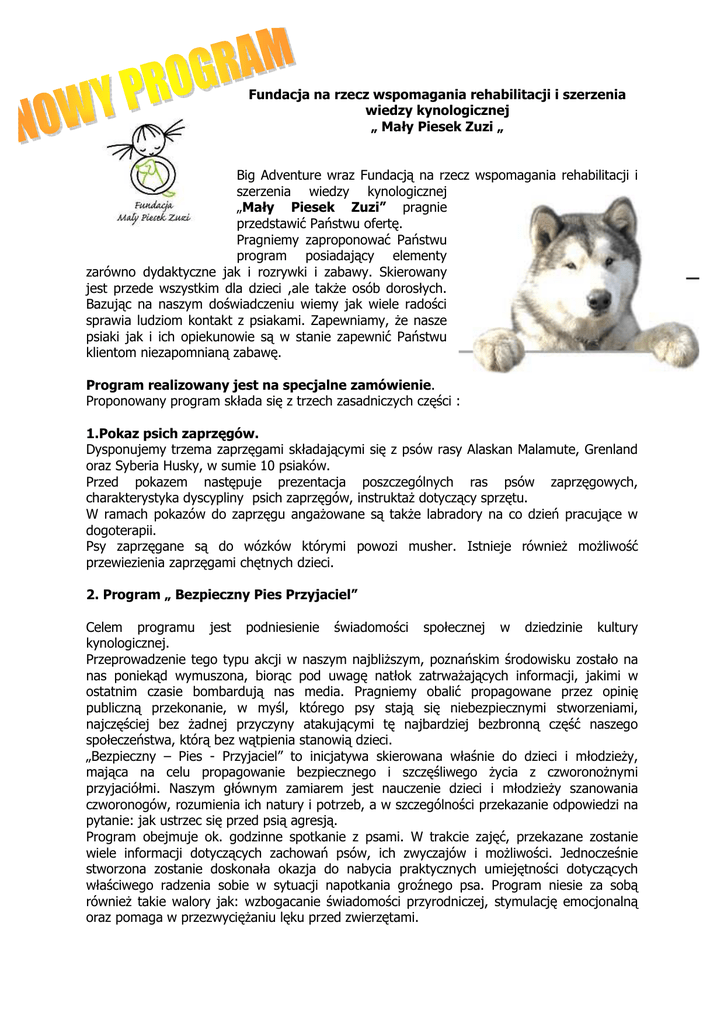 Fundacja na rzecz wspomagania rehabilitacji i szerzenia wiedzy kynologicznej „ Mały Piesek Zuzi „ Big Adventure wraz Fundacją na rzecz wspomagania rehabilitacji i szerzenia wiedzy kynologicznej „Mały Piesek Zuzi” pragnie przedstawić Państwu ofertę. Pragniemy zaproponować Państwu program posiadający elementy zarówno dydaktyczne jak i rozrywki i zabawy. Skierowany jest przede wszystkim dla dzieci ,ale takŜe osób dorosłych. Bazując na naszym doświadczeniu wiemy jak wiele radości sprawia ludziom kontakt z psiakami. Zapewniamy, Ŝe nasze psiaki jak i ich opiekunowie są w stanie zapewnić Państwu klientom niezapomnianą zabawę. Program realizowany jest na specjalne zamówienie. Proponowany program składa się z trzech zasadniczych części : 1.Pokaz psich zaprzęgów. Dysponujemy trzema zaprzęgami składającymi się z psów rasy Alaskan Malamute, Grenland oraz Syberia Husky, w sumie 10 psiaków. Przed pokazem następuje prezentacja poszczególnych ras psów zaprzęgowych, charakterystyka dyscypliny psich zaprzęgów, instruktaŜ dotyczący sprzętu. W ramach pokazów do zaprzęgu angaŜowane są takŜe labradory na co dzień pracujące w dogoterapii. Psy zaprzęgane są do wózków którymi powozi musher. Istnieje równieŜ moŜliwość przewiezienia zaprzęgami chętnych dzieci. 2. Program „ Bezpieczny Pies Przyjaciel” Celem programu jest podniesienie świadomości społecznej w dziedzinie kultury kynologicznej. Przeprowadzenie tego typu akcji w naszym najbliŜszym, poznańskim środowisku zostało na nas poniekąd wymuszona, biorąc pod uwagę natłok zatrwaŜających informacji, jakimi w ostatnim czasie bombardują nas media. Pragniemy obalić propagowane przez opinię publiczną przekonanie, w myśl, którego psy stają się niebezpiecznymi stworzeniami, najczęściej bez Ŝadnej przyczyny atakującymi tę najbardziej bezbronną część naszego społeczeństwa, którą bez wątpienia stanowią dzieci. „Bezpieczny – Pies - Przyjaciel” to inicjatywa skierowana właśnie do dzieci i młodzieŜy, mająca na celu propagowanie bezpiecznego i szczęśliwego Ŝycia z czworonoŜnymi przyjaciółmi. Naszym głównym zamiarem jest nauczenie dzieci i młodzieŜy szanowania czworonogów, rozumienia ich natury i potrzeb, a w szczególności przekazanie odpowiedzi na pytanie: jak ustrzec się przed psią agresją. Program obejmuje ok. godzinne spotkanie z psami. W trakcie zajęć, przekazane zostanie wiele informacji dotyczących zachowań psów, ich zwyczajów i moŜliwości. Jednocześnie stworzona zostanie doskonała okazja do nabycia praktycznych umiejętności dotyczących właściwego radzenia sobie w sytuacji napotkania groźnego psa. Program niesie za sobą równieŜ takie walory jak: wzbogacanie świadomości przyrodniczej, stymulację emocjonalną oraz pomaga w przezwycięŜaniu lęku przed zwierzętami. Program ten trwa około godziny i podczas imprezy moŜe być przedstawiony 2 razy. 3. Proponujemy takŜe szereg konkursów i zabaw przeznaczonych dla dzieci, a takŜe pokazy umiejętności naszych psów , tor przeszkód, sztuczki z psiakami. Konkursy są atrakcyjne nie tylko dla dzieci biorących w nich udział, ale takŜe dla widzów. Konkursy przeprowadzane są z udziałem naszych psiaków: - łowienie psa na wędkę - łapanie piłeczek - slalom z przeszkodami (dzieciaki samodzielnie prowadzą psy) - psie puzle - psie kolorowanki - ciepło – zimno - psie kalambury Gdzie konkursy tam nagrody ;-) , W naszej fundacji pracują psy rasy: - labrador: Ciastka, Rafik, Kongo, Foggy, Zafra - golden retrivier: Axel - flat coated retriever: Terii - Alaskan Malamute, Grenland: Sesylia, Balto, Hafciu, Szafir, Atejuk - beagle : Fiona - cocker spaniel : Mel - kawalier : Biełka Podczas imprezy psy są cały czas do dyspozycji dzieci, moŜna robić sobie z nimi zdjęcia. Proponujemy takŜe pogadanki mające na celu przybliŜenie poszczególnych ras psów, a takŜe przedstawienie podstawowych zasad dogoterapii. Fundacja dysponuje wolontariuszami, którzy zajmą się dzieciakami. Dla bezpieczeństwa Ŝaden pies nie pozostaje bez opieki wolontariusza. Program w całości to około 5 godzin. Istnieje moŜliwość zmiany programowych i dopasowania ich do Państwa potrzeb. Koszty do uzgodnienia. (UzaleŜnione od ilości uczestników). Organizator i rezerwacja terminów: Stowarzyszenie Klub Turystyki Niekonwencjonalnej „Big Adventure” tel. kom. 607867082 e-mail: [email protected] www.bigadventure.pl