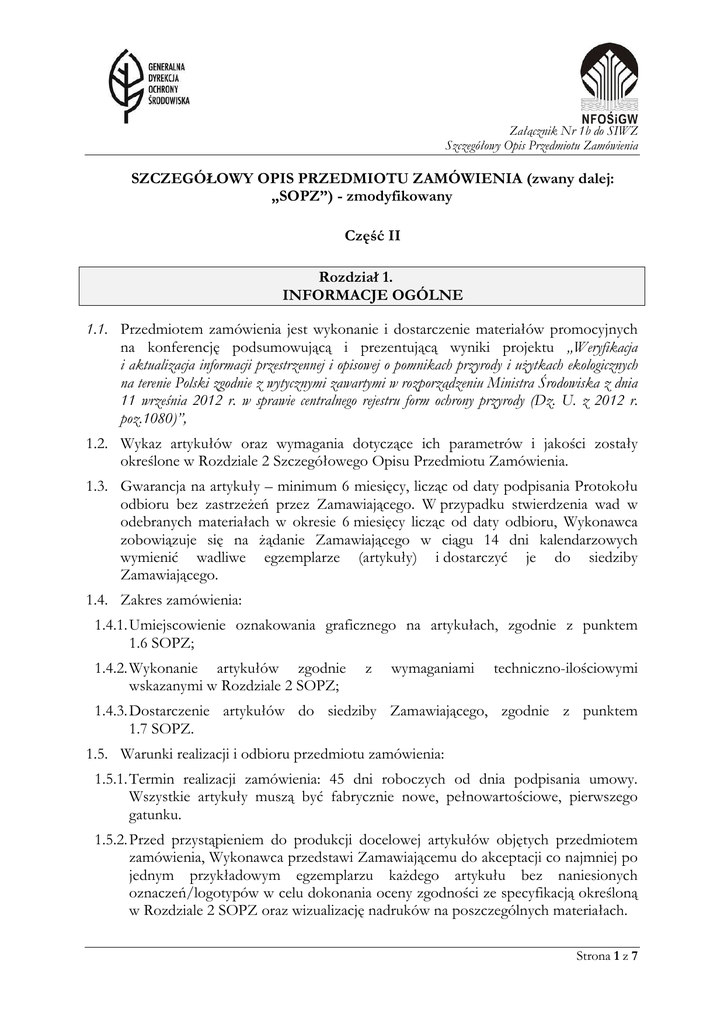 Załącznik Nr 1b do SIWZ Szczegółowy Opis Przedmiotu Zamówienia SZCZEGÓŁOWY OPIS PRZEDMIOTU ZAMÓWIENIA (zwany dalej: „SOPZ”) - zmodyfikowany Część II Rozdział 1. INFORMACJE OGÓLNE 1.1. Przedmiotem zamówienia jest wykonanie i dostarczenie materiałów promocyjnych na konferencję podsumowującą i prezentującą wyniki projektu „Weryfikacja i aktualizacja informacji przestrzennej i opisowej o pomnikach przyrody i użytkach ekologicznych na terenie Polski zgodnie z wytycznymi zawartymi w rozporządzeniu Ministra Środowiska z dnia 11 września 2012 r. w sprawie centralnego rejestru form ochrony przyrody (Dz. U. z 2012 r. poz.1080)”, 1.2. Wykaz artykułów oraz wymagania dotyczące ich parametrów i jakości zostały określone w Rozdziale 2 Szczegółowego Opisu Przedmiotu Zamówienia. 1.3. Gwarancja na artykuły – minimum 6 miesięcy, licząc od daty podpisania Protokołu odbioru bez zastrzeżeń przez Zamawiającego. W przypadku stwierdzenia wad w odebranych materiałach w okresie 6 miesięcy licząc od daty odbioru, Wykonawca zobowiązuje się na żądanie Zamawiającego w ciągu 14 dni kalendarzowych wymienić wadliwe egzemplarze (artykuły) i dostarczyć je do siedziby Zamawiającego. 1.4. Zakres zamówienia: 1.4.1. Umiejscowienie oznakowania graficznego na artykułach, zgodnie z punktem 1.6 SOPZ; 1.4.2. Wykonanie artykułów zgodnie wskazanymi w Rozdziale 2 SOPZ; z wymaganiami techniczno-ilościowymi 1.4.3. Dostarczenie artykułów do siedziby Zamawiającego, zgodnie z punktem 1.7 SOPZ. 1.5. Warunki realizacji i odbioru przedmiotu zamówienia: 1.5.1. Termin realizacji zamówienia: 45 dni roboczych od dnia podpisania umowy. Wszystkie artykuły muszą być fabrycznie nowe, pełnowartościowe, pierwszego gatunku. 1.5.2. Przed przystąpieniem do produkcji docelowej artykułów objętych przedmiotem zamówienia, Wykonawca przedstawi Zamawiającemu do akceptacji co najmniej po jednym przykładowym egzemplarzu każdego artykułu bez naniesionych oznaczeń/logotypów w celu dokonania oceny zgodności ze specyfikacją określoną w Rozdziale 2 SOPZ oraz wizualizację nadruków na poszczególnych materiałach. Strona 1 z 7 Załącznik Nr 1b do SIWZ Szczegółowy Opis Przedmiotu Zamówienia 1.5.3. Po uzyskaniu akceptacji zamawiającego nastąpi produkcja całkowitego nakładu artykułów w ilościach wskazanych w Rozdziale 2 SOPZ. 1.5.4. W przypadku stwierdzenia przez Zamawiającego zastrzeżeń dotyczących niezgodności artykułów z wymaganiami opisanymi w SOPZ, Wykonawca zobowiązany jest dostarczyć artykuły wolne od wad wskazanych przez Zamawiającego. W przypadku niedostarczenia przez wykonawcę materiałów wolnych od wad przed upływem terminu realizacji umowy, Zamawiający zgłosi w protokole odbioru ww. zastrzeżenia. 1.5.5. Rodzaj nadruku i liczba kolorów nadruku na poszczególnych artykułach została wskazana w Rozdziale 2 SOPZ. Kolory oznakowania do ustalenia na etapie wizualizacji. 1.6. Wytyczne techniczne odnoszące się do oznaczeń artykułów: 1.6.1. Logotypy powinny mieć zbliżoną wielkość. 1.6.2. Nie należy zniekształcać proporcji logotypów przez ściąganie i rozciąganie, zmieniać proporcji elementów logotypów. 1.6.3. Przykłady wzorów graficznych do wykorzystania przy oznakowaniu poszczególnych artykułów (logotypy Generalnej Dyrekcji Ochrony Środowiska, Narodowego Funduszu Ochrony Środowiska i Gospodarki Wodnej, centralnego rejestru form ochrony przyrody): 1.7. Dostawa zamówienia 1.7.1. W ramach wynagrodzenia, Wykonawca dostarczy artykuły w liczbie oraz rodzaju wskazanym przez Zamawiającego na adres: Generalna Dyrekcja Ochrony Środowiska Departament Informacji o Środowisku ul. Wawelska 52/54 Strona 2 z 7 Załącznik Nr 1b do SIWZ Szczegółowy Opis Przedmiotu Zamówienia 00-922 Warszawa 1.7.2. Wykonawca zapewni wyładunek artykułów oraz złożenie w miejscu wskazanym przez Zamawiającego. Sposób transportu oraz opakowanie artykułów muszą zapewniać zabezpieczenie przed uszkodzeniami. Za szkody powstałe z winy nienależytego opakowania oraz/lub transportu winę ponosi Wykonawca. 1.7.3. Poszczególne rodzaje artykułów zostaną dostarczone w kartonowych opakowaniach zbiorczych. Na każdym opakowaniu zbiorczym, Wykonawca zaznaczy rodzaj artykułu oraz liczbę sztuk w opakowaniu. Rozdział 2. SZCZEGÓŁOWY OPIS TECHNICZNY ARTYKUŁÓW Uwaga! Ilekroć poniżej jest mowa w stosunku do określonego artykułu o wymiarze „ok.” należy przez to rozumieć wymiar z tolerancją +/- 10% od wymiaru podanego dla danego artykułu, z zastrzeżeniem, że różnica w ww. granicach nie może powodować utraty funkcjonalności danego artykułu oraz nie burzy estetyki koncepcji graficznej. L.p. 1 Artykuł Długopis Opis Opis: metalowy długopis w kolorze aluminium lub nawiązującym do kolorystyki logo GDOŚ lub CRFOP, o prostym kształcie, z końcówką do ekranów dotykowych, z wymiennym wkładem o kolorze niebieskim, granatowym lub czarnym. Wymiary: długość ok. 14 cm, Metoda oznakowania: grawer jednostronny lub inna forma trwałego oznakowania Miejsce oznakowania: na korpusie długopisu, 3 logotypy zgodnie z pkt. 1.6.3. SOPZ, do ustalenia z Wykonawcą na etapie wizualizacji. Opakowanie zbiorcze: karton opisany nazwą produktu i liczbą sztuk. Ilość 150 Zdjęcie poglądowe Strona 3 z 7 Załącznik Nr 1b do SIWZ Szczegółowy Opis Przedmiotu Zamówienia L.p. 2 3 Artykuł Notes w twardej okładce na spirali Pamięć Pendrive 16GB Opis Opis: notes papierowy A5 w twardej oprawą, z możliwością nadruku wysokiej jakości. Okleina: papier kredowy z recyklingu min. ok. 150g/m2, wykończenie: folia matowa. Wyklejka: papier kredowy z recyklingu min. ok. 150g/m2, wykończenie: folia matowa. Notes: papier z recyklingu min. ok. 80g/m2, wymiary ok. A5, min. 80 kartek w linię lub kratkę; Spirala zaciskana: wzdłuż dłuższego boku Okładka: full-color. Metoda oznakowania: druk z projektu przekazanego przez GDOŚ w postaci pliku pdf. Miej