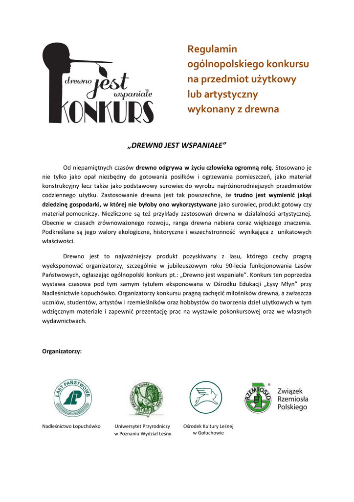 Regulamin ogólnopolskiego konkursu na przedmiot użytkowy lub artystyczny wykonany z drewna „DREWN0 JEST WSPANIAŁE” Od niepamiętnych czasów drewno odgrywa w życiu człowieka ogromną rolę. Stosowano je nie tylko jako opał niezbędny do gotowania posiłków i ogrzewania pomieszczeń, jako materiał konstrukcyjny lecz także jako podstawowy surowiec do wyrobu najróżnorodniejszych przedmiotów codziennego użytku. Zastosowanie drewna jest tak powszechne, że trudno jest wymienić jakąś dziedzinę gospodarki, w której nie byłoby ono wykorzystywane jako surowiec, produkt gotowy czy materiał pomocniczy. Niezliczone są też przykłady zastosowań drewna w działalności artystycznej. Obecnie w czasach zrównoważonego rozwoju, ranga drewna nabiera coraz większego znaczenia. Podkreślane są jego walory ekologiczne, historyczne i wszechstronność wynikająca z unikatowych właściwości. Drewno jest to najważniejszy produkt pozyskiwany z lasu, którego cechy pragną wyeksponować organizatorzy, szczególnie w jubileuszowym roku 90‐lecia funkcjonowania Lasów Państwowych, ogłaszając ogólnopolski konkurs pt.: „Drewno jest wspaniałe”. Konkurs ten poprzedza wystawa czasowa pod tym samym tytułem eksponowana w Ośrodku Edukacji „Łysy Młyn” przy Nadleśnictwie Łopuchówko. Organizatorzy konkursu pragną zachęcić miłośników drewna, a zwłaszcza uczniów, studentów, artystów i rzemieślników oraz hobbystów do tworzenia dzieł użytkowych w tym wdzięcznym materiale i zapewnić prezentację prac na wystawie pokonkursowej oraz we własnych wydawnictwach. Organizatorzy: Nadleśnictwo Łopuchówko Uniwersytet Przyrodniczy Ośrodek Kultury Leśnej w Gołuchowie w Poznaniu Wydział Leśny Patronat honorowy: Dyrektor Regionalnej Dyrekcji Lasów Państwowych w Poznaniu Patronat medialny: KONKURS: „DREWNO JEST WSPANIAŁE” Adresaci: do udziału w konkursie zapraszamy wszystkich miłośników drewna bez względu na wiek! Prace oceniane będą w następujących kategoriach: wyroby użytkowe wyroby artystyczne wyroby edukacyjne Warunki uczestnictwa: 1. Do konkursu można zgłaszać max. 3 prace. 2. Nadsyłane prace konkursowe muszą mieć charakter przedmiotów użytkowych lub artystycznych wykonanych z drewna lub materiałów pochodnych. 3. Technika dowolna np.: rzeźbione, klejone, zbijane, różne łączniki mechaniczne. 4. Format dzieła: Waga – do 50 kg Wymiary nieprzekraczające 1mx1mx1m 5. Praca winna mieć wypełnioną kompletnie „Kartę opisu przedmiotu”. 6. Prace mogą być przesłane przesyłką pocztową lub kurierską na koszt autora lub dostarczone osobiście. Termin nadsyłania prac: do 5 września 2014 roku. Prace należy nadsyłać na adres: Lasy Państwowe Nadleśnictwo Łopuchówko, Łopuchówko 1, 62‐095 Murowana Goślina z dopiskiem – konkurs: „DREWNO JEST WSPANIAŁE” Kryteria oceny prac: zgodność z tematem konkursu, pomysłowość ujęcia tematu, estetyka dzieła, nowatorskie podejście. Skład komisji konkursowej: ‐przedstawiciel Regionalnej Dyrekcji Lasów Państwowych w Poznaniu, ‐przedstawiciel Wydziału Leśnego Uniwersytetu Przyrodniczego w Poznaniu ‐ przedstawiciel Nadleśnictwa Łopuchówko, ‐ przedstawiciel Ośrodka Kultury Leśnej w Gołuchowie, ‐ Pani Grażyna Szymała‐Wołyńska ‐ artysta rzeźbiarz ‐ przedstawiciel Związku Rzemiosła Polskiego. Nagrody i dyplomy: Laureaci w poszczególnych kategoriach otrzymają nagrody rzeczowe (I, II, III miejsce), nagrody specjalne: dyrektora RDLP Poznań, Dziekana Wydziału Leśnego UP w Poznaniu, dyrektora OKL oraz wyróżnienia. Uroczyste rozdanie nagród rzeczowych i dyplomów odbędzie się 26 września 2014 roku w obiekcie edukacyjno‐ turystycznym Dziewicza Góra Warunki końcowe: 1) Zakończeniem konkursu będzie wystawa nadesłanych prac. 2) Organizatorzy zastrzegają sobie prawo wykonania zdjęć nadesłanych prac oraz zatrzymania ich opisu dla publikacji w swoich wydawnictwach; 3) Nadesłane prace po zakończeniu wystawy autorzy będą mogli odebrać na koszt własny lub przekazać decyzją pisemną na uzgodnionych warunkach wybranemu organizatorowi; 4) Nadesłane prace zostaną ubezpieczone. Fundatorzy nagród: Dyrektor Regionalnej Dyrekcji Lasów Państwowych w Poznaniu Nadleśnictwo Łopuchówko Ośrodek Kultury Leśnej w Gołuchowie
