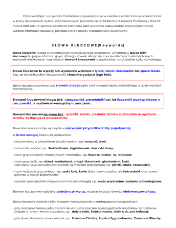 Odpowiadając na pytania Czytelników pojawiające się w związku z koniecznością umieszczania w pracy dyplomowej wykazu słów kluczowych (Zarządzenie nr 23 Rektora Akademii Podlaskiej z dnia 23 marca 2006 roku w sprawie określenia warunków jakim powinna odpowiadać praca dyplomowa), Oddział Informacji Naukowej przybliża istotę i zasady tworzenia słów kluczowych. S Ł O W A K L U C Z O W E (K e y w o r d s) Słowa kluczowe tworzą charakterystykę wyszukiwawczą dokumentu, wyrażoną w języku słów kluczowych - języku informacyjnym, którego słownik składa się z quasi-naturalnych elementarnych jednostek leksykalnych nazywanych słowami kluczowymi, a gramatyka ma charakter szyku dowolnego. Słowa kluczowe to wyrazy lub wyrażenia wybrane z tytułu, tekstu dokumentu lub spoza tekstu, (np. ze słownika słów kluczowych) charakteryzujące jego treść. Słowo kluczowe powinno być słowem znaczącym, czyli wyrazem języka naturalnego o dużej wartości znaczeniowej. Słowami kluczowymi mogą być : rzeczowniki, przymiotniki czy też liczebniki przekształcone w rzeczowniki, o możliwie równorzędnym znaczeniu. Słowami kluczowymi nie mogą być : spójniki, zaimki, przyimki, terminy o charakterze ogólnym, terminy występujące powszechnie. Słowa kluczowe podaje się zwykle w pierwszym przypadku liczby pojedynczej. W liczbie mnogiej zaleca się podawanie: - rzeczowników o charakterze pluralia tantum, np. nożyczki, drzwi; - nazw roślin, rodów, np. Radziwiłłowie, Jagiellonowie; storczyki; trawy; - nazw grup związków chemicznych i minerałów, np. tłuszcze, białka, iły, wapienie; - nazw grup osób, np. dzieci, kombatanci, chłopi, liberałowie, głuchoniemi, Żydzi, (ale nazwy grup zawodowych podaje się w liczbie pojedynczej, np. górnik, lekarz, nauczyciel); - nazw wyższych grup zwierząt, np. ssaki, koty, konie (jako nazwa rodziny, ale koń arabski jako nazwa gatunku w liczbie pojedynczej); - wyrażeń powszechnie stosowanych w liczbie mnogiej, np. wody przybrzeżne, badania archeologiczne. Słowem kluczowym może być pojedynczy wyraz, może je tworzyć również wielowyrazowa fraza. Słowa kluczowe złożone z kilku wyrazów wprowadza się w następujących przypadkach: - gdy znaczenie terminu jako całości nie jest sumą znaczeń poszczególnych składników, lecz stanowi związek o nowym innym znaczeniu, np. złoty środek, świnka morska, biały kruk, paź królowej; - gdy słowa stanowią nazwy własne, np. Bolesław Chrobry, Kaplica Zygmuntowska, Czerwone Wierchy; - gdy wyrazy składniowe zachowują swe podstawowe znaczenie, jednak stopień ich zespolenia jest znaczny, np. skok w dal, silnik spalinowy. Słowa kluczowe dokumentu podaje się zazwyczaj w porządku alfabetycznym lub rzeczowym (według wagi poruszanych problemów) tworząc wykaz słów kluczowych. P R Z Y K Ł A D Y - w przykładach zastosowano porządek alfabetyczny 1. Wpływ amoniaku na rozpuszczalność kwaśnych zanieczyszczeń gazowych w wodzie atmosferycznej. Słowa kluczowe : AMONIAK, CHEMIA ATMOSFERY, DWUTLENEK SIARKI, DWUTLENEK WĘGLA, KWAS AZOTOWY, KWAS SIARKOWY, RÓWNOWAGA GAZ-CIECZ 2. Internetowy serwis lingwistyczny. Słowa kluczowe : INFORMATYKA, JĘZYKOZNAWSTWO, PRZEKŁAD KOMPUTEROWY 3. Wybrane usługi telematyczne dla obszarów wiejskich. Słowa kluczowe : INFORMATYKA, INTERNET, TELEKOMUNIKACJA, TELEMATYKA, WIEŚ 4. Controlling jako instrument zarządzania w przedsiębiorstwie budowlanym. Słowa kluczowe : CONTROLLING, PRZEDSIĘBIORSTWO BUDOWLANE, ZARZĄDZANIE 5. Doskonalenie systemu jakości przez ISO 9000 Plus : analiza porównawcza wyników badań przeprowadzonych w Niemczech i w Polsce. Słowa kluczowe : CERTYFIKATY, ISO 9000 PLUS, JAKOŚĆ, ZARZĄDZANIE 6. Edukacja czytelnicza i medialna w szkole. Słowa kluczowe : CZYTANIE, CZYTELNICTWO, EDUKACJA CZYTELNICZA, EDUKACJA MEDIALNA, MEDIA, SZKOŁA, ŚRODKI MASOWEGO PRZEKAZU 7. Dziecko z zespołem ADHD w przedszkolu. Słowa kluczowe : ADHD, AKTYWNOŚĆ, DZIECKO NADPOBUDLIWE, NADPOBUDLIWOŚĆ PSYCHORUCHOWA, PRZEDSZKOLE, ZABURZENIA KONCENTRACJI UWAGI 8. System ochrony ludności RP wobec zagrożenia terroryzmem. Słowa kluczowe : OBRONA CYWILNA, TERRORYZM, ZARZĄDZANIE KRYZYSOWE 9. Bitwa pod Stoczkiem Łukowskim 1831 r. Słowa kluczowe : BITWA POD STOCZKIEM (1831), POWSTANIE LISTOPADOWE (1830-1831) 10. Wątki cierpienia w twórczości Jana Kasprowicza. Słowa kluczowe : CIERPIENIE, KASPROWICZ JAN. , LITERATURA POLSKA 11. Wpływ genotypu buhaja na wyniki oceny pokroju córek. Słowa kluczowe : BUHAJ, BYDŁO, GENOTYP 12. Rozwój agroturystyki na Ziemi Łukowskiej. Słowa kluczowe : AGROTURYSTYKA, ZIEMIA ŁUKOWSKA 13. Populacja bociana białego Ciciona ciciona na obszarze Podlaskiego Przełomu Bugu. Słowa kluczowe : BOCIAN BIAŁY, PODLASKI PRZEŁOM BUGU, POPULACJA, REZERWATY 14. Produkcja pszenicy jarej w zależności od nawożenia azotowego. Słowa kluczowe : NAWOŻENIE AZOTOWE, PSZENICA JARA, UPRAWA Tekst opracowano na podstawie: 1. Batorowska H., Czubała B. : Wybrane zagadnienia nauki o informacji i technologii informacyjnej. Kraków : Wydaw. Naukowe WSP, 1996, 202 s. ISBN 83-86841-30-3 2. Słownik encyklopedyczny informacji, języków i systemów informacyjno- wyszukiwawczych. Oprac. Bożenna Bojar. Warszawa : Wydaw. SBP, 2002. 363 s. ISBN 83-87629847
