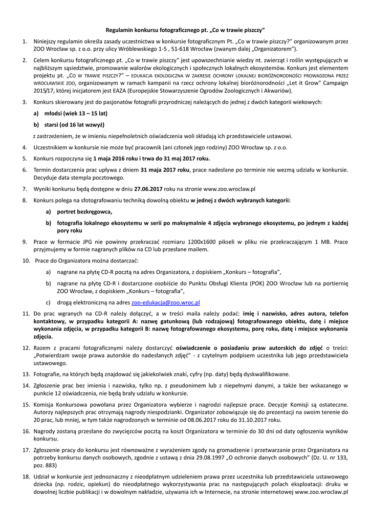 Regulamin konkursu fotograficznego pt. „Co w trawie piszczy” 1. Niniejszy regulamin określa zasady uczestnictwa w konkursie fotograficznym Pt. „Co w trawie piszczy?” organizowanym przez ZOO Wrocław sp. z o.o. przy ulicy Wróblewskiego 1-5 , 51-618 Wrocław (zwanym dalej „Organizatorem”). 2. Celem konkursu fotograficznego pt. „Co w trawie piszczy” jest upowszechnianie wiedzy nt. zwierząt i roślin występujących w najbliższym sąsiedztwie, promowanie walorów ekologicznych i społecznych lokalnych ekosystemów. Konkurs jest elementem projektu pt. „CO W TRAWIE PISZCZY?” – EDUKACJA EKOLOGICZNA W ZAKRESIE OCHRONY LOKALNEJ BIORÓŻNORODNOŚCI PROWADZONA PRZEZ WROCŁAWSKIE ZOO, organizowanym w ramach kampanii na rzecz ochrony lokalnej bioróżnorodności „Let it Grow" Campaign 2015/17, której inicjatorem jest EAZA (Europejskie Stowarzyszenie Ogrodów Zoologicznych i Akwariów). 3. Konkurs skierowany jest do pasjonatów fotografii przyrodniczej należących do jednej z dwóch kategorii wiekowych: a) młodsi (wiek 13 – 15 lat) b) starsi (od 16 lat wzwyż) z zastrzeżeniem, że w imieniu niepełnoletnich oświadczenia woli składają ich przedstawiciele ustawowi. 4. Uczestnikiem w konkursie nie może być pracownik (ani członek jego rodziny) ZOO Wrocław sp. z o.o. 5. Konkurs rozpoczyna się 1 maja 2016 roku i trwa do 31 maj 2017 roku. 6. Termin dostarczenia prac upływa z dniem 31 maja 2017 roku, prace nadesłane po terminie nie wezmą udziału w konkursie. Decyduje data stempla pocztowego. 7. Wyniki konkursu będą dostępne w dniu 27.06.2017 roku na stronie www.zoo.wroclaw.pl 8. Konkurs polega na sfotografowaniu techniką dowolną obiektu w jednej z dwóch wybranych kategorii: a) portret bezkręgowca, b) fotografia lokalnego ekosystemu w serii po maksymalnie 4 zdjęcia wybranego ekosystemu, po jednym z każdej pory roku 9. Prace w formacie JPG nie powinny przekraczać rozmiaru 1200x1600 pikseli w pliku nie przekraczającym 1 MB. Prace przyjmujemy w formie nagranych plików na CD lub przesłane mailem. 10. Prace do Organizatora można dostarczać: a) nagrane na płytę CD-R pocztą na adres Organizatora, z dopiskiem „Konkurs – fotografia”, b) nagrane na płytę CD-R i dostarczone osobiście do Punktu Obsługi Klienta (POK) ZOO Wrocław lub na portiernię ZOO Wrocław, z dopiskiem „Konkurs – fotografia”, c) drogą elektroniczną na adres [email protected] 11. Do prac wgranych na CD-R należy dołączyć, a w treści maila należy podać: imię i nazwisko, adres autora, telefon kontaktowy, w przypadku kategorii A: nazwę gatunkową (lub rodzajową) fotografowanego obiektu, datę i miejsce wykonania zdjęcia, w przypadku kategorii B: nazwę fotografowanego ekosystemu, porę roku, datę i miejsce wykonania zdjęcia. 12. Razem z pracami fotograficznymi należy dostarczyć oświadczenie o posiadaniu praw autorskich do zdjęć o treści: „Potwierdzam swoje prawa autorskie do nadesłanych zdjęć” - z czytelnym podpisem uczestnika lub jego przedstawiciela ustawowego. 13. Fotografie, na których będą znajdować się jakiekolwiek znaki, cyfry (np. daty) będą dyskwalifikowane. 14. Zgłoszenie prac bez imienia i nazwiska, tylko np. z pseudonimem lub z niepełnymi danymi, a także bez wskazanego w punkcie 12 oświadczenia, nie będą brały udziału w konkursie. 15. Komisja Konkursowa powołana przez Organizatora wybierze i nagrodzi najlepsze prace. Decyzje Komisji są ostateczne. Autorzy najlepszych prac otrzymają nagrody niespodzianki. Organizator zobowiązuje się do prezentacji na swoim terenie do 20 prac, lub mniej, w tym także nagrodzonych w terminie od 08.06.2017 roku do 31.10.2017 roku. 16. Nagrody zostaną przesłane do zwycięzców pocztą na koszt Organizatora w terminie do 30 dni od daty ogłoszenia wyników konkursu. 17. Zgłoszenie pracy do konkursu jest równoważne z wyrażeniem zgody na gromadzenie i przetwarzanie przez Organizatora na potrzeby konkursu danych osobowych, zgodnie z ustawą z dnia 29.08.1997 „O ochronie danych osobowych” (Dz. U. nr 133, poz. 883) 18. Udział w konkursie jest jednoznaczny z nieodpłatnym udzieleniem prawa przez uczestnika lub przedstawiciela ustawowego dziecka (np. rodzic, opiekun) do nieodpłatnego wykorzystywania prac na następujących polach eksploatacji: druku w dowolnej liczbie publikacji i w dowolnym nakładzie, używania ich w Internecie, na stronie internetowej www.zoo.wroclaw.pl oraz w innych formach utrwaleń, nadających się do rozpowszechniania w ramach działań Organizatora na terenie ZOO Wrocław sp. z o.o. oraz poza nim, bez ograniczeń czasowych i terytorialnych. 19. Nadesłane prace nie będą zwracane. Z chwilą ich nadesłania, prace przechodzą na własność Organizatora, który przejmuje autorskie prawa majątkowe do nadesłanych prac. 20. Organizator może wykluczyć uczestnika z konkursu w przypadku naruszenia przez uczestnika postanowień niniejszego regulaminu. 21. W przypadku, gdy okaże się, że zdobywcą nagrody jest osoba, która nie spełnia warunków wskazanych w pkt. 3 i 4 regulaminu, osoba ta traci prawa do nagrody, a w wypadku ujawnienia tego faktu po jej doręczeniu osoba ta będzie zobowiązana do jej zwrotu. 22. Organizator nie ponosi odpowiedzialności za podanie przez uczestnika niewłaściwych lub nieprawdziwych danych dotyczących adresu lub innych danych uniemożliwiających lub opóźniających wręczenie przez Organizatora nagród w związku z prowadzeniem konkursu. 23. Organizator nie ponosi odpowiedzialności za prawidłowość i terminowość doręczenia przez pocztę oraz firmy kurierskie przesyłek wysłanych w imieniu Organizatora w związku z prowadzeniem konkursu. 24. W przypadku, gdy z powodów określonych w pkt. 22 lub 23 nie będzie możliwe wręczenie nagrody, po odbiór nagrody uczestnik może zgłosić się osobiście do biura Organizatora w terminie 30 dni od daty rozstrzygnięcia konkursu. 25. W przypadku nieodebrania nagrody w terminie 