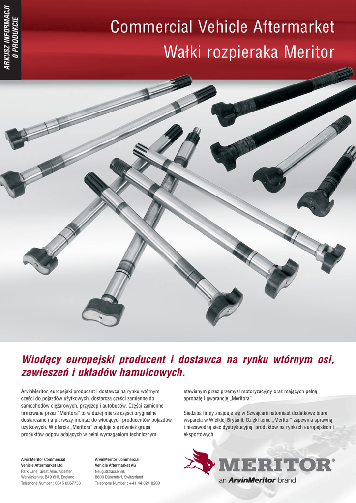 ARKUSZ INFORMACJI O PRODUKCIE Commercial Vehicle Aftermarket Wałki rozpieraka Meritor Wiodący europejski producent i dostawca na rynku wtórnym osi, zawieszeń i układów hamulcowych. ArvinMeritor, europejski producent i dostawca na rynku wtórnym części do pojazdów użytkowych, dostarcza części zamienne do samochodów ciężarowych, przyczep i autobusów. Części zamienne firmowane przez ”Meritora” to w dużej mierze części oryginalne dostarczane na pierwszy montaż do wiodących producentów pojazdów użytkowych. W ofercie „Meritora” znajduje się również grupa produktów odpowiadających w pełni wymaganiom technicznym ArvinMeritor Commercial Vehicle Aftermarket Ltd. Park Lane, Great Alne, Alcester Warwickshire, B49 6HT, England Telephone Number : 0845 6067733 ArvinMeritor Commercial Vehicle Aftermarket AG Neugutstrasse 89, 8600 Dübendorf, Switzerland Telephone Number : +41 44 824 8200 stawianym przez przemysł motoryzacyjny oraz mających pełną aprobatę i gwarancję „Meritora”. Siedziba firmy znajduje się w Szwajcarii natomiast dodatkowe biuro wsparcia w Wielkiej Brytanii. Dzięki temu „Meritor” zapewnia sprawną i niezawodną sieć dystrybucyjną produktów na rynkach europejskich i eksportowych. Meritor – “eksperci od hamulców” Nowa rodzina wałków rozpieraka o najwyższej jakości pochodzących od wiodącego europejskiego producenta i dostawcy na rynek wtórny osi, zawieszeń i układów hamulcowych. • Rodzina wałków rozpieraka najwyższej jakości produkowana wyłącznie dla Meritor i obejmująca wszystkie główne zastosowania dla naczep europejskich. • Produkowane w sposób zapewniający spełnienie norm wysokiej jakości i techniki firmy Meritor. Każdy wałek rozrządu jest produkowany z najwyższej jakości materiału i w pełni poddany obróbce maszynowej dla otrzymania: – Szlifowanych wykańczająco i hartowanych czopów w celu redukcji zużycia zapewnienia najlepszego pasowania łożysk. – Całkowicie obrabianych wałków dla zapewnienia pełnego wyważenia. – Całkowicie obrabianej i hartowanej główki w celu redukcji zużycia i zapewnienia idealnej współosiowości. • Trwałego oznakowania nazwą marki Meritor, logo i numerem części dla umożliwienia natychmiastowej identyfikacji części zarówno w samochodzie jak i poza samochodem. • Zawierający 35 numerów części dostępnych w magazynach, dalszych 350 części dostępnych jest na zamówienie, bezpiecznie zapakowanych w pudełkach, dla zapewnienia idealnego stanu podczas dostawy. • Przedstawione w szczegółowym katalogu zawierającym wyczerpującą listę odsyłającą do wszystkich głównych producentów i dostawców wałków rozpieraka (Numer referencyjny katalogu MPN1068). • Ceny konkurencyjne na rynku. “Meritor to znak jakości wśród pojazdów użytkowych - części i obsługa serwisowa godne zaufania” Prosimy odwiedzić naszą stronę Internetową, aby zapoznać się z publikacjami “Meritor”: http://www.arvinmeritor.com/products/aftermarket/cvaeurope.asp Distributed by: © Copyright 2007 ArvinMeritor All rights Reserved This publication may be used only to specify and sell products of ArvinMeritor, its subsidiaries and affiliated companies. Use to specify and sell any other products is a copyright violation. Issued: 07/2007 Publication: MPN1089PL