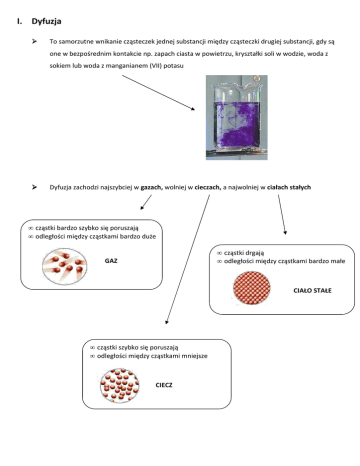 I. Dyfuzja To samorzutne wnikanie cząsteczek jednej substancji między cząsteczki drugiej substancji, gdy są one w bezpośrednim kontakcie np. zapach ciasta w powietrzu, kryształki soli w wodzie, woda z sokiem lub woda z manganianem (VII) potasu Dyfuzja zachodzi najszybciej w gazach, wolniej w cieczach, a najwolniej w ciałach stałych • cząstki bardzo szybko się poruszają • odległości między cząstkami bardzo duże • cząstki drgają • odległości między cząstkami bardzo małe GAZ CIAŁO STAŁE • cząstki szybko się poruszają • odległości między cząstkami mniejsze CIECZ II. Ziarnista budowa materii Materia, czyli wszystko, co nas otacza (gaz, ciecz, ciało stałe) zbudowana jest z maleńkich cząstek elementarnych, które są w ciągłym ruchu – dlatego mówimy o ziarnistej (nieciągłej) budowie materii. III. Masa atomowa i cząsteczkowa 1 u = 0,0,166 * 10-23 g Atom jest bardzo mały, trudno wyobrazić sobie jego rozmiar. 1 g = 6,02 * 1023 u Masy atomów podaje się w jednostce masy atomowej u (unit) Masy atomowe odczytuje się z układu okresowego pierwiastków chemicznych, masy atomowe podaje się w przybliżeniu mLi = 6,941 u = 7 u Masę cząsteczkową oblicza się, sumując masy atomowe atomów wchodzących w skład cząsteczki. m H 2 O = 2 o m H + 1 o mO = 2 o 1u + 1 o 16u = 2u + 16 u = 18u IV. Budowa atomu Atom pierwiastka chemicznego składa się z dwóch obszarów: jądra (w jądrze znajdują się dodatnio naładowane protony p+ i obojętne neutrony no) powłok elektronowych, po których krążą elektrony e- uproszczony model atomu węgla jądro elektron proton powłoka walencyjna neutron ostatnia powłoka elektronowa w atomie to powłoka walencyjna, a elektrony na niej krążące to elektrony walencyjne V. Właściwości podstawowych cząstek materii. Nazwa cząstki proton jądro atomowe neutron powłoki elektron elektronowa nukleony Symbol Przybliżona masa Ładunek p+ 1u 1u +1 no e- 1 u 1840 0 -1 VI. Liczba atomowa i cząsteczkowa liczba masowa = protony + neutrony liczba atomowa = protony = elektrony Ustal ilość elektronów protonów 11 11 neutrony liczbę atomową liczbę masową 12, bo 23-11 11 23 VII. Ilość elektronów na powłokach maksymalna liczba elektronów, która może znajdować się na danej powłoce 2e- 8e- 18e- 32e- jądro atomu K L M N O P Q N nazwy powłok elektronowych VIII. Izotopy Izotopy są to odmiany tego samego pierwiastka chemicznego o takiej samej liczbie atomowej Z, ale różnej liczbie masowej A np. w przyrodzie występują trzy izotopy wodoru (trzy odmiany). Zastosowanie izotopów: geologia – określenie wieku organizmów, skał źródło energii medycyna – wykrywanie i leczenie chorób IX. Budowa układu okresowego pierwiastków chemicznych grupy główne grupy główne 1 1 18 grupy 1 - 18 2 2 3 okresy 1 - 7 13 14 15 16 17 grupy poboczne 3 4 5 6 7 8 9 10 11 12 4 5 6 7 Nazwy grup wywodzą się od pierwszego pierwiastka w grupie grupa 1 wyjątek - litowce grupa 2 - berylowce grupa 3 - skandowce grupa 4 - tytanowce grupa 5 - wanadowce grupa 6 - chromowce grupa 7 - manganowce grupa 8 - żelazowce grupa 9 - kobaltowce grupa 10 - niklowce grupa 11 - miedziowce grupa 12 - cynkowce grupa 13 - borowce grupa 14 - węglowce grupa 15 - azotowce grupa 16 - tlenowce grupa 17 - fluorowce grupa 18 – helowce Prawo okresowości Właściwości pierwiastków chemicznych, uporządkowanych zgodnie ze zwiększająca się liczbą atomową Z powtarzają się okresowo. Dmitrij Mendelejew – 1869 twórca układu okresowego X. Co wynika z numeru grupy głównej i okresu? numer okresu glin – okresu 3 ilość powłok 3 powłoki K, L, M numer grupy głównej 1 i 2 magnez – grupa 2 ilość elektronów walencyjnych 2 e- walencyjne numer grupy głównej 13 – 18 (pomniejszony o 10) siarka – grupa 16 ilość elektronów walencyjnych 6 e- walencyjnych XI. Charakter chemiczny pierwiastków grup głównych