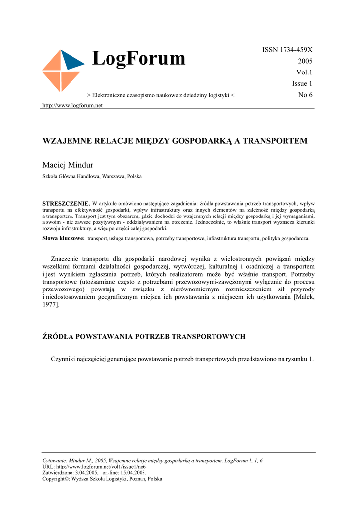 LogForum ISSN 1734-459X 2005 Vol.1 Issue 1 > Elektroniczne czasopismo naukowe z dziedziny logistyki < No 6 http://www.logforum.net WZAJEMNE RELACJE MIĘDZY GOSPODARKĄ A TRANSPORTEM Maciej Mindur Szkoła Główna Handlowa, Warszawa, Polska STRESZCZENIE. W artykule omówiono następujące zagadnienia: źródła powstawania potrzeb transportowych, wpływ transportu na efektywność gospodarki, wpływ infrastruktury oraz innych elementów na zależność między gospodarką a transportem. Transport jest tym obszarem, gdzie dochodzi do wzajemnych relacji między gospodarką i jej wymaganiami, a swoim - nie zawsze pozytywnym - oddziaływaniem na otoczenie. Jednocześnie, to właśnie transport wyznacza kierunki rozwoju infrastruktury, a więc po części całej gospodarki. Słowa kluczowe: transport, usługa transportowa, potrzeby transportowe, infrastruktura transportu, polityka gospodarcza. Znaczenie transportu dla gospodarki narodowej wynika z wielostronnych powiązań między wszelkimi formami działalności gospodarczej, wytwórczej, kulturalnej i osadniczej a transportem i jest wynikiem zgłaszania potrzeb, których realizatorem może być właśnie transport. Potrzeby transportowe (utożsamiane często z potrzebami przewozowymi-zawężonymi wyłącznie do procesu przewozowego) powstają w związku z nierównomiernym rozmieszczeniem sił przyrody i niedostosowaniem geograficznym miejsca ich powstawania z miejscem ich użytkowania [Małek, 1977]. ŹRÓDŁA POWSTAWANIA POTRZEB TRANSPORTOWYCH Czynniki najczęściej generujące powstawanie potrzeb transportowych przedstawiono na rysunku 1. Cytowanie: Mindur M., 2005, Wzajemne relacje między gospodarką a transportem. LogForum 1, 1, 6 URL: http://www.logforum.net/vol1/issue1/no6 Zatwierdzono: 3.04.2005, on-line: 15.04.2005. Copyright©: Wyższa Szkoła Logistyki, Poznan, Polska Mindur M., 2005. Wzajemne relacje między gospodarką a transportem. LogForum 1, 1, 6. URL: http://www.logforum.net/vol1/issue1/no6 Lokalizacja surowców naturalnych Kooperacja w produkcji Rozwój międzynarodowego podziału pracy Organizacja dystrybucji Rozmieszczenie rynków zbytu Rozmieszczenie: Różnice geograficzne Specjalizacja produkcji Inne korzyści skali Cele polityczne i militarne - bogactw naturalnych, Źródła potrzeb transportowych - produkcji materialnej, - działalności naukowej, Stosunki społeczne - działalności kulturalnej, Imprezy kulturalne - działalności rekreacyjnej, - ludności. Rozmieszczenie ludności Źródło: opracowanie własne na podstawie: Transport, PWN, Warszawa 2002, s. 38. Rys. 1. Źródła potrzeb transportowych Fig. 1. Sources of transportation needs Źródłem powstawania potrzeb mogą być również globalizacja procesów gospodarczych oraz integracja gospodarcza i polityczna, a także, w związku z technicznymi udogodnieniami, wzrastająca chęć do podróżowania itp. Według definicji klasycznej, potrzeba jest wynikiem braku jedności miejsca i czasu elementów niezbędnych dla działalności lub do osiągnięcia celu. Potrzebę można zdefiniować także jako "zgłoszoną przez gospodarkę narodową i społeczeństwo potencjalną, wyodrębnioną ofertę przemieszczania osób, ładunków i wiadomości w danym okresie na określoną odległość" [Rydzykowski, Wojewódzka-Król, 2002]. Dostępna literatura zawiera propozycje podziału potrzeb według różnorodnych kryteriów, a przykładowe kryteria przedstawiono na rysunku 2. 2 Mindur M., 2005. Wzajemne relacje między gospodarką a transportem. LogForum, 1, 1, 6. URL: http://www.logforum.net/vol1/issue1/no6 PP O O TT RR ZZ EE BB Y Y Przewozy pasażerskie Przewozy towarowe KRYTERIA CEL PODRÓŻY SIŁA ODDZIAŁYWANIA ŚRODKÓW KOMUNIKACJI DZIAŁ GOSPODARKI FAZA PROCESU PRODUKCYJNEGO PODATNOŚĆ PRZEWOZOWA Źródło: opracowanie własne na podstawie: Transport. PWN, Warszawa 2002, s. 38. Rys. 2. Kryteria podziału potrzeb przewozowych Fig. 2. Criteria of classification of transportation needs Potrzeby sklasyfikowane według podanych kryteriów charakteryzują się tym, że powstają one w obrębie układów osadniczych (przemieszczanie ludności wynikające z realizacji potrzeb bytowych, socjalnych, oświatowych itp.), w obrębie układów produkcji dóbr i usług (przewozy surowców, prefabrykatów itp.) oraz na styku tych układów (dostarczanie wytworzonych dóbr do finalnych odbiorców-konsumentów, ruchliwość komunikacyjna ludności związana z wykonywaniem zawodu). Ponieważ zgłaszane potrzeby są wynikiem organizacji życia społecznego oraz wynikają z procesów gospodarczych, oznacza to, że transport realizując potrzeby zgłaszane przez społeczeństwo i gospodarkę narodową, zapewnia osiągnięcie jedności miejsca i czasu przedmiotów oraz narzędzi pracy, pracowników, a także materiałów pomocniczych wykorzystywanych przez działy gospodarki narodowej przy tworzeniu produkcji globalnej [Madeyski, Lissowska, Marzec, 1975]. WPŁYW TRANSPORTU NA EFEKTYWNOŚĆ GOSPODARKI Jakość oferty transportu ma zasadniczy wpływ na funkcjonowanie gospodarki. Zależności te przedstawił Grzywacz [1982] (rys. 3). 3 Mindur M., 2005. Wzajemne relacje między gospodarką a transportem. LogForum 1, 1, 6. URL: http://www.logforum.net/vol1/issue1/no6 Ogólne nakłady na rozwój Nakłady na transport Transport z jego infrastrukturą Ogólna efektywność gospodarki narodowej Nakłady na pozostałe działy Pozostałe działy gospodarki narodowej Źródło: W. Grzywacz: Infrastruktura transportu. WKŁ, Warszawa 1982 , s. 52. Rys. 3. Efektywność gospodarki narodowej i jej zależności Fig. 3. Effectiveness of national economy and its relationships Schemat przedstawiony na rysunku 3 wskazuje na dwa podstawowe elementy charakteryzujące wzajemne relacje między transportem a gospodarką. Po pierwsze, rozwój transportu, mający wpływ na ogólną efektywność gospodarki narodowej, jest jednym ze wskaźników wzrostu gospodarczego. Oznacza to także, że niewłaściwy rozw