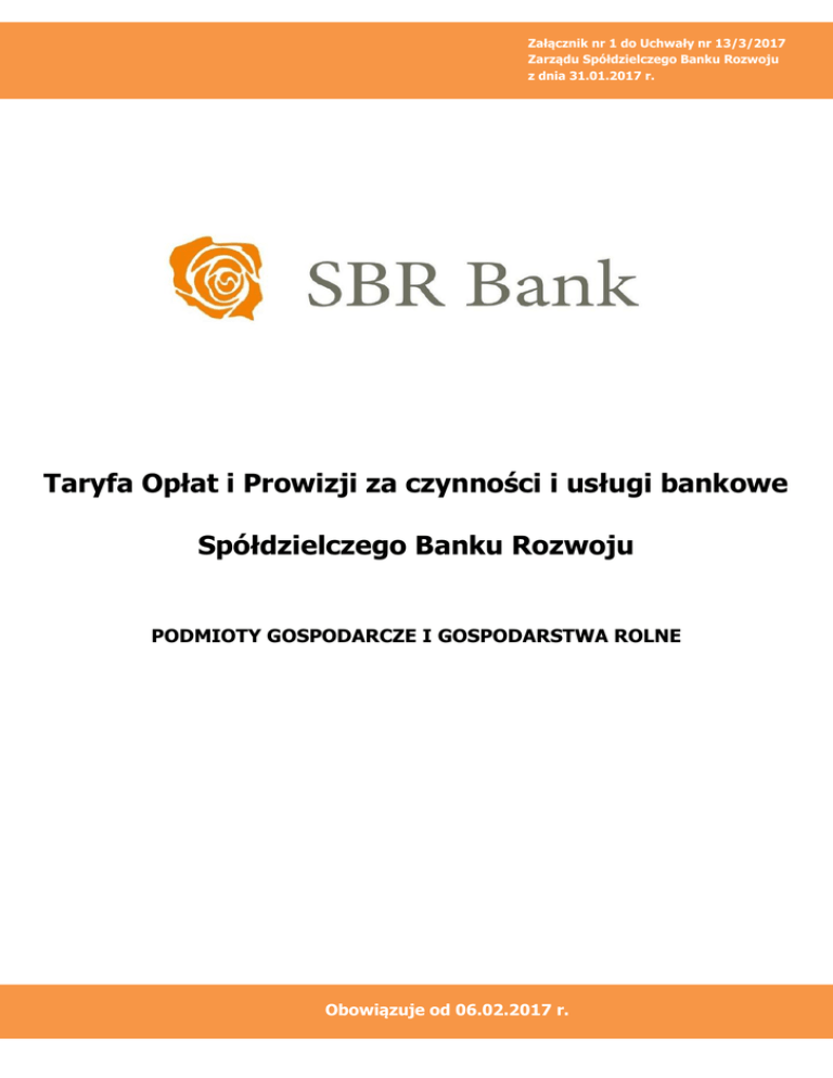 Załącznik nr 1 do Uchwały nr 13/3/2017 Zarządu Spółdzielczego Banku Rozwoju z dnia 31.01.2017 r. Taryfa Opłat i Prowizji za czynności i usługi bankowe Spółdzielczego Banku Rozwoju PODMIOTY GOSPODARCZE I GOSPODARSTWA ROLNE Obowiązuje od 06.02.2017 r. Taryfa Opłat i Prowizji za czynności i usługi bankowe ZASADY POBIERANIA OPŁAT I PROWIZJI BANKOWYCH: §1 „Taryfa opłat i prowizji za czynności i usługi bankowe Spółdzielczego Banku Rozwoju” zwana dalej Taryfą określa stawki opłat i prowizji bankowych pobieranych przez Spółdzielczy Bank Rozwoju, zwany dalej Bankiem od: 1) Podmiotów Gospodarczych 2) Gospodarstwa Rolnych §2 1. 1) 2) 3) 2. 1) 2) Opłaty i prowizje pobierane są: po wykonaniu usługi lub na koniec dnia, w którym Klient złożył dyspozycję wykonania usługi; miesięcznie lub w innych okresach rozliczeniowych; zgodnie z zawartą umową. W przypadku Klientów będących Posiadaczami rachunku Bank obciąża rachunek Posiadacza kwotą: opłat pobieranych miesięcznie – w terminie określonym dla danego rachunku pozostałych prowizji i opłat za czynności związane z realizacją umowy rachunku – w dniu realizacji wniosku lub dyspozycji złożonego/złożonej przez Posiadacza, z zastrzeżeniem ust. 3. 3. W przypadku braku na rachunku środków pieniężnych, Bank obciąża rachunek należnościami z tytułu prowizji i opłat, o których w dniu wpływu na rachunek środków pieniężnych lub prowizja może być wpłacona w gotówce w kasie Banku. 4. Od pozostałych Klientów opłaty i prowizje pobierane są w gotówce w kasach Banku w dniu dokonania operacji bankowej. 5. Wszelkie opłaty i prowizje bankowe pokrywa zleceniodawca operacji chyba, że zawarte umowy stanowią inaczej. §3 1. Prowizje i opłaty ustalane są i pobierane w złotych lub w walutach obcych. 2. Kwoty pobieranych prowizji i opłat podlegają zaokrągleniu do jednego grosza na zasadach ogólnych. Dotyczy to również kwot prowizji i opłat pobieranych w złotych od operacji dokonywanych w obrocie dewizowym. Kwoty pobierane w walucie obcej są zaokrąglane wg analogicznych zasad. 3. W przypadku, gdy Taryfa określa wysokość prowizji i opłat w granicach „od”, „do” oraz „od …do…” ustala się indywidualnie wysokość pobieranych opłat i prowizji w podanych granicach. §4 1. Opłaty i prowizje od czynności bankowych w obrocie dewizowym ustalane są w walucie polskiej. W sytuacji, gdy podstawę naliczania prowizji określonej procentowo stanowi kwota w walucie obcej, opłata/prowizja ustalona w PLN pobierana jest od klienta w walucie obcej, do przeliczania stosowany jest kurs średni NBP z dnia pobrania należności. 2. Za operacje dewizowe pobiera się dodatkowo opłaty i prowizje podane przez banki pośredniczące i inne podmioty finansowe przy wykonaniu zlecenia oraz poniesione koszty kurierskie i telekomunikacyjne w zależności od wybranej w przekazie opcji kosztowej. §5 1. Nie pobiera się prowizji/opłat za: 1) prowadzenie rachunku Klienta prowadzącego działalność gospodarczą/rolną za bieżący miesiąc w przypadku rachunku otwartego w drugiej jego połowie 2) wpłaty na poczet spłat odsetek i kredytów oraz innych zobowiązań zaciągniętych w SBR Bank, wpłat na cele społeczno - użyteczne na rzecz organizacji i fundacji, oraz których wniesienie upoważnia ofiarodawcę na mocy przepisów szczególnych do uzyskania ulgi w podatku dochodowym, na cele dobroczynne i charytatywne, 3) komitetów społecznych powoływanych przez lokalną społeczność do realizacji celów gospodarczych i społecznych, 4) wpłat na rachunki bankowe w przypadku, gdy z umowy zawartej z posiadaczem rachunku wynika, że opłatę uiszcza odbiorca należności. 5) za poszukiwanie rachunków bankowych i udzielanie pisemnej informacji o obrotach i stanach rachunków, gdy poszukiwanie dokonywane jest na żądanie osób, o których mowa w art. 110 Prawa bankowego. §6 1. Za usługi nietypowe i nie przewidziane w Taryfie dyrektor oddziału/członek zarządu SBR Bank może ustalić opłatę wg rzeczywistych kosztów lub według umowy z klientem, bądź wyrazić zgodę na odstąpienie od jej pobrania, o ile jest to racjonalnie uzasadnione i nie jest sprzeczne z interesem SBR Bank. 2. Taryfa nie jest równoznaczna z ofertą Banku. Istnienie określonej pozycji w Taryfie nie zobowiązuje Banku do sprzedaży produktu/usługi, której dotyczy. 3. Powyższa regulacja ma charakter ogólny obowiązujący wszystkich Klientów. Odmienne postanowienia mogą wynikać z umów zawieranych z Bankiem. 2 Taryfa Opłat i Prowizji za czynności i usługi bankowe A. PODMIOTY GOSPODARCZE I. RACHUNKI I. a. Rachunki rozliczeniowe bieżące i pomocnicze w złotych Opłata / prowizja Lp. 1. 2. Rodzaj czynności / usługi Otwarcie rachunku Prowadzenie rachunku - prowizja pobierana miesięcznie ostatniego dnia roboczego każdego miesiąca Non-profit Biznes Konto Start Biznes Konto* Biznes Konto 0 zł 15 zł 0 zł 0 zł 12 zł 0 zł (Stowarzyszenia, Fundacje itp.) 3. Wpłaty gotówkowe na rachunek – od kwoty wpłaty 0,1% min. 5 zł 0,1% min. 5 zł 0 zł 4. Wypłaty gotówkowe z rachunku – od kwoty wypłaty 0,5% min. 5 zł 0,5% min. 5 zł 0 zł 5. Przelewy 5.1 Przelewy realizowane o Oddziale Banku – za każdy przelew: 5.1.1 na rachunki prowadzone w SBR Bank (nie dotyczy przelewów pomiędzy rachunkami własnymi) 2 zł 2 zł 2 zł 5.1.2 na rachunki do innych banków krajowych 4 zł 4 zł 4 4 zł 4 zł 4 10 zł 10 zł 10 5.2 na rachunki do innych banków krajowych od podmiotów świadczących sezonową działalność gospodarczą z rachunku bieżącego przedsiębiorcy na ROR lub rachunek bieżący rolnika tej samej osoby Przelewy w formie elektronicznej (Home banking) – za każdy przelew: 5.2.1 na rachunki prowadzone w SBR Bank 0 zł 0 zł 0 zł 5.2.2 na rachunki do innych banków krajowych 2 zł 2 zł 2 zł 5.3 Przelewy w formie elektronicznej (Internet banking) - za każdy przelew: 5.3.1 na rachunki pr