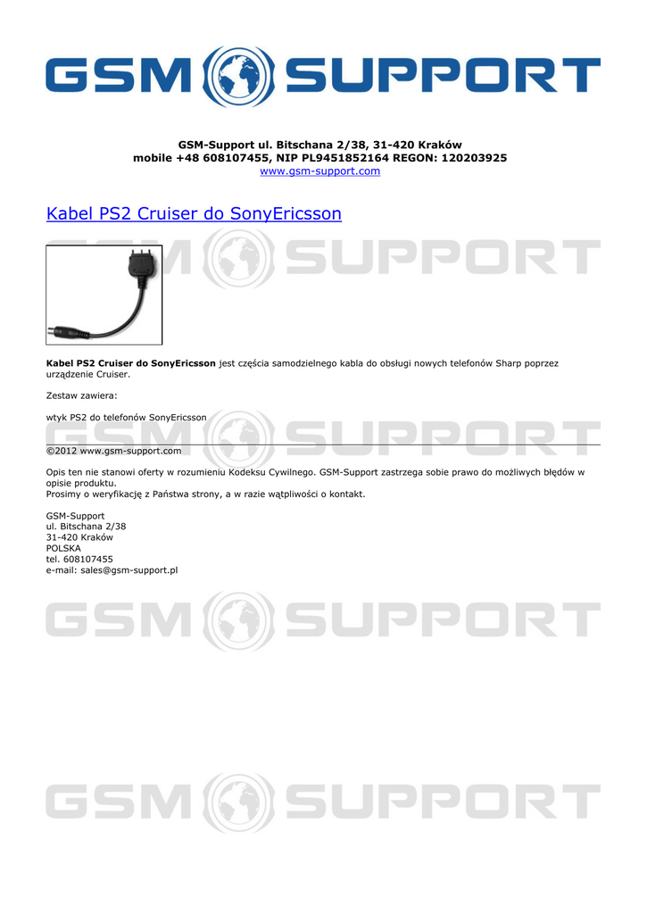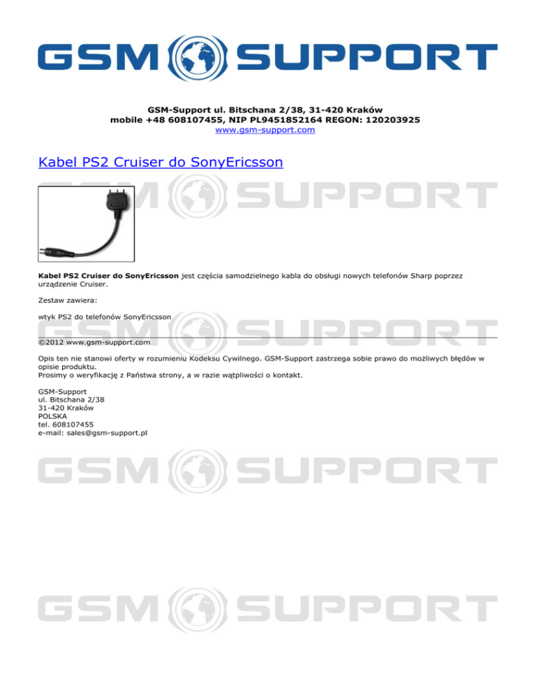 GSM-Support ul. Bitschana 2/38, 31-420 Kraków mobile +48 608107455, NIP PL9451852164 REGON: 120203925 www.gsm-support.com Kabel PS2 Cruiser do SonyEricsson Kabel PS2 Cruiser do SonyEricsson jest częścia samodzielnego kabla do obsługi nowych telefonów Sharp poprzez urządzenie Cruiser. Zestaw zawiera: wtyk PS2 do telefonów SonyEricsson ©2012 www.gsm-support.com Opis ten nie stanowi oferty w rozumieniu Kodeksu Cywilnego. GSM-Support zastrzega sobie prawo do możliwych błędów w opisie produktu. Prosimy o weryfikację z Państwa strony, a w razie wątpliwości o kontakt. GSM-Support ul. Bitschana 2/38 31-420 Kraków POLSKA tel. 608107455 e-mail: [email protected] Powered by TCPDF (www.tcpdf.org)