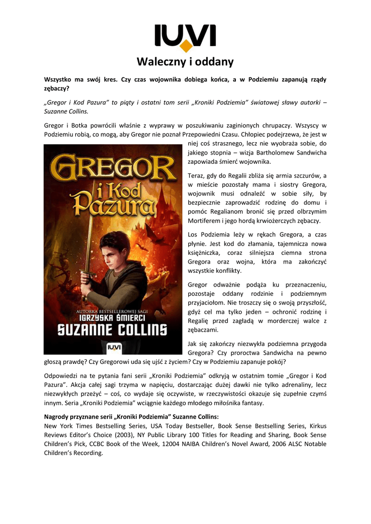 Waleczny i oddany Wszystko ma swój kres. Czy czas wojownika dobiega końca, a w Podziemiu zapanują rządy zębaczy? „Gregor i Kod Pazura” to piąty i ostatni tom serii „Kroniki Podziemia” światowej sławy autorki – Suzanne Collins. Gregor i Botka powrócili właśnie z wyprawy w poszukiwaniu zaginionych chrupaczy. Wszyscy w Podziemiu robią, co mogą, aby Gregor nie poznał Przepowiedni Czasu. Chłopiec podejrzewa, że jest w niej coś strasznego, lecz nie wyobraża sobie, do jakiego stopnia – wizja Bartholomew Sandwicha zapowiada śmierć wojownika. Teraz, gdy do Regalii zbliża się armia szczurów, a w mieście pozostały mama i siostry Gregora, wojownik musi odnaleźć w sobie siły, by bezpiecznie zaprowadzić rodzinę do domu i pomóc Regalianom bronić się przed olbrzymim Mortiferem i jego hordą krwiożerczych zębaczy. Los Podziemia leży w rękach Gregora, a czas płynie. Jest kod do złamania, tajemnicza nowa księżniczka, coraz silniejsza ciemna strona Gregora oraz wojna, która ma zakończyć wszystkie konflikty. Gregor odważnie podąża ku przeznaczeniu, pozostaje oddany rodzinie i podziemnym przyjaciołom. Nie troszczy się o swoją przyszłość, gdyż cel ma tylko jeden – ochronić rodzinę i Regalię przed zagładą w morderczej walce z zębaczami. Jak się zakończy niezwykła podziemna przygoda Gregora? Czy proroctwa Sandwicha na pewno głoszą prawdę? Czy Gregorowi uda się ujść z życiem? Czy w Podziemiu zapanuje pokój? Odpowiedzi na te pytania fani serii „Kroniki Podziemia” odkryją w ostatnim tomie „Gregor i Kod Pazura”. Akcja całej sagi trzyma w napięciu, dostarczając dużej dawki nie tylko adrenaliny, lecz niezwykłych przeżyć – coś, co wydaje się oczywiste, w rzeczywistości okazuje się zupełnie czymś innym. Seria „Kroniki Podziemia” wciągnie każdego młodego miłośnika fantasy. Nagrody przyznane serii „Kroniki Podziemia” Suzanne Collins: New York Times Bestselling Series, USA Today Bestseller, Book Sense Bestselling Series, Kirkus Reviews Editor’s Choice (2003), NY Public Library 100 Titles for Reading and Sharing, Book Sense Children’s Pick, CCBC Book of the Week, 12004 NAIBA Children’s Novel Award, 2006 ALSC Notable Children’s Recording. Dane wydawnicze: Wydawnictwo IUVI | Format: 135 x 205 mm | s. 440 | Seria: „Kroniki Podziemia” | Cena: 34,90 zł ISBN 978-83-7966-024-7| Data premiery: 28.09.2016| Wiek 9+ Więcej o serii „Kroniki Podziemia” na: www.kronikipodziemia.pl Strona internetowa Wydawnictwa IUVI: www.iuvi.pl Patroni medialni: Wydawnictwo IUVI jest patronem konkursu Świat Przyjazny Dziecku organizowanego przez Komitet Ochrony Praw Dziecka.