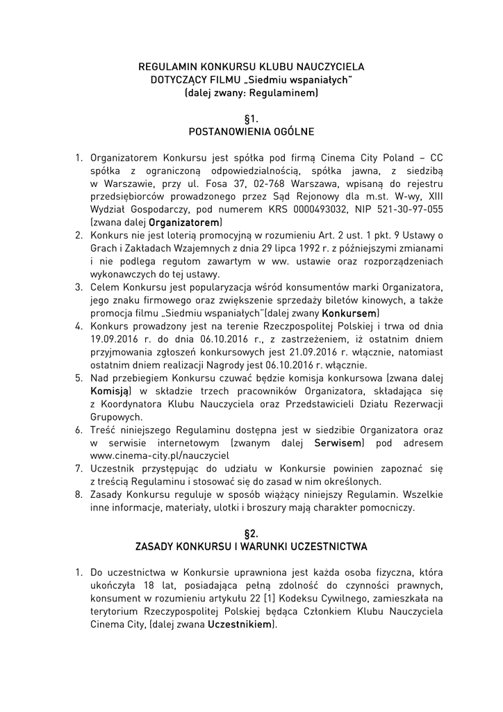 REGULAMIN KONKURSU KLUBU NAUCZYCIELA DOTYCZĄCY DO TYCZĄCY FILMU „Siedmiu „Siedmiu wspaniałych” wspaniałych” (dalej zwany: Regulaminem) §1. POSTANOWIENIA OGÓLNE 1. Organizatorem Konkursu jest spółka pod firmą Cinema City Poland – CC spółka z ograniczoną odpowiedzialnością, spółka jawna, z siedzibą w Warszawie, przy ul. Fosa 37, 02-768 Warszawa, wpisaną do rejestru przedsiębiorców prowadzonego przez Sąd Rejonowy dla m.st. W-wy, XIII Wydział Gospodarczy, pod numerem KRS 0000493032, NIP 521-30-97-055 (zwana dalej Organizatorem) Organizatorem 2. Konkurs nie jest loterią promocyjną w rozumieniu Art. 2 ust. 1 pkt. 9 Ustawy o Grach i Zakładach Wzajemnych z dnia 29 lipca 1992 r. z późniejszymi zmianami i nie podlega regułom zawartym w ww. ustawie oraz rozporządzeniach wykonawczych do tej ustawy. 3. Celem Konkursu jest popularyzacja wśród konsumentów marki Organizatora, jego znaku firmowego oraz zwiększenie sprzedaży biletów kinowych, a także promocja filmu „Siedmiu wspaniałych”(dalej zwany Konkursem) Konkursem 4. Konkurs prowadzony jest na terenie Rzeczpospolitej Polskiej i trwa od dnia 19.09.2016 r. do dnia 06.10.2016 r., z zastrzeżeniem, iż ostatnim dniem przyjmowania zgłoszeń konkursowych jest 21.09.2016 r. włącznie, natomiast ostatnim dniem realizacji Nagrody jest 06.10.2016 r. włącznie. 5. Nad przebiegiem Konkursu czuwać będzie komisja konkursowa (zwana dalej Komisją) Komisją w składzie trzech pracowników Organizatora, składająca się z Koordynatora Klubu Nauczyciela oraz Przedstawicieli Działu Rezerwacji Grupowych. 6. Treść niniejszego Regulaminu dostępna jest w siedzibie Organizatora oraz w serwisie internetowym (zwanym dalej Serwisem) Serwisem pod adresem www.cinema-city.pl/nauczyciel 7. Uczestnik przystępując do udziału w Konkursie powinien zapoznać się z treścią Regulaminu i stosować się do zasad w nim określonych. 8. Zasady Konkursu reguluje w sposób wiążący niniejszy Regulamin. Wszelkie inne informacje, materiały, ulotki i broszury mają charakter pomocniczy. §2. ZASADY KONKURSU I WARUNKI UCZESTNICTWA 1. Do uczestnictwa w Konkursie uprawniona jest każda osoba fizyczna, która ukończyła 18 lat, posiadająca pełną zdolność do czynności prawnych, konsument w rozumieniu artykułu 22 [1] Kodeksu Cywilnego, zamieszkała na terytorium Rzeczypospolitej Polskiej będąca Członkiem Klubu Nauczyciela Cinema City, (dalej zwana Uczestnikiem). Uczestnikiem 2. Z możliwości uczestniczenia w Konkursie wykluczeni są pracownicy i członkowie organów Spółki Cinema City Poland - CC Sp. z o.o. Spółka jawna z siedzibą w Warszawie przy ul. Fosa 37, 00-678 Warszawa, Spółki ALL JOB POLAND CC SP Z O. O. Spółka Komandytowo Akcyjna, z siedzibą w Warszawie, ul. Wołoska 12, 02-675 Warszawa oraz członkowie ich najbliższej rodziny. Przez „członków najbliższej rodziny” należy rozumieć wstępnych, zstępnych, rodzeństwo, małżonka oraz osoby pozostające w stosunku przysposobienia. Przez „pracowników” rozumie się także osoby wykonujące usługi na rzecz ww. podmiotów na podstawie umów cywilnoprawnych. 3. Organizator ma prawo opublikowania w Serwisie i w mediach danych Uczestników w dowolnym momencie Konkursu i po jego zakończeniu. §3. ORGANIZACJA KONKURSU 1. Aby wziąć udział w Konkursie Uczestnik powinien: 1.1. W terminie od 19.09.2016 r. do 21.09.2016 r. do godziny 23.59 wysłać na adres e-mail: [email protected] odpowiedź na pytanie konkursowe: Twój kultowy western. western. Uzasadnij swój wybór w kilku zdaniach., zdaniach., (dalej zwaną Odpowiedzią konkursową). konkursową 1.2. W tytule bądź w treści maila, o którym mowa w ppkt. 1.1.1 należy wpisać hasło „Siedmiu wspaniałych” oraz nazwę jednego z 20 miast, w których znajduje się kino Cinema City (dalej zwane Kinem), Kinem w którym będzie zrealizowana Nagroda. 1.3. Odpowiedź na pytanie konkursowe nie powinno przekroczyć ilości 1500 znaków łącznie ze spacjami. 1.4. Pod uwagę będą brane tylko te Odpowiedzi konkursowe, które spełniają wymogi określone w Regulaminie, zostaną zgłoszone we wskazanym terminie oraz na wskazany w punkcie 1.1.1 adres mailowy. 1.5. Lista miast, o których mowa w pkt. 1.1.2: Warszawa Łódź Lublin Kraków Katowice Gliwice Sosnowiec Rybnik Poznań Częstochowa Ruda Śląska Gdańsk Toruń Wrocław Bydgoszcz Zielona Góra Bielsko-Biała Bytom Wałbrzych Starogard Gdański 2. Uczestnik może dokonać tylko jednego zgłoszenia w Konkursie, które jest równe szansie na jedną Nagrodę przewidzianą w Konkursie. §4. ZASADY PRZYZNAWANIA NAGRÓD 1. Zwycięzcami konkursu zostaną autorzy 20 najciekawszych odpowiedzi. Nagrodę otrzyma jedna osoba w każdym z 20 miast, której odpowiedź zostanie wybrana przez komisję składającą się z Koordynatora Klubu Nauczyciela oraz Przedstawicieli Działu Rezerwacji Grupowych. 2. Do celów Konkursu Organizator ufundował 20 podwójnych zaproszeń (jedno podwójne zaproszenie w każdym z 20 miast, których lista znajduje się w §3 ppkt.1.1.5, dalej zwana Nagrodą) Nagrodą na repertuarowe seanse filmu „Siedmiu wspaniałych” w Kinach Cinema City. Repertuar znajduje się na stronie www.cinema-city.pl. Termin realizacji Nagrody: od 26.09.2016 r. do dnia 06.10.2016 r. włącznie, zaproszenia mogą być zrealizowane podczas seansów kinowych realizowanych od poniedziałku do czwartku. 3. Lista zwycięzców zostanie ogłoszona do dnia 23.09.2016 r. włącznie. Uczestnicy, którzy zwyciężyli zgodnie z § 4 ust. 1 Regulaminu zwani są dalej Laureatami. 4. Nagrody nie podlegają wymianie na ekwiwalent pieniężny, ani żadną inną formę gratyfikacji. Laureaci nie mają prawa zastrzeżenia szczególnych właściwości Nagród. 5. Uczestnik nie może przenieść prawa do Nagród na osobę trzecią. 6. O dalszym przeznaczeniu nagród nieprzyznanych i / lub nieodebranych decyduje Organizator. 7. Organizator może ufundować dodatkowe nagro