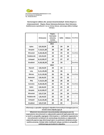SITA PŁOCKA GOSPODARKA KOMUNALNA SP. Z O.O. Ul. Przemysłowa 31, 09-400 Płock TEL. +48 (24) 262 48 53 Harmonogram odbioru dla posesji niezamieszkałych Gmina Słupno w miejscowościach: Słupno, Nowe Gulczewo,Gulczewo, Stare Gulczewo. Zadeklarowana częstotliwość 1 raz na miesiąc dotyczy pierwszego odbioru każdego miesiąca. Zmieszane Papier, tworzywa sztuczne, metale, opakowania 2013 Szkło Zielone Dezynfekcja Lipiec 3,9,10,24 24 24 24 - Sierpień 7,13,21,28 28 28 28 - Wrzesień 4,10,18,25 25 25 25 Dezynfekcja Październik 2,9,15,23 23 23 23 - Listopad 6,12,20,27 27 27 27 - Grudzień 4,10,18,24 24 24 - Dezynfekcja 2014 Styczeń 2,8,14,22 22 22 - - Luty 5,11,19,26 26 26 - - Marzec 5,11,19,26 26 26 26 Dezynfekcja Kwiecień 2,8,16,23 23 23 23 - Maj 7,13,21,28 28 28 28 - Czerwiec 4,10,18,25 25 25 25 Dezynfekcja Lipiec 2,8,16,23 23 23 23 - Sierpień 6,12,20,27 27 27 27 - Wrzesień 3,9,17,24 24 24 24 Dezynfekcja Październik 1,8,14,22 22 22 22 - Listopad 5,12,19,26 26 26 26 - Grudzień 3,9,17,24 24 24 - Dezynfekcja Informacja o sposobie segregacji odpadów komunalnych dostępna jest na stronie www.odpady.zgrp.pl Właściciel nieruchomości niezamieszkałej zobowiązany jest do wyposażenia nieruchomości w odpowiedni pojemnik bądź pojemniki oraz w worki w przypadku segregacji. Informujemy o możliwości wyposażenia nieruchomości na których nie zamieszkują mieszkańcy w odpowiedni pojemnik poprzez jego dzierżawę/najem na podstawie odrębnej umowy cywilno-prawnej. Istnieje także możliwość zakupu worków w przypadku selektywnego gromadzenia odpadów. SITA PŁOCKA GOSPODARKA KOMUNALNA SP. Z O.O. Ul. Przemysłowa 31, 09-400 Płock TEL. +48 (24) 262 48 53 Harmonogram odbioru dla posesji niezamieszkałych Gmina Słupno w miejscowościach: Borowiczki Pieńki, Cekanowo, Liszyno,Mijakowo, Mirosław, Miszewko Strzałkowskie, Ramutowo, Szeligi, Święcieniec, Wykowo. Zadeklarowana częstotliwość 1 raz na miesiąc dotyczy pierwszego odbioru każdego miesiąca. Zmieszane Papier, tworzywa sztuczne, metale, opakowania 2013 Szkło Zielone Dezynfekcja Lipiec 3,10,17,25 25 25 25 - Sierpień 7,14,22,28 22 22 22 - Wrzesień 4,11,18,26 26 26 26 Dezynfekcja Październik 2,9,16,24 24 24 24 - Listopad 6,13,20,28 28 28 28 - Grudzień 4,11,18,27 27 27 - Dezynfekcja 2014 Styczeń 2,8,15,23 23 23 - - Luty 5,12,19,27 27 27 - - Marzec 5,12,19,27 27 27 27 Dezynfekcja Kwiecień 2,9,16,24 24 24 24 - Maj 7,14,22,28 22 22 22 - Czerwiec 4,11,18,26 26 26 26 Dezynfekcja Lipiec 2,9,16,24 24 24 24 - Sierpień 6,13,20,28 28 28 28 - Wrzesień 3,10,17,25 25 25 25 Dezynfekcja Październik 1,8,15,23 23 23 23 - Listopad 5,12,19,27 27 27 27 - Grudzień 3,10,17,24 24 24 - Dezynfekcja Informacja o sposobie segregacji odpadów komunalnych dostępna jest na stronie www.odpady.zgrp.pl Właściciel nieruchomości niezamieszkałej zobowiązany jest do wyposażenia nieruchomości w odpowiedni pojemnik bądź pojemniki oraz w worki w przypadku segregacji. Informujemy o możliwości wyposażenia nieruchomości na których nie zamieszkują mieszkańcy w odpowiedni pojemnik poprzez jego dzierżawę/najem na podstawie odrębnej umowy cywilno-prawnej. Istnieje także możliwość zakupu worków w przypadku selektywnego gromadzenia odpadów.