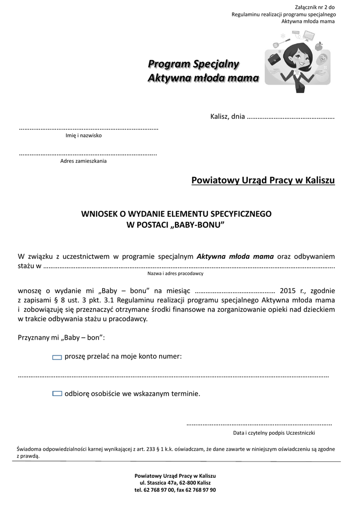 Załącznik nr 2 do Regulaminu realizacji programu specjalnego Aktywna młoda mama Program Specjalny Aktywna młoda mama Kalisz, dnia …………………………………………. …………………………………………………………………… Imię i nazwisko ………………………………………………………………….. Adres zamieszkania Powiatowy Urząd Pracy w Kaliszu WNIOSEK O WYDANIE ELEMENTU SPECYFICZNEGO W POSTACI „BABY-BONU” W związku z uczestnictwem w programie specjalnym Aktywna młoda mama oraz odbywaniem stażu w ………………………………………………………………………………………………………………………………………………. Nazwa i adres pracodawcy wnoszę o wydanie mi „Baby – bonu” na miesiąc ……………………………………… 2015 r., zgodnie z zapisami § 8 ust. 3 pkt. 3.1 Regulaminu realizacji programu specjalnego Aktywna młoda mama i zobowiązuję się przeznaczyć otrzymane środki finansowe na zorganizowanie opieki nad dzieckiem w trakcie odbywania stażu u pracodawcy. Przyznany mi „Baby – bon”: proszę przelać na moje konto numer: ………………………………………………………………………………………………………………………………………………………… odbiorę osobiście we wskazanym terminie. ……………….…………………………….……………….……… Data i czytelny podpis Uczestniczki Świadoma odpowiedzialności karnej wynikającej z art. 233 § 1 k.k. oświadczam, że dane zawarte w niniejszym oświadczeniu są zgodne z prawdą. Powiatowy Urząd Pracy w Kaliszu ul. Staszica 47a, 62-800 Kalisz tel. 62 768 97 00, fax 62 768 97 90