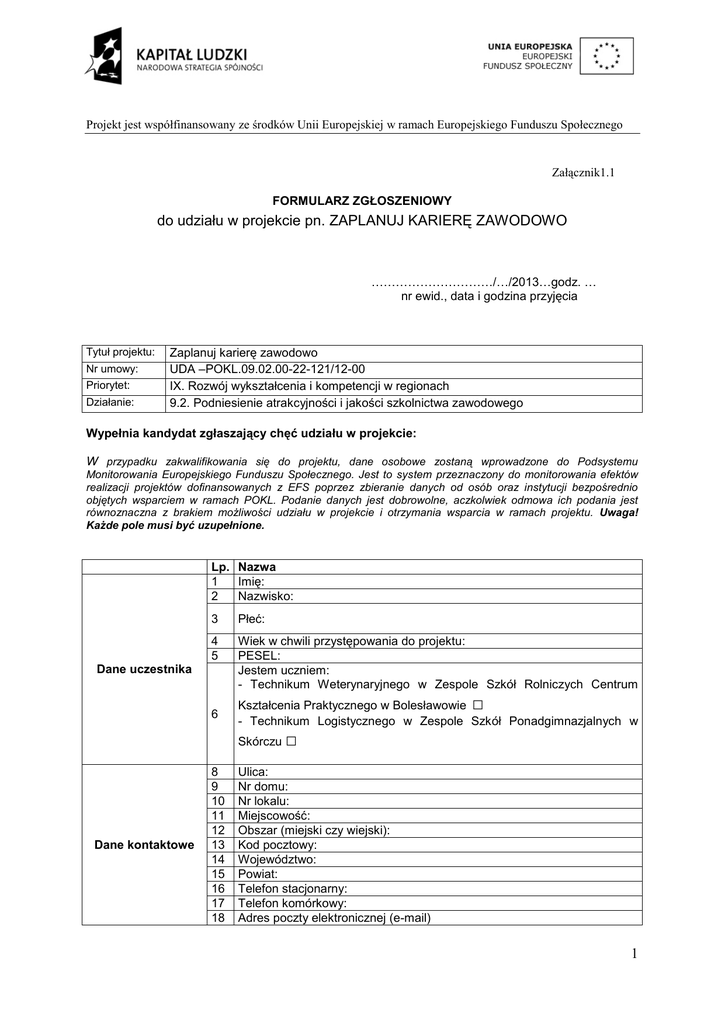 Projekt jest współfinansowany ze środków Unii Europejskiej w ramach Europejskiego Funduszu Społecznego Załącznik1.1 FORMULARZ ZGŁOSZENIOWY do udziału w projekcie pn. ZAPLANUJ KARIERĘ ZAWODOWO …………………………/…/2013…godz. … nr ewid., data i godzina przyjęcia Tytuł projektu: Nr umowy: Priorytet: Działanie: Zaplanuj karierę zawodowo UDA –POKL.09.02.00-22-121/12-00 IX. Rozwój wykształcenia i kompetencji w regionach 9.2. Podniesienie atrakcyjności i jakości szkolnictwa zawodowego Wypełnia kandydat zgłaszający chęć udziału w projekcie: W przypadku zakwalifikowania się do projektu, dane osobowe zostaną wprowadzone do Podsystemu Monitorowania Europejskiego Funduszu Społecznego. Jest to system przeznaczony do monitorowania efektów realizacji projektów dofinansowanych z EFS poprzez zbieranie danych od osób oraz instytucji bezpośrednio objętych wsparciem w ramach POKL. Podanie danych jest dobrowolne, aczkolwiek odmowa ich podania jest równoznaczna z brakiem możliwości udziału w projekcie i otrzymania wsparcia w ramach projektu. Uwaga! Każde pole musi być uzupełnione. Lp. Nazwa 1 Imię: 2 Nazwisko: 3 Płeć: 4 5 Wiek w chwili przystępowania do projektu: PESEL: Jestem uczniem: - Technikum Weterynaryjnego w Zespole Szkół Rolniczych Centrum Dane uczestnika 6 □ Kształcenia Praktycznego w Bolesławowie - Technikum Logistycznego w Zespole Szkół Ponadgimnazjalnych w Skórczu Dane kontaktowe 8 9 10 11 12 13 14 15 16 17 18 □ Ulica: Nr domu: Nr lokalu: Miejscowość: Obszar (miejski czy wiejski): Kod pocztowy: Województwo: Powiat: Telefon stacjonarny: Telefon komórkowy: Adres poczty elektronicznej (e-mail) 1 Projekt jest współfinansowany ze środków Unii Europejskiej w ramach Europejskiego Funduszu Społecznego 19 24 25 Czy należysz do mniejszości narodowej lub etnicznej: ………….. Czy jesteś migrantem: Czy jesteś osobą niepełnosprawną*: Dot. uczniów klas II: Ocena roczna roku szkolnym 2012/2013 z: ZSR CKP BOLESŁAWOWO: 1. Anatomia i fizjologia zwierząt ……….. 2. Chów i hodowla zwierząt …………. 3. Biologia ………. 4. Chemia …….. Dane dodatkowe 27 ZSP SKÓRCZ 1. Logistyka w procesach produkcji ………….. 2. Zapasy i magazynowanie ……………..… 3. Matematyka……………………. 4. Informatyka ………………….. Dot. uczniów klas I: ZSR CKP BOLESŁAWOWO: 1. Wynik z części matematyczno-przyrodniczej egz. gimnazjalnego ……. ZSP SKÓRCZ 1. Wynik z części matematyczno-przyrodniczej egz. gimnazjalnego ……. Ja niżej podpisany/a, oświadczam, że: 1. Zapoznałem/am się z Regulaminem rekrutacji i uczestnictwa w projekcie i w pełni akceptuję jego zapisy. 2. Jestem przedstawicielem grupy docelowej wymienionej w Regulaminie rekrutacji i uczestnictwa w projekcie. 3. Zostałem poinformowany, że projekt jest finansowany ze środków Unii Europejskiej w ramach Europejskiego Funduszu Społecznego oraz z budżetu państwa. 4. Zobowiązuję się do udzielania informacji na temat moich losów zawodowych w trakcie trwania Projektu oraz po upływie 6 miesięcy od zakończenia udziału w projekcie. Dane te będą wykorzystywane do sporządzania sprawozdań, monitoringu i ewaluacji oraz oceny efektywności prowadzonego wsparcia. 5. Wyrażam zgodę na przetwarzanie moich danych osobowych dla celów rekrutacji do Projektu. 6. Wyrażam zgodę z umieszczenie mojego imienia i nazwiska na listach uczestników projektu podawanych do publicznej wiadomości. 7. Wyrażam zgodę na możliwość nieodpłatnego wykorzystania i rozpowszechniania przez Powiat Starogardzki i realizatorów Projektu lub ich następców prawnych w czasie trwania realizacji Projektu oraz w okresie następującym po okresie realizacji Projektu, mojego wizerunku do celów związanych z monitoringiem, kontrolą i ewaluacją realizowanego Projektu oraz do celów marketingowych (katalogi, foldery i inne publikacje) oraz na potrzeby informacji i promocji Europejskiego Funduszu Społecznego w szczególności w materiałach zdjęciowych, audiowizualnych i prezentacjach, pod warunkiem, że fotografia, nagranie zostało wykonane w trakcie trwania Projektu. 2 Projekt jest współfinansowany ze środków Unii Europejskiej w ramach Europejskiego Funduszu Społecznego 8. Wyrażam zgodę na udział w badaniach ankietowych, ewaluacyjnych, które odbędą się w trakcie realizacji Projektu i po jego zakończeniu. 9. W przypadku nie zakwalifikowania się do udziału w Projekcie nie będę wnosił/a żadnych zastrzeżeń ani roszczeń. 10. W przypadku zakwalifikowania do Projektu zobowiązuję się do podpisania deklaracji uczestnictwa w projekcie. 11. Powiat Starogardzki zastrzega prawo żądania innych dokumentów, w przypadku uznania, że dokumenty przedstawione przez Kandydata na Uczestnika Projektu nie stanowią wystarczającego potwierdzenia, że kandydat spełnia warunki uczestnictwa w Projekcie 12. Uprzedzona/y o odpowiedzialności karnej z art. 233 Kodeksu Karnego za złożenie nieprawdziwego oświadczenia lub zatajenie prawdy niniejszym oświadczam, że ww. dane są zgodne z prawdą. 13. Prawdziwość zawartych powyżej danych potwierdzam własnoręcznym podpisem. ................................., dnia .................. Miejscowość ……………..………..……………………......... Podpis czytelny osoby składającej Formularz** * W przypadku osób niepełnosprawnych należy załączyć kopię orzeczenia o stopniu niepełnosprawności. ** W przypadku osób niepełnoletnich osobą podpisującą formularz w ich imieniu jest Rodzic lub prawny opiekun. 3