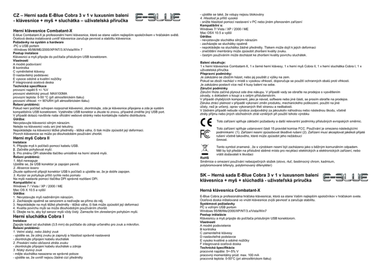 CZ – Herní sada E-Blue Cobra 3 v 1 v luxusním balení - klávesnice + myš + sluchátka – uživatelská příručka Herní klávesnice Combatant-X E-blue Combatant-X je profesionální herní klávesnice, která se stane vašim nejlepším společníkem v hráčském světě. Ocelová deska instalovaná uvnitř klávesnice zaručuje pevnost a stabilitu klávesnice. Požadavky na systém a hardware -PC s USB portem -Windows 95/98/ME/2000/XP/NT/3.X/Vista/Win 7 Postup instalace Klávesnici a myš připojte do počítače příslušným USB konektorem. Vlastnosti A modré podsvícení B kontrolka C vyměnitelné klávesy D nastavitelný podstavec E vysoce odolné a kvalitní nožičky F integrovaná ocelová deska Technická specifikace provozní napětí:5 +/- %V provozní elektrický proud: MAX100MA provozní teplota: 0-50 °C (při atmosférickém tlaku) provozní vlhkost: <= 90%RH (při atmosférickém tlaku) Řešení problémů: Pokud není počítač schopen rozpoznat klávesnici, zkontrolujte, zda je klávesnice připojena a zda je systém kompatibilnís USB konektorem. Vytáhněte USB konektor a zkuste to znovu, případně změňte jiný USB port. V případě dotazů navštivte naše oficiální webové stránky nebo kontaktujte našeho distributora. Údržba: Nevystavujte klávesnici silným nárazům. Nelejte na klávesnici vodu ani jiné tekutiny. Nepokládejte na klávesnici těžké předměty - těžká váha, či tlak může způsobit její deformaci. Povrch klávesnice se může po dlouhodobém používání zhoršit. Herní myš Cobra II Instalace 1. Připojte myš k počítači pomocí kabelu USB. 2. Začněte pohybovat myší. 3. Pro změnu DPI stiskněte tlačítko umístěné na horní straně myši. Řešení problémů: 1. Myš nereaguje Ujistěte se, že USB konektor je zapojen pevně. 2. Absence laseru Zkuste opětovně připojit konektor USB k počítači a ujistěte se, že je dobře zapojen. 3. Kurzor se pohybuje příliš rychle nebo pomalu Na myši nastavte pomocí tlačítka DPI správné rozlišení DPI. Kompatibilní s: Windows 7 / Vista / XP / 2000 / ME Mac OS X 10.5 a vyšší Údržba: 1. Nevystavujte myš nadměrným nárazům. 2. Zacházejte opatrně se senzorem a nedívejte se přímo do něj. 3. Nepokládejte na myš těžké předměty - těžká váha, či tlak může způsobit její deformaci 4. Kvalita povrchu myši se může dlouhodobým používáním zhoršit. 5. Dbejte na to, aby byl senzor myši vždy čistý. Zamezíte tím zkresleným pohybům myši. Herní sluchátka Cobra I Instalace Zapojte kabel od sluchátek (3,5 mm) do počítače do zdroje určeného pro zvuk a mikrofon. Řešení problémů: 1. Velmi slabý, nebo žádný zvuk - ujistěte se, že zdroj zvuku je zapnutý a hlasitost správně nastavená - zkontrolujte připojení kabelu sluchátek 2. Praskání nebo občasná ztráta zvuku - zkontrolujte připojení kabelu sluchátek u zdroje 3. Nízký dunivý zvuk - mějte sluchátka nasazena ve správné poloze - ujistěte se, že uvnitř nejsou žádné cizí předměty - ujistěte se také, že vstupy nejsou blokovány 4. Hlasitost je příliš vysoká - snižte hlasitost pomocí nastavení v PC nebo jiném přenosném zařízení Kompatibilní s: Windows 7/ Vista / XP / 2000 / ME Mac OSX 10.5 a vyšší Údržba: - nevystavujte sluchátka silným nárazům - zacházejte se sluchátky opatrně - nepokládejte na sluchátka žádné předměty. Tlakem může dojít k jejich deformaci - znečištění membrány může způsobit zhoršení kvality zvuku. - častým používáním může docházet ke zhoršení kvality povrchu sluchátek . Balení obsahuje: 1 x herní klávesnice Combatant-X, 1 x černé herní klávesy, 1 x herní myš Cobra II, 1 x herní sluchátka Cobra I, 1 x uživatelská příručka Přepravní podmínky: Je zakázáno se zbožím házet, nebo jej pouštět z výšky na zem. Pokud se zboží nachází v místě s vysokou vlhkostí, doporučuje se použití ochranných obalů proti vlhkosti. Je zakázáno postavit více než 4 kusy balení na sebe. Záruční podmínky Záruční lhůta začíná plynout ode dne nákupu. V případě vady se obraťte na prodejce s vysvětlením závady, s dokladem o koupi a s celým příslušenstvím. V případě chybějících komponent, jako je návod, software nebo jiné části, se prosím obraťte na prodejce. Záruka ztrácí platnost v případě vykonaní změn produktu, mechanického poškození, použití na jiné účely, než je určený, oprav vykonaných třetí stranou a nedbalosti. V žádném případě nebude výrobce zodpovědný za jakoukoliv náhodnou nebo následnou škodu, včetně ztráty příjmu nebo jiných obchodních ztrát vzniklých při použití tohoto výrobku Toto zařízení splňuje základní požadavky a další relevantní podmínky příslušných evropských směrnic. Toto zařízení splňuje ustanovení části 15 pravidel komise FCC. Používání je omezeno následujícími podmínkami: (1). Zařízení nesmí způsobovat škodlivé rušení (2). Zařízení musí akceptovat jakékoli přijaté rušení včetně takového, které může způsobit jeho nežádoucí činnost. Tento symbol znamená , že s výrobkem nesmí být zacházeno jako s běžným komunálním odpadem. Měl by být předán na příslušné sběrné místo pro recyklaci elektrických a elektronických zařízení, nebo vrátit dodavateli k likvidaci RoHS Směrnice o omezení používání nebezpečných složek (olovo, rtuť, šestimocný chrom, kadmium, polybromované bifenyly, polybrmovaný difenyléter) SK – Herná sada E-Blue Cobra 3 v 1 v luxusnom balení klávesnica + myš + slúchadlá - užívateľská príručka Herná klávesnica Combatant-X E-Blue Cobra je profesionálna hráčska klávesnicai, ktorá sa stane Vašim najlepším spoločníkov v hráčskom svete. Oceľová doska inštalovaná vo vnútri klávesnice zvýši pevnosť a zaru